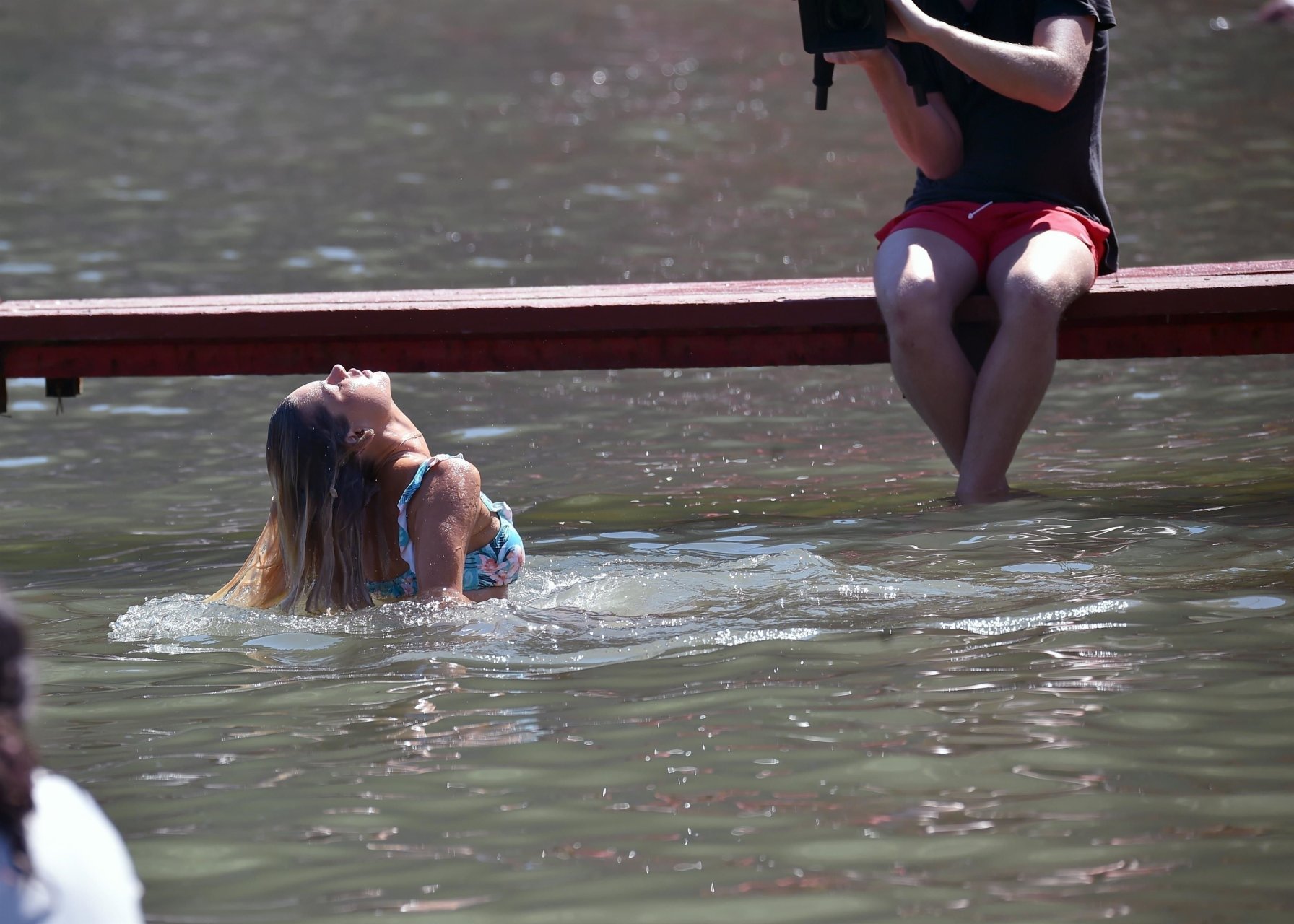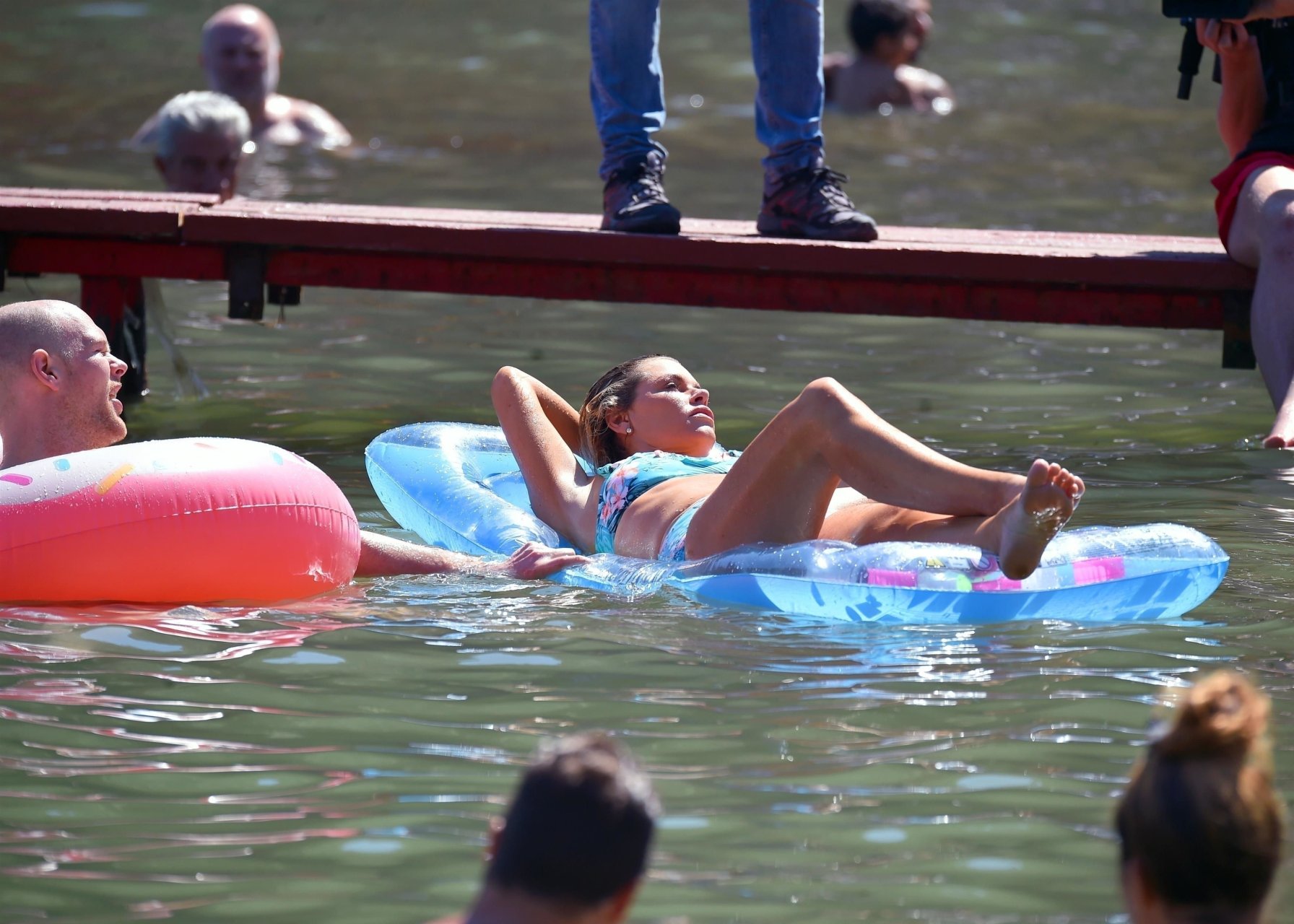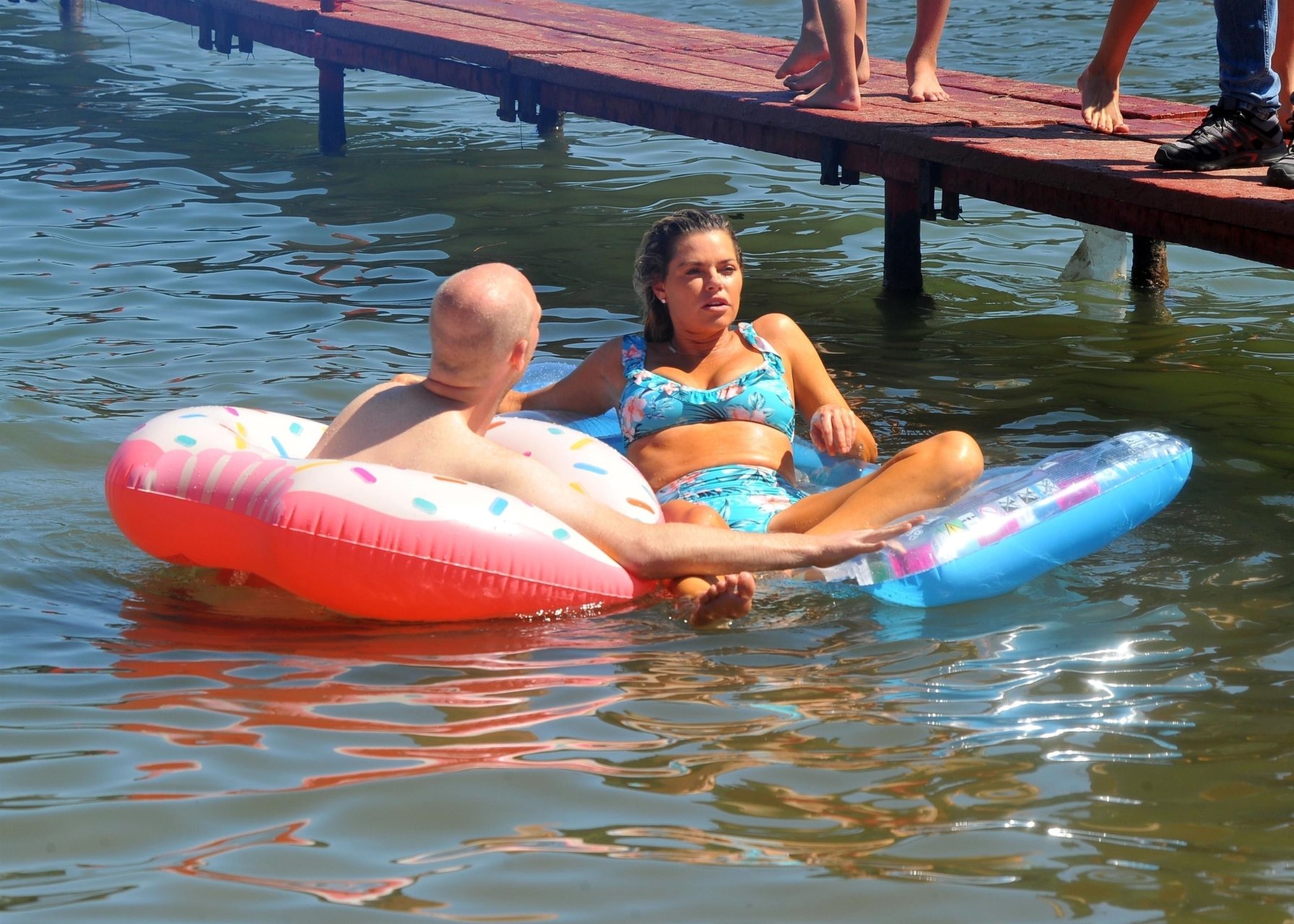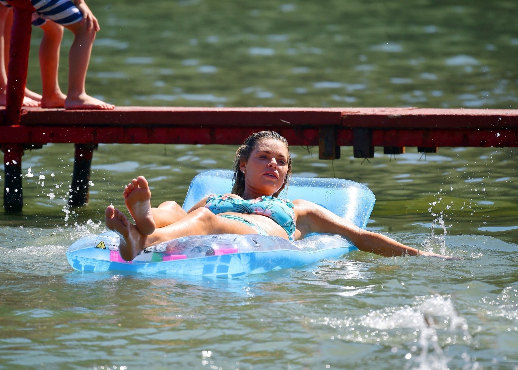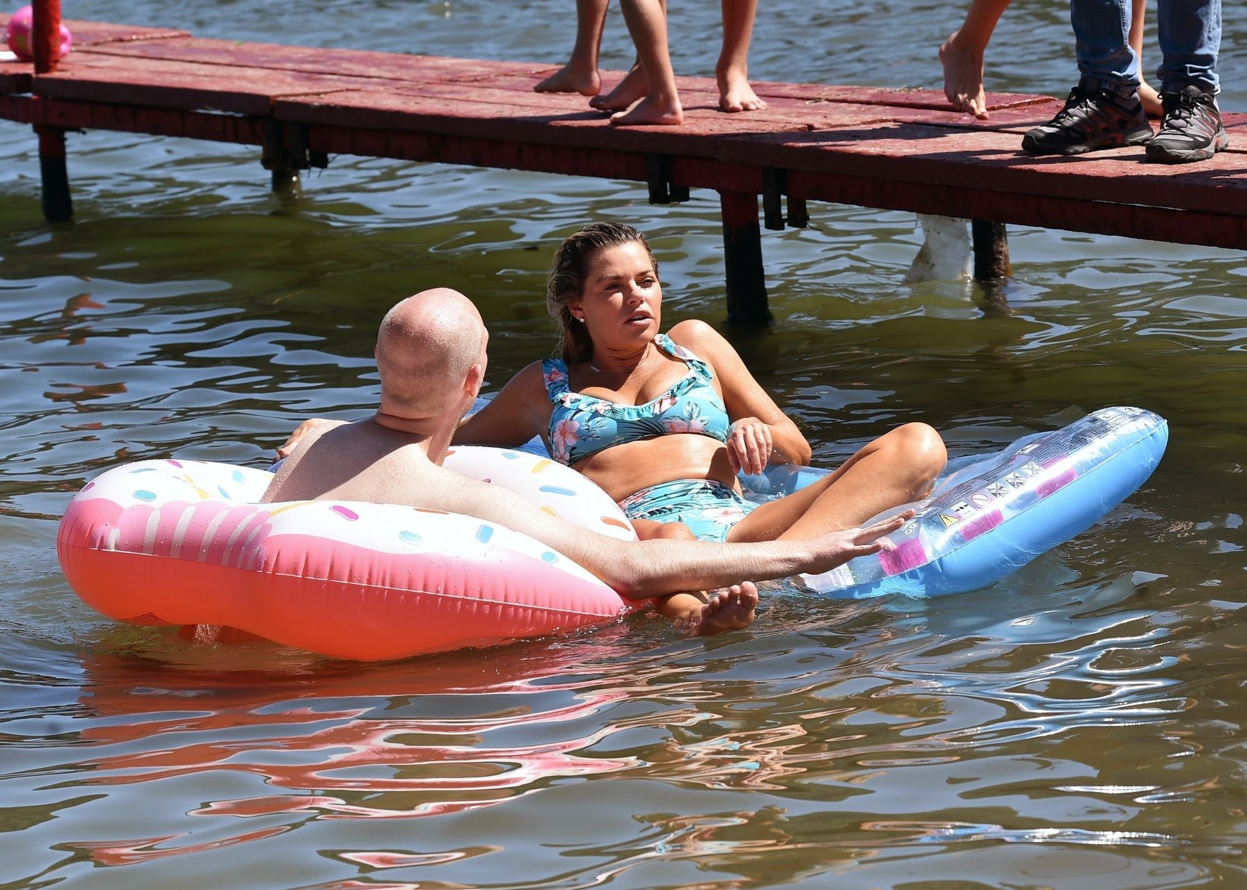 Sophie Monk a été photographiée avec un look cool dans un bikini bleu taille haute lors du tournage d’une émission de télévision avec Oscar Gordon sur la plage de Portofino, le 14/07/2018.