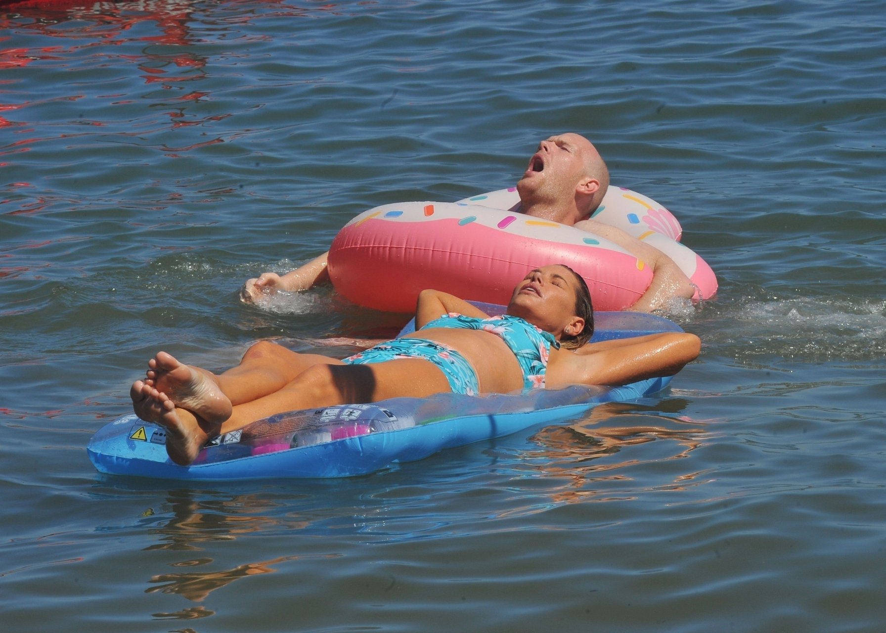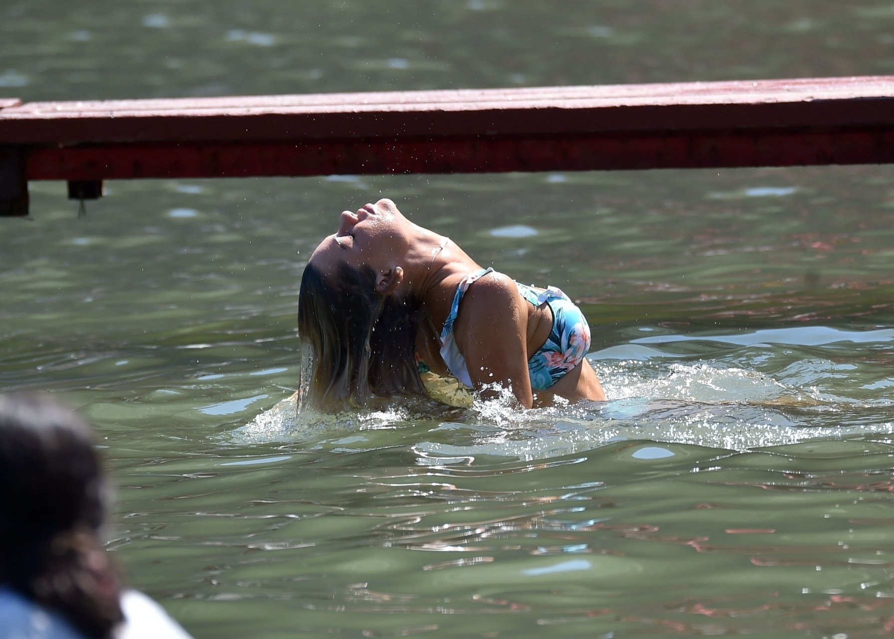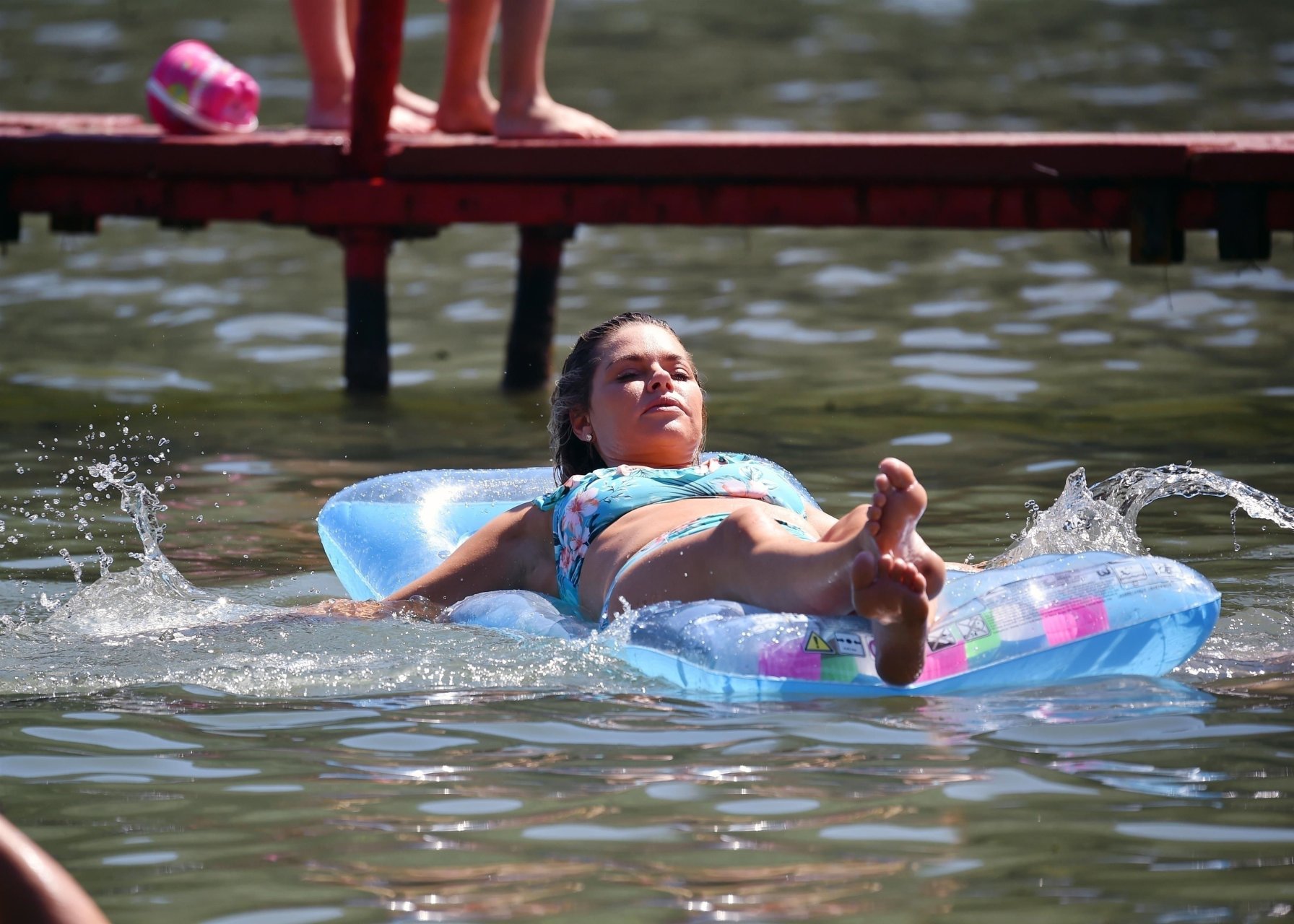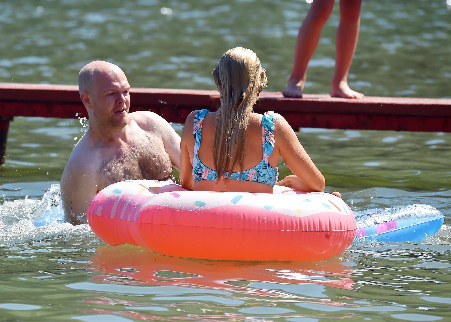 Sophie Monk a été photographiée avec un look cool dans un bikini bleu taille haute lors du tournage d’une émission de télévision avec Oscar Gordon sur la plage de Portofino, le 14/07/2018.