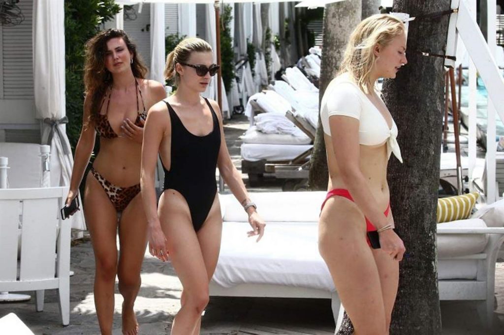 The new paparazzi summer catch is here! Sophie Turner’s bikini pics from the Delano Hotel pool are something you can’t see every day! Lucky you, Sophie Turner’s ass and tits you don’t want to see every day because they are disgusting and disappointing! Lady of Winterfell is so pale, has no ass, her tattoos are lame. The only good thing on her body is those nice firm tits and hard nipples under that improvised bikini!
