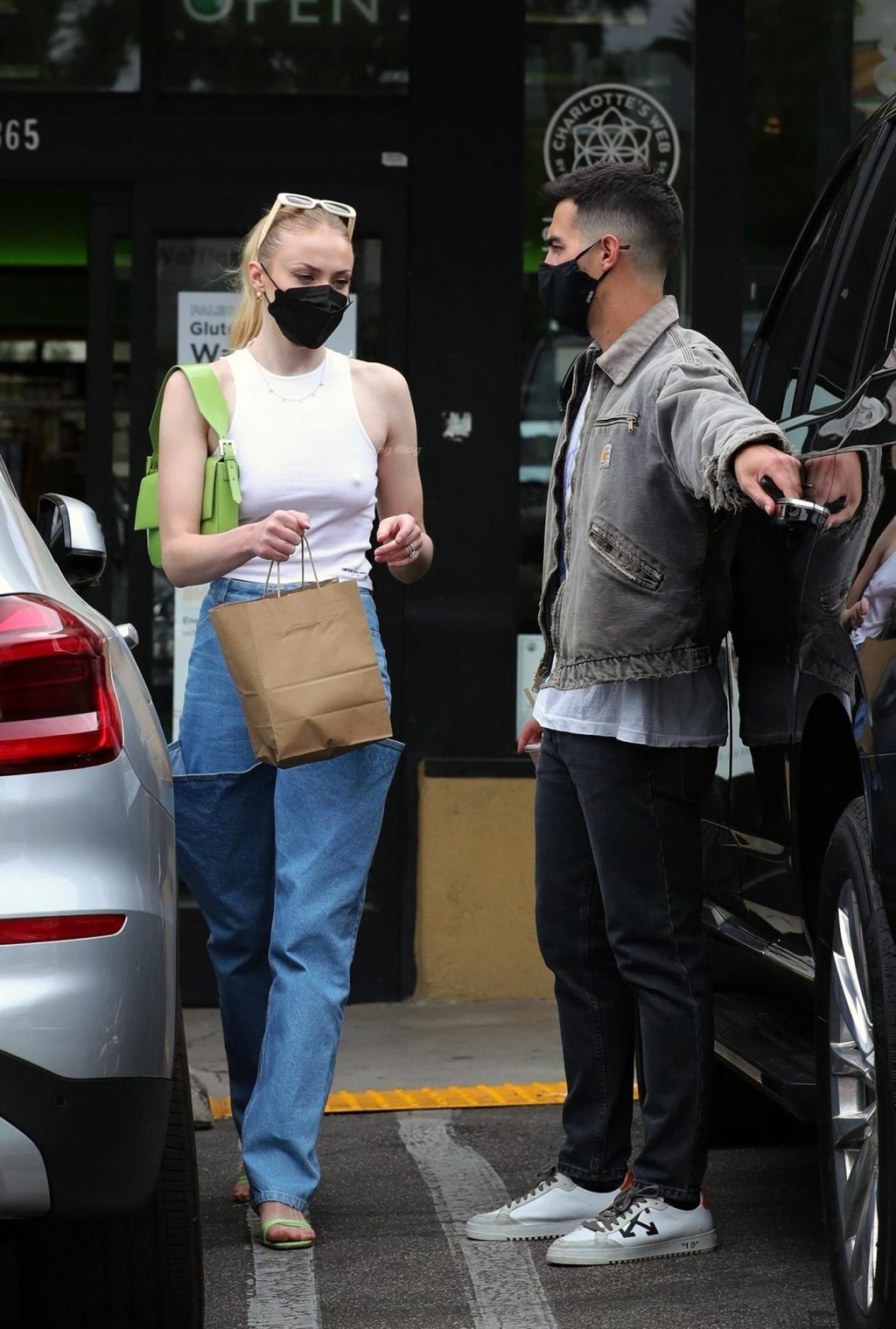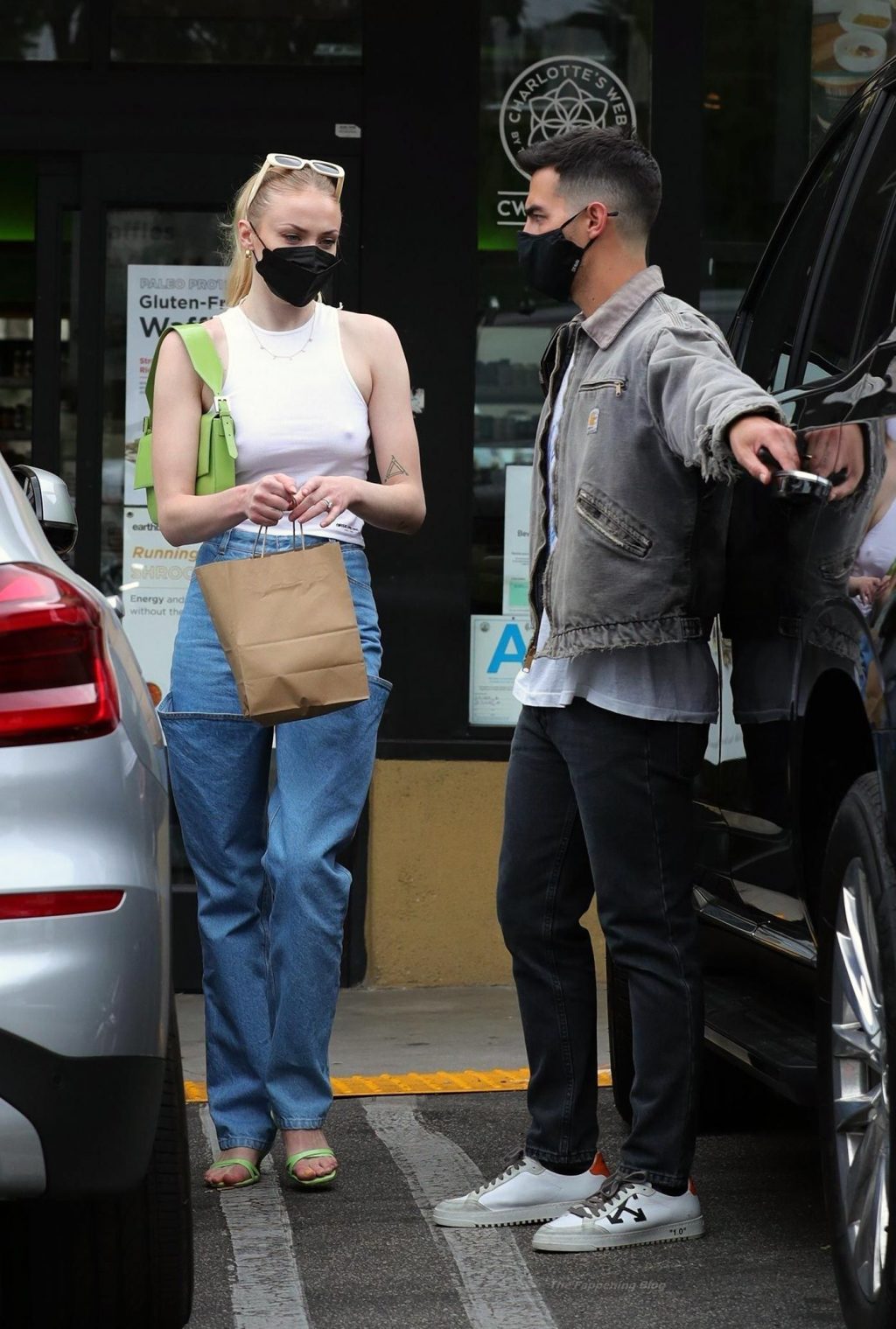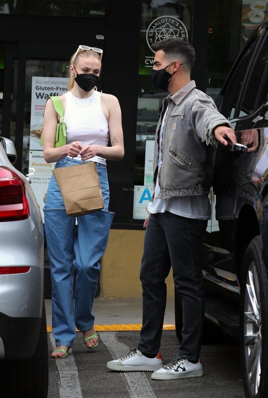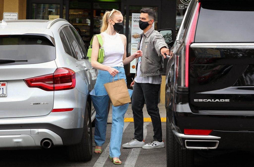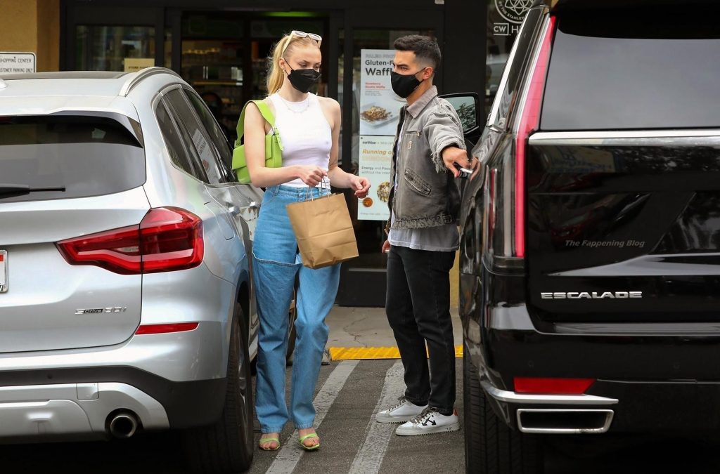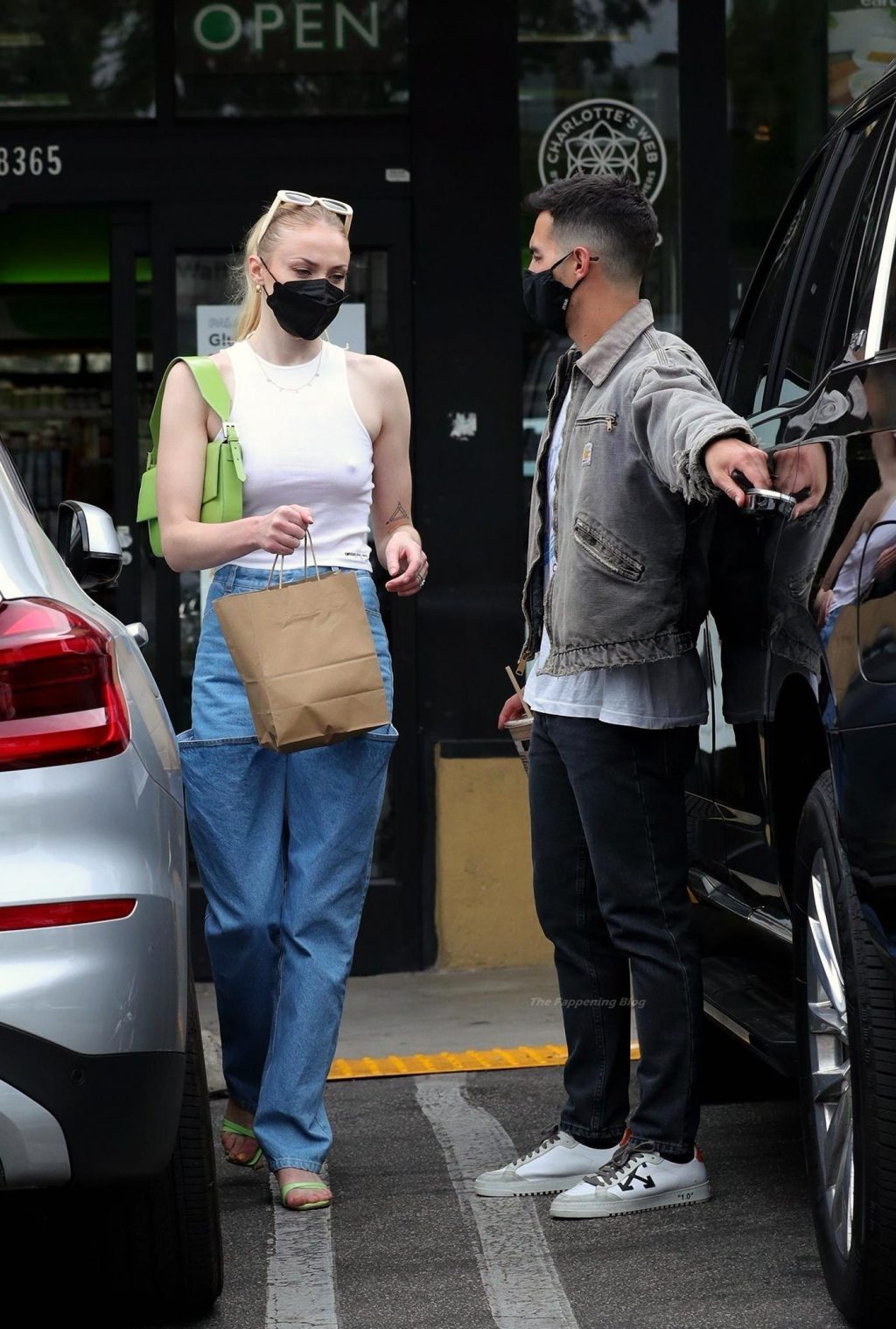 While out shopping with a pal, Joe Jonas gets the door for his wife Sophie Turner as they stop for juice at Earthbar in West Hollywood. These photos were taken a few days ago, and she looks lovely after giving birth! Sophie Turner’s tits were seen as she was not wearing a bra, and the shirt that she had on was more than see-through!