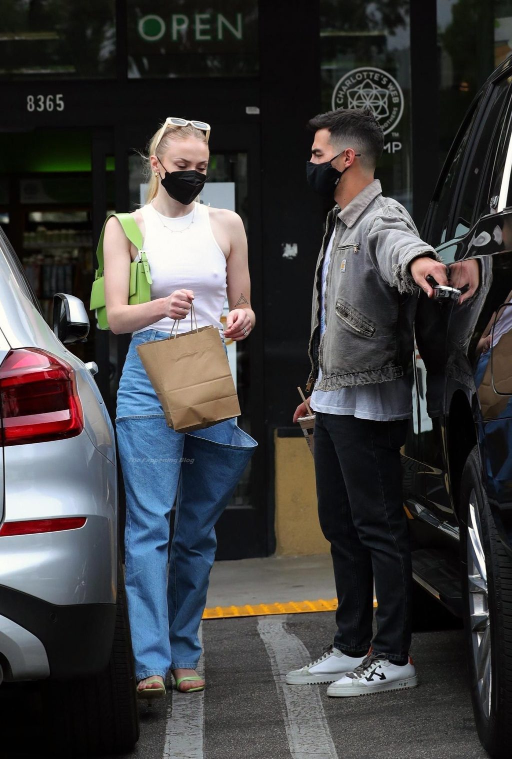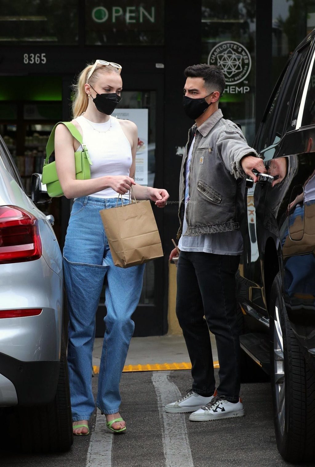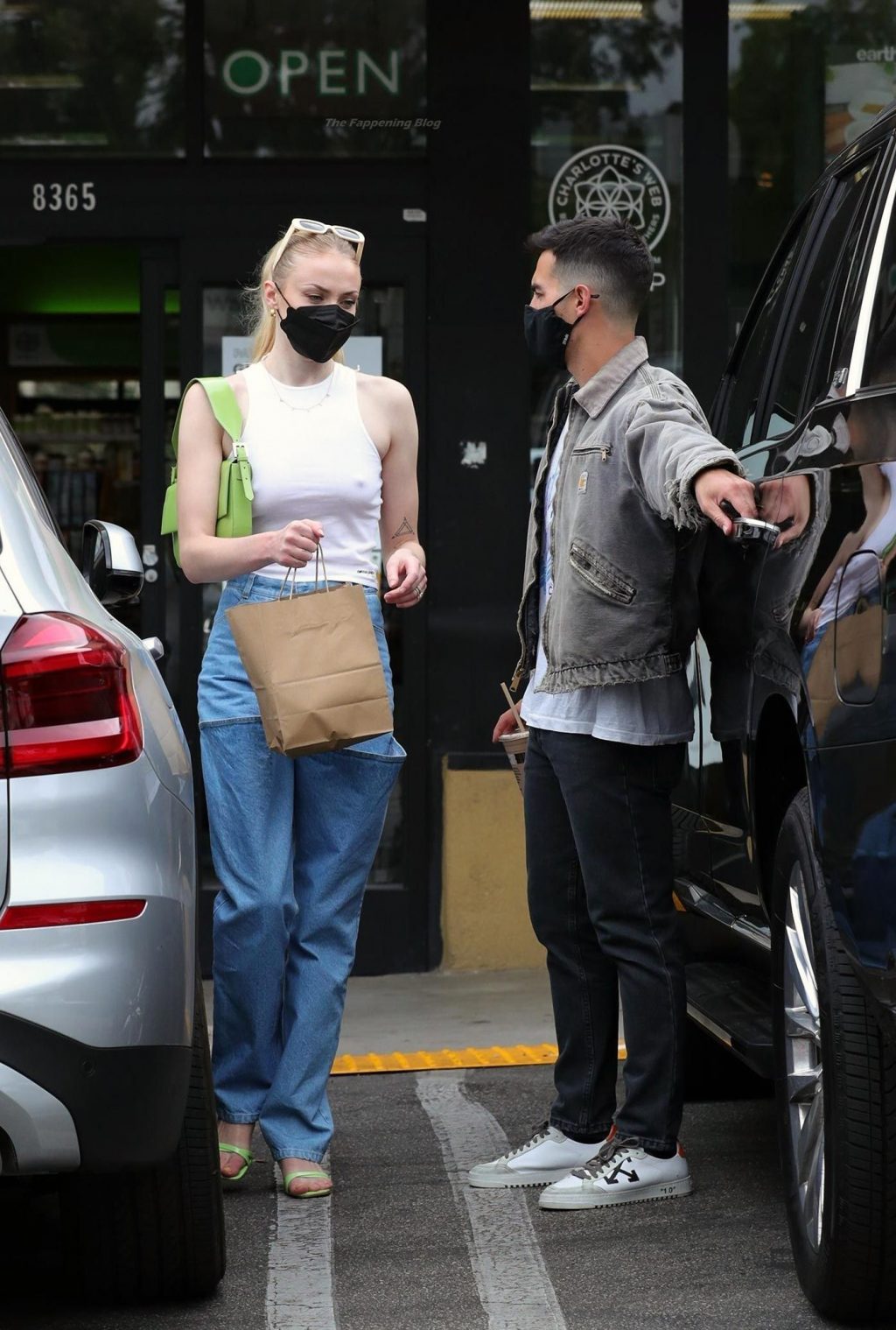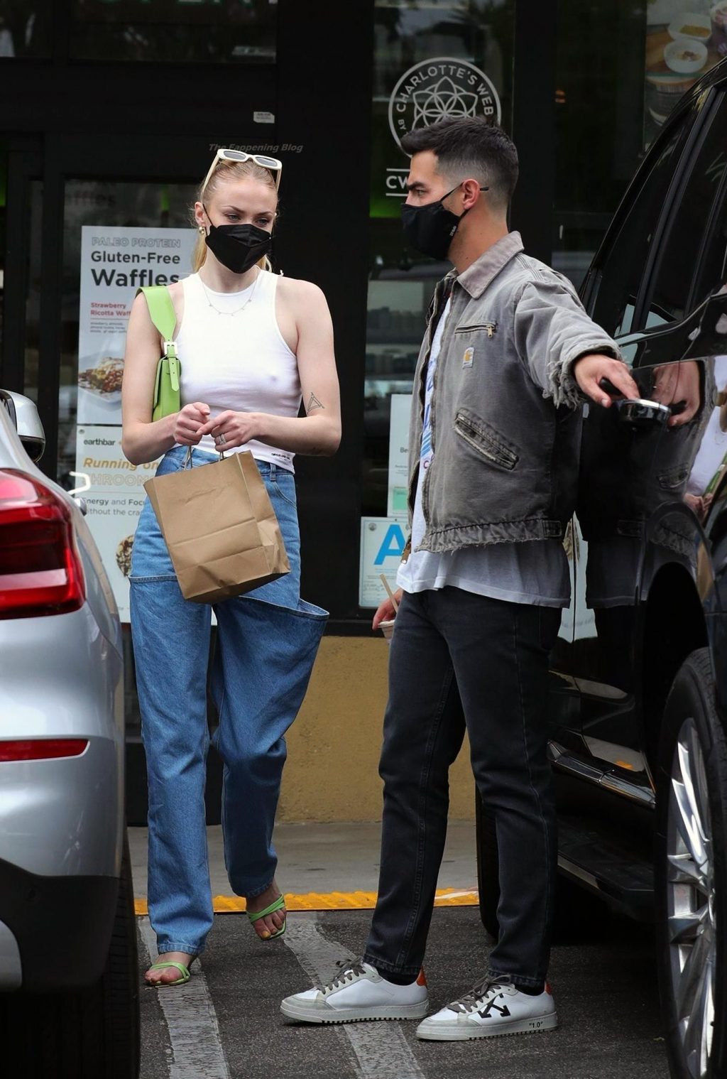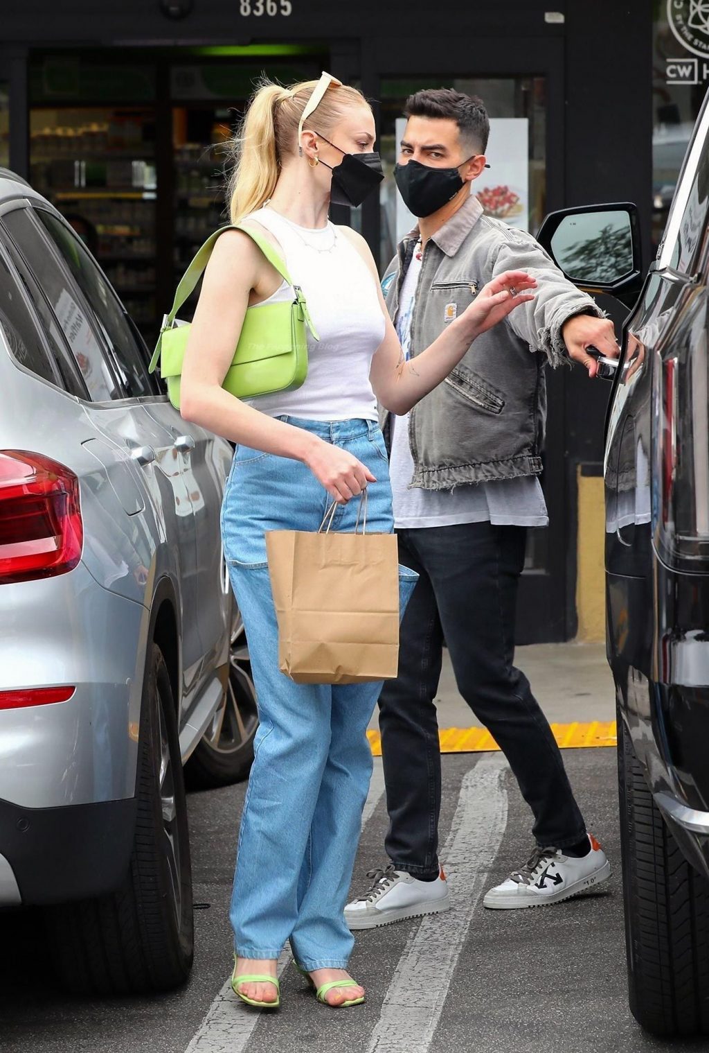 While out shopping with a pal, Joe Jonas gets the door for his wife Sophie Turner as they stop for juice at Earthbar in West Hollywood. These photos were taken a few days ago, and she looks lovely after giving birth! Sophie Turner’s tits were seen as she was not wearing a bra, and the shirt that she had on was more than see-through!