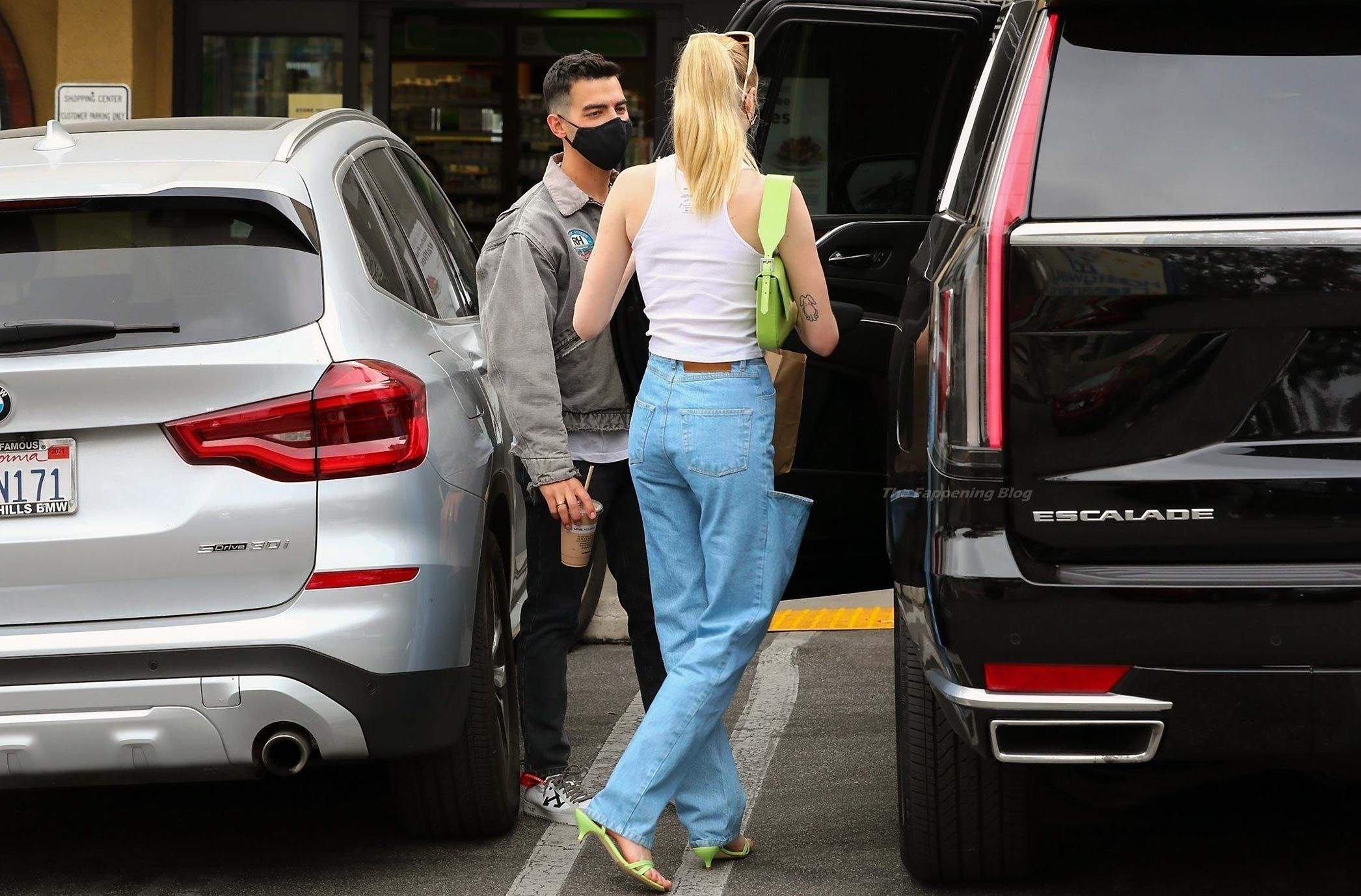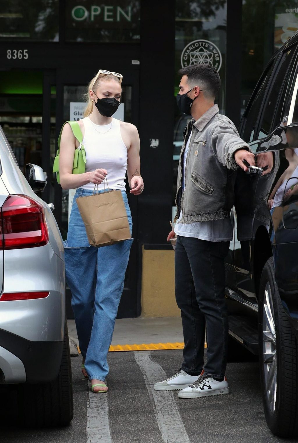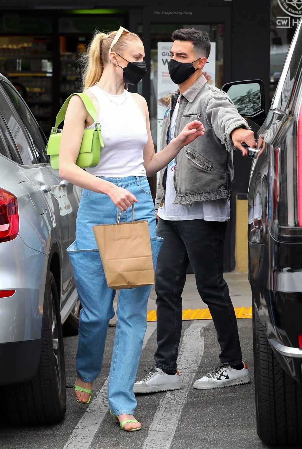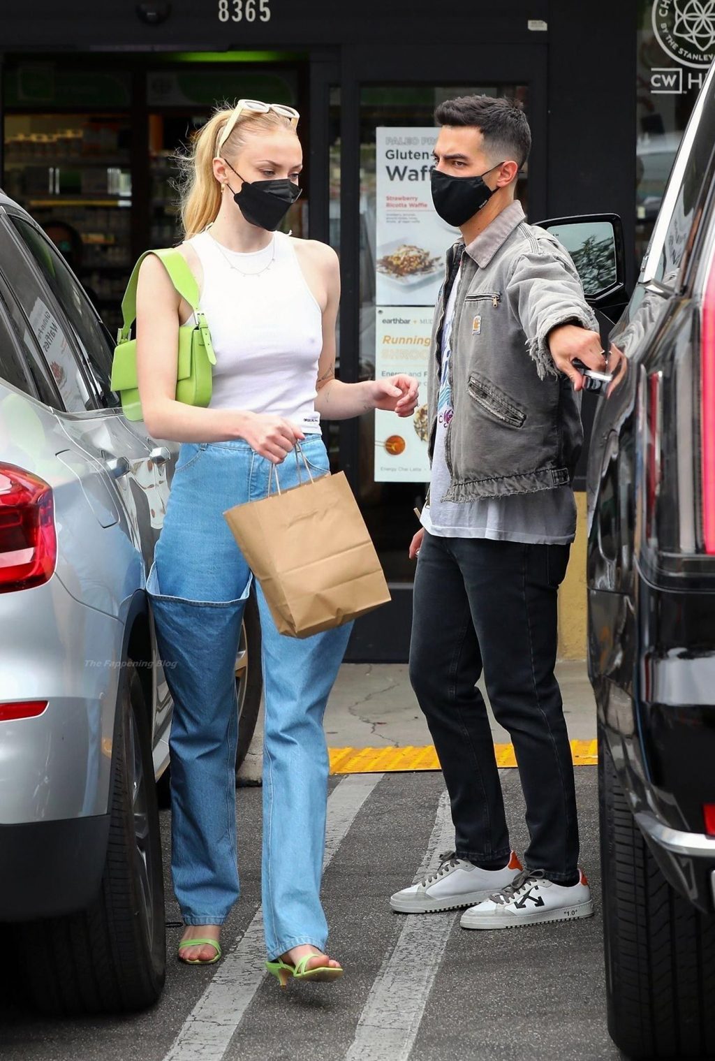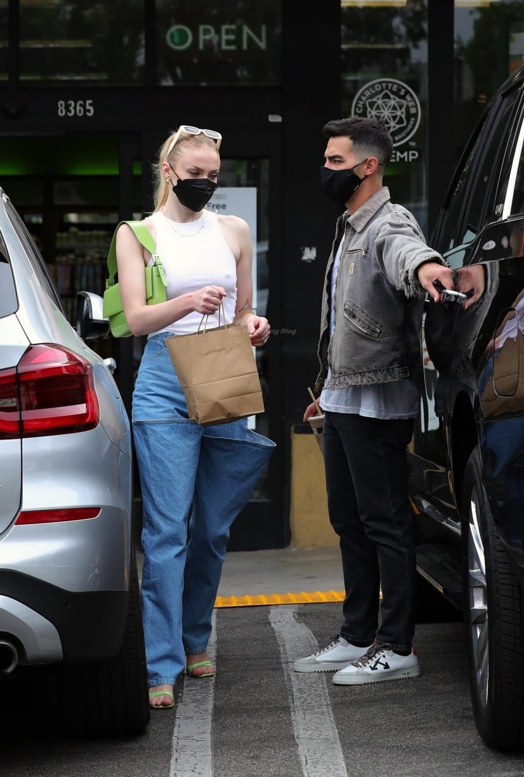 While out shopping with a pal, Joe Jonas gets the door for his wife Sophie Turner as they stop for juice at Earthbar in West Hollywood. These photos were taken a few days ago, and she looks lovely after giving birth! Sophie Turner’s tits were seen as she was not wearing a bra, and the shirt that she had on was more than see-through!