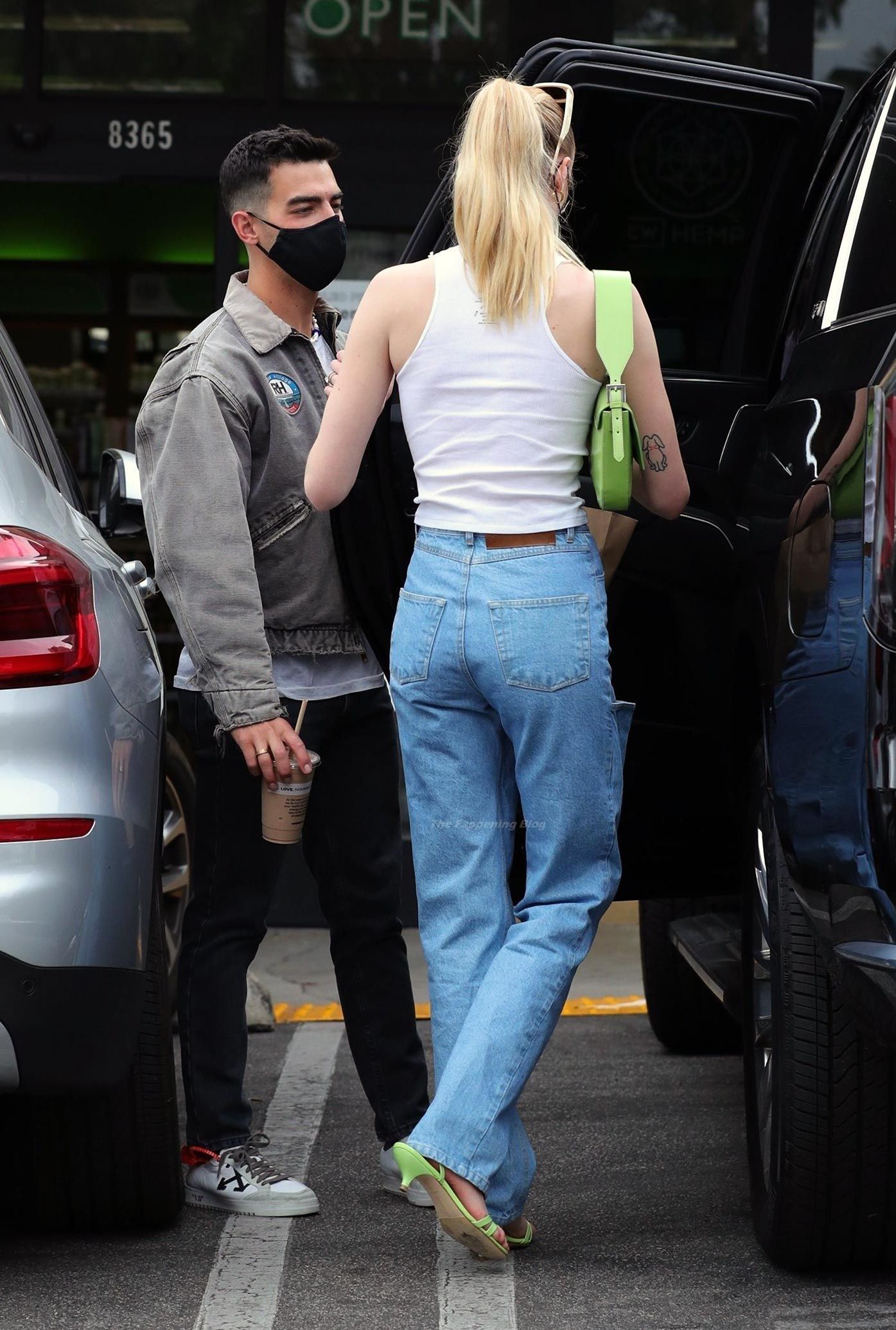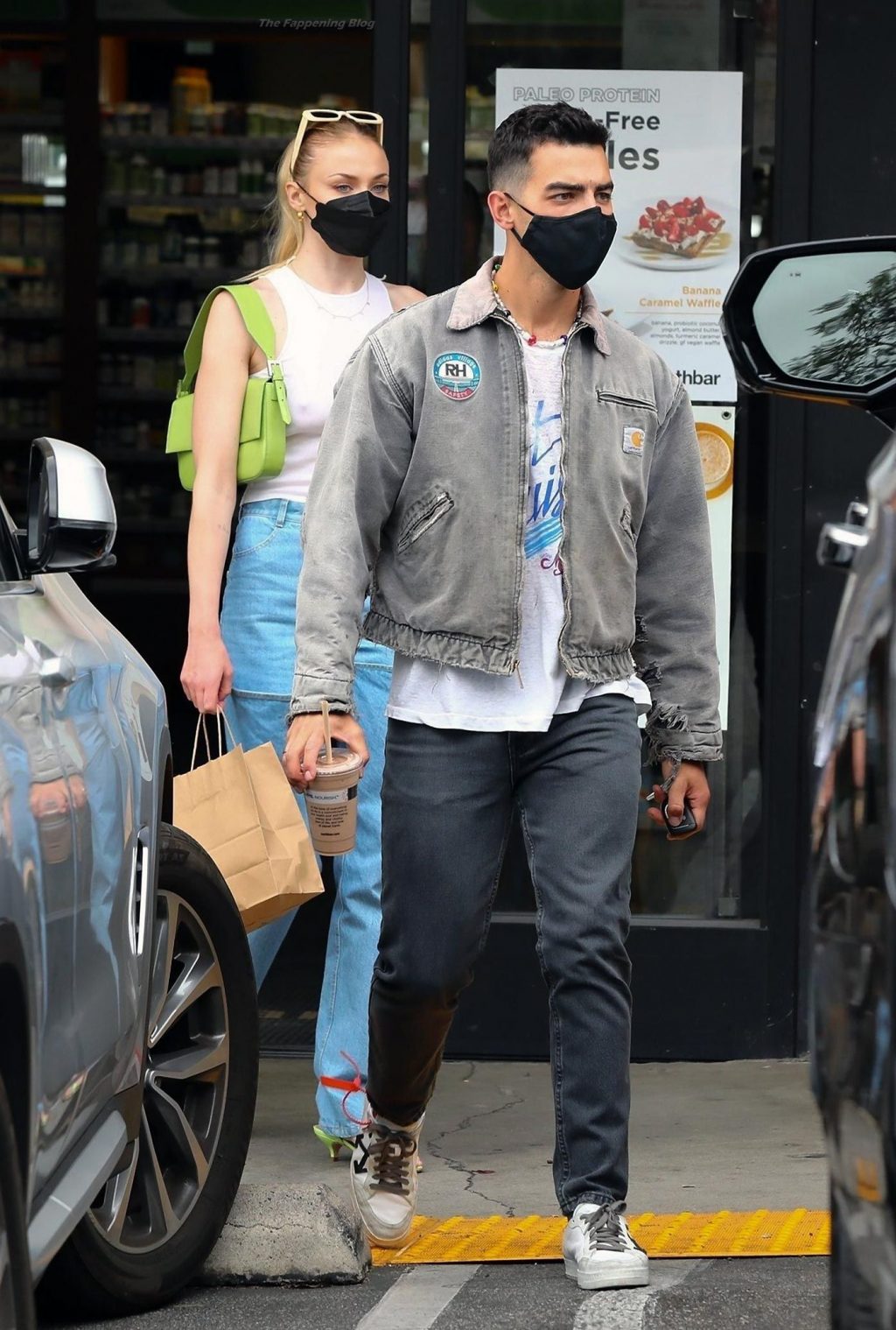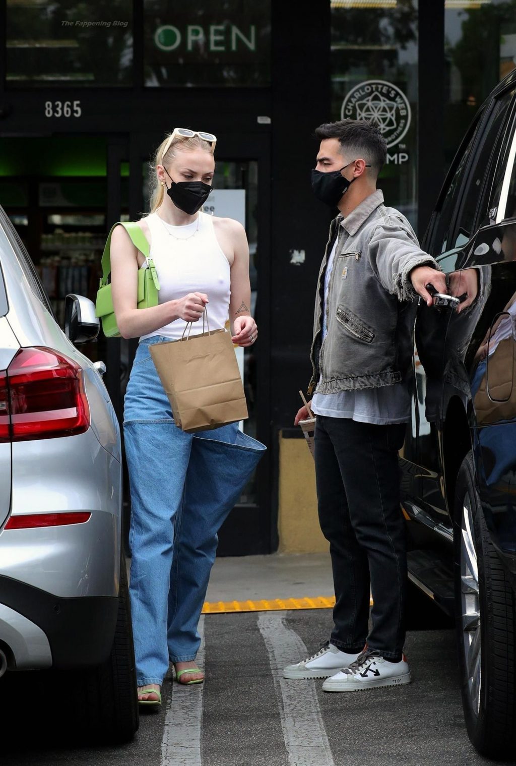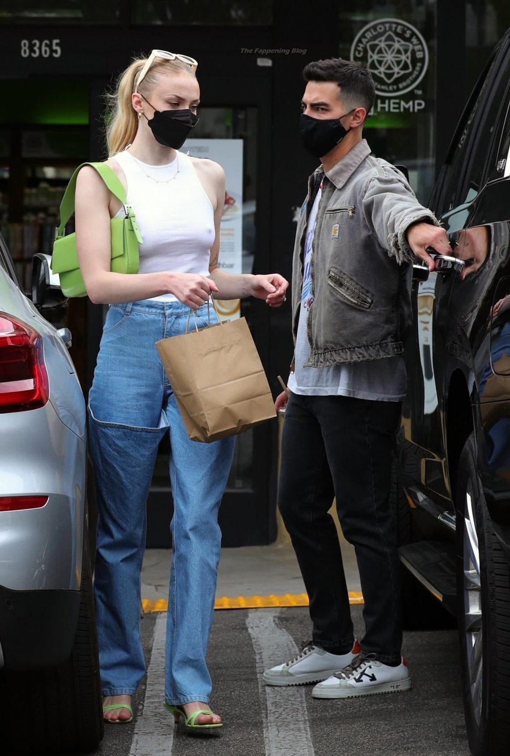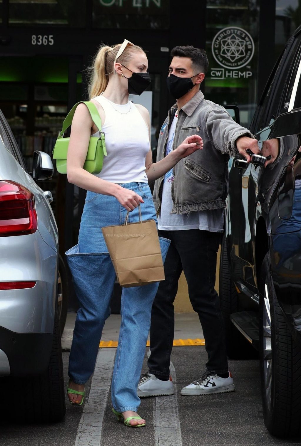 While out shopping with a pal, Joe Jonas gets the door for his wife Sophie Turner as they stop for juice at Earthbar in West Hollywood. These photos were taken a few days ago, and she looks lovely after giving birth! Sophie Turner’s tits were seen as she was not wearing a bra, and the shirt that she had on was more than see-through!