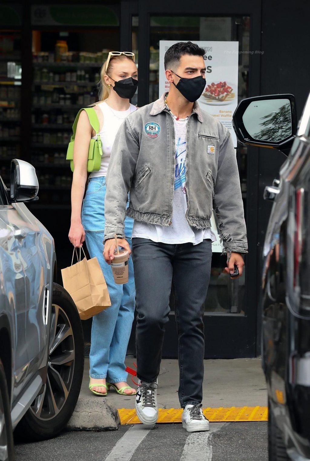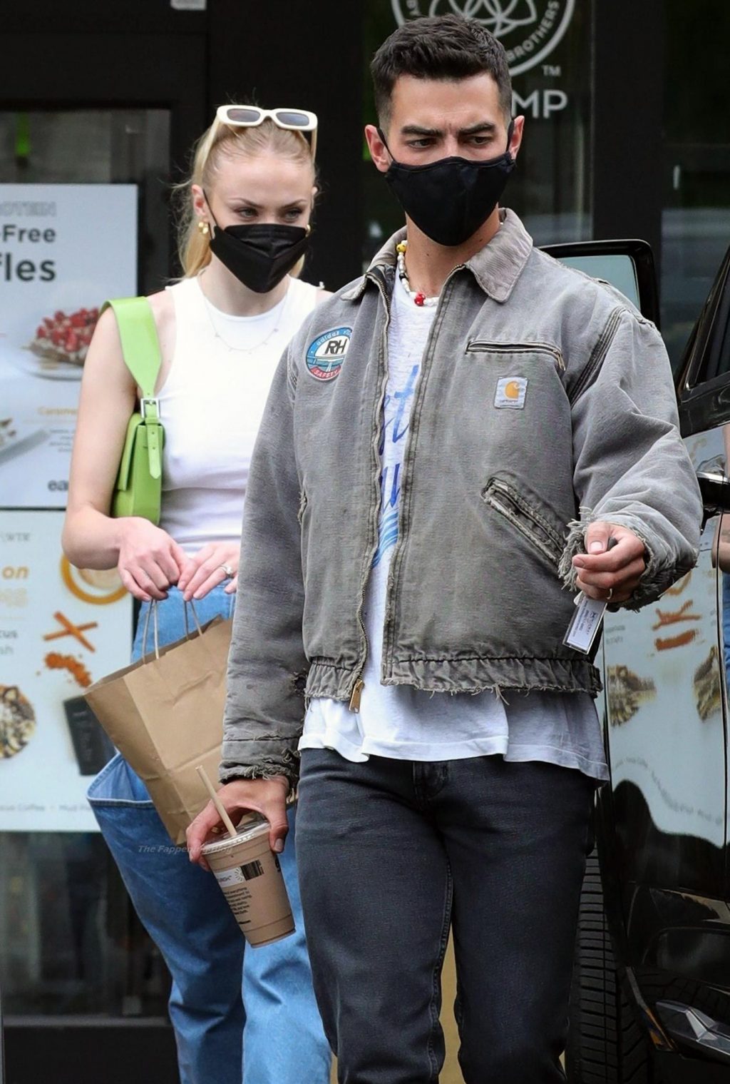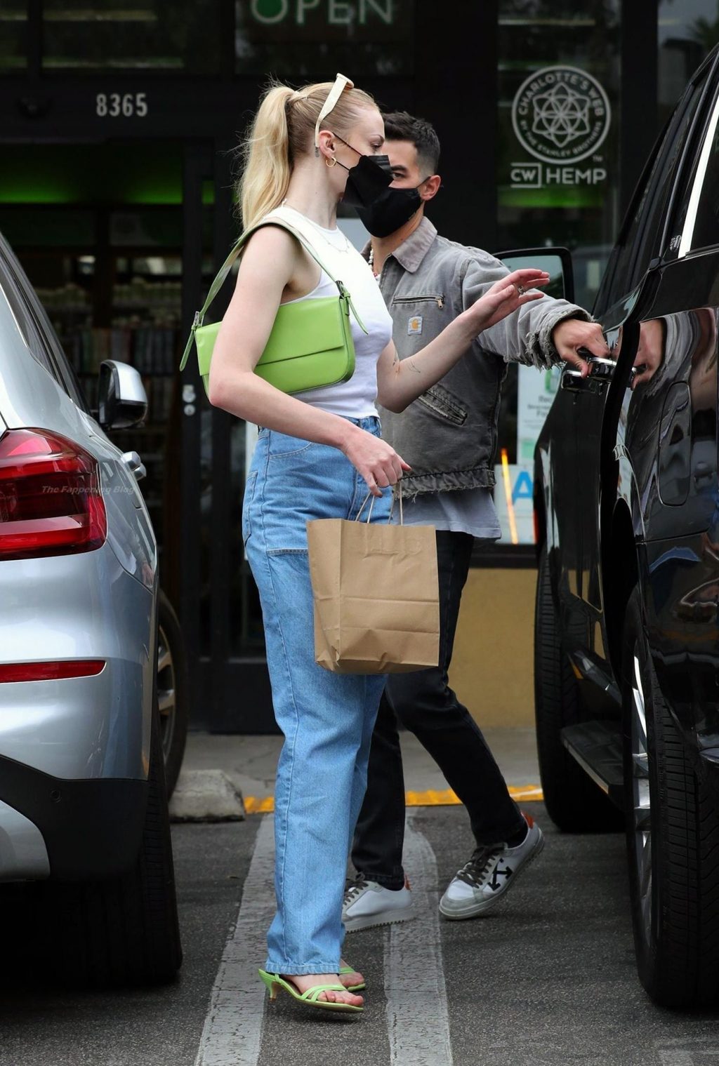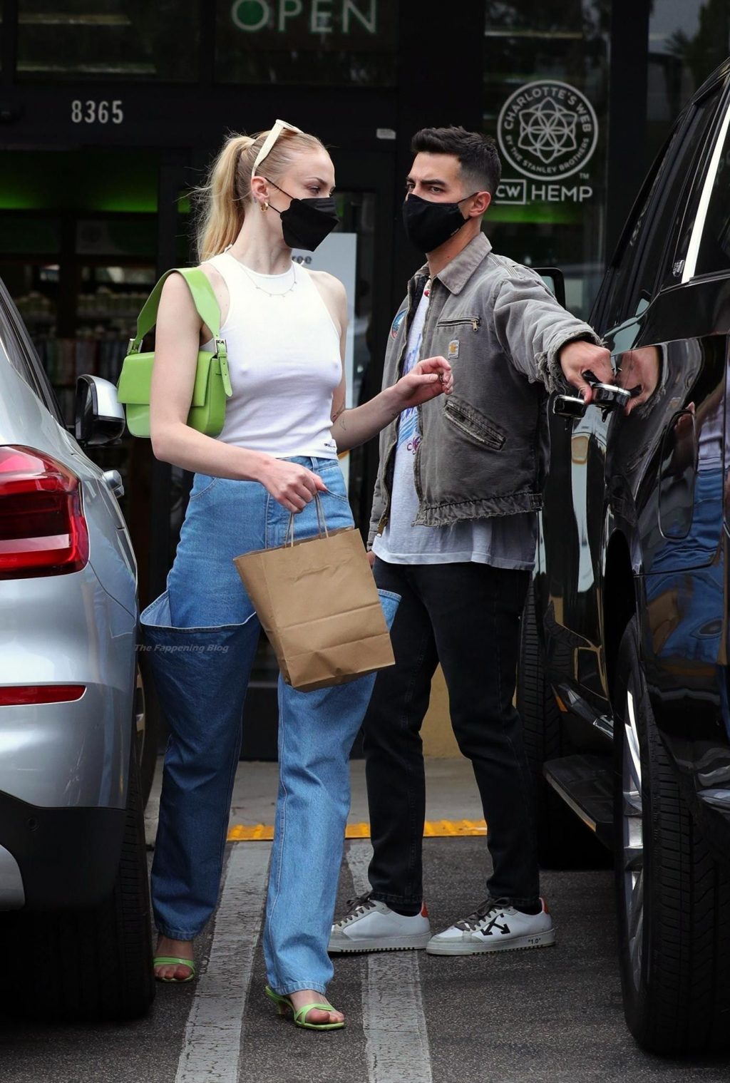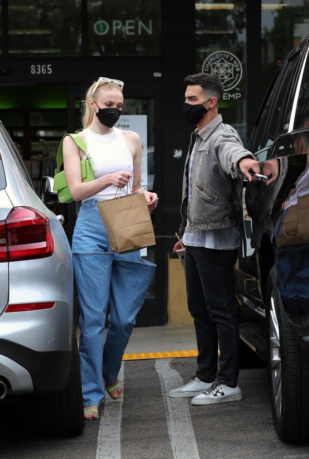 While out shopping with a pal, Joe Jonas gets the door for his wife Sophie Turner as they stop for juice at Earthbar in West Hollywood. These photos were taken a few days ago, and she looks lovely after giving birth! Sophie Turner’s tits were seen as she was not wearing a bra, and the shirt that she had on was more than see-through!