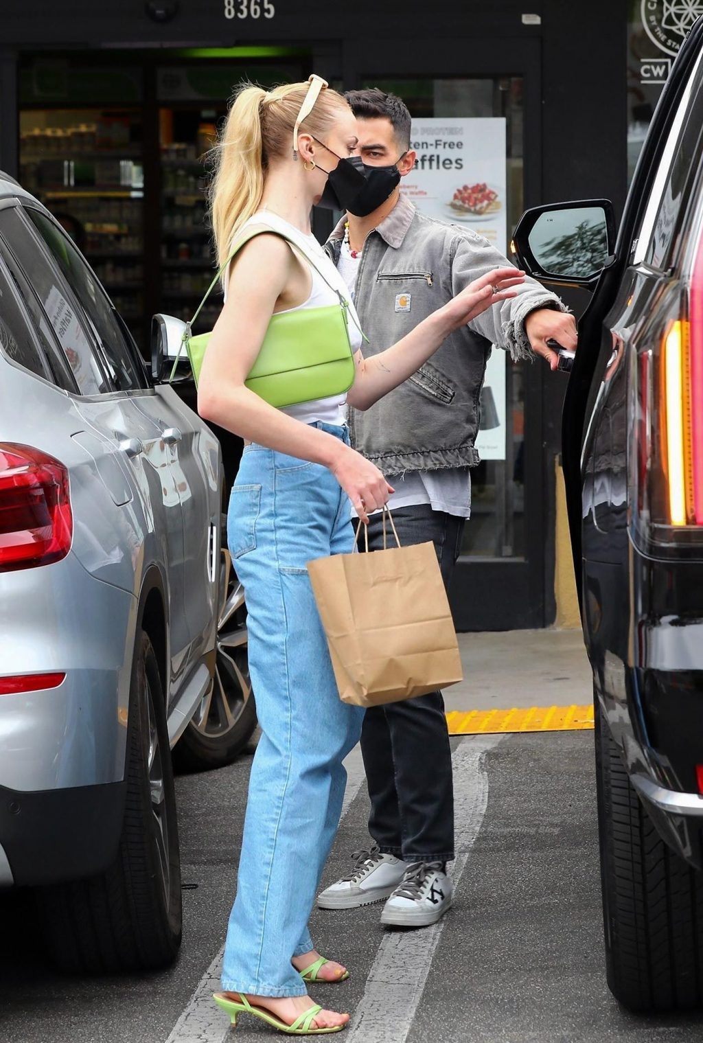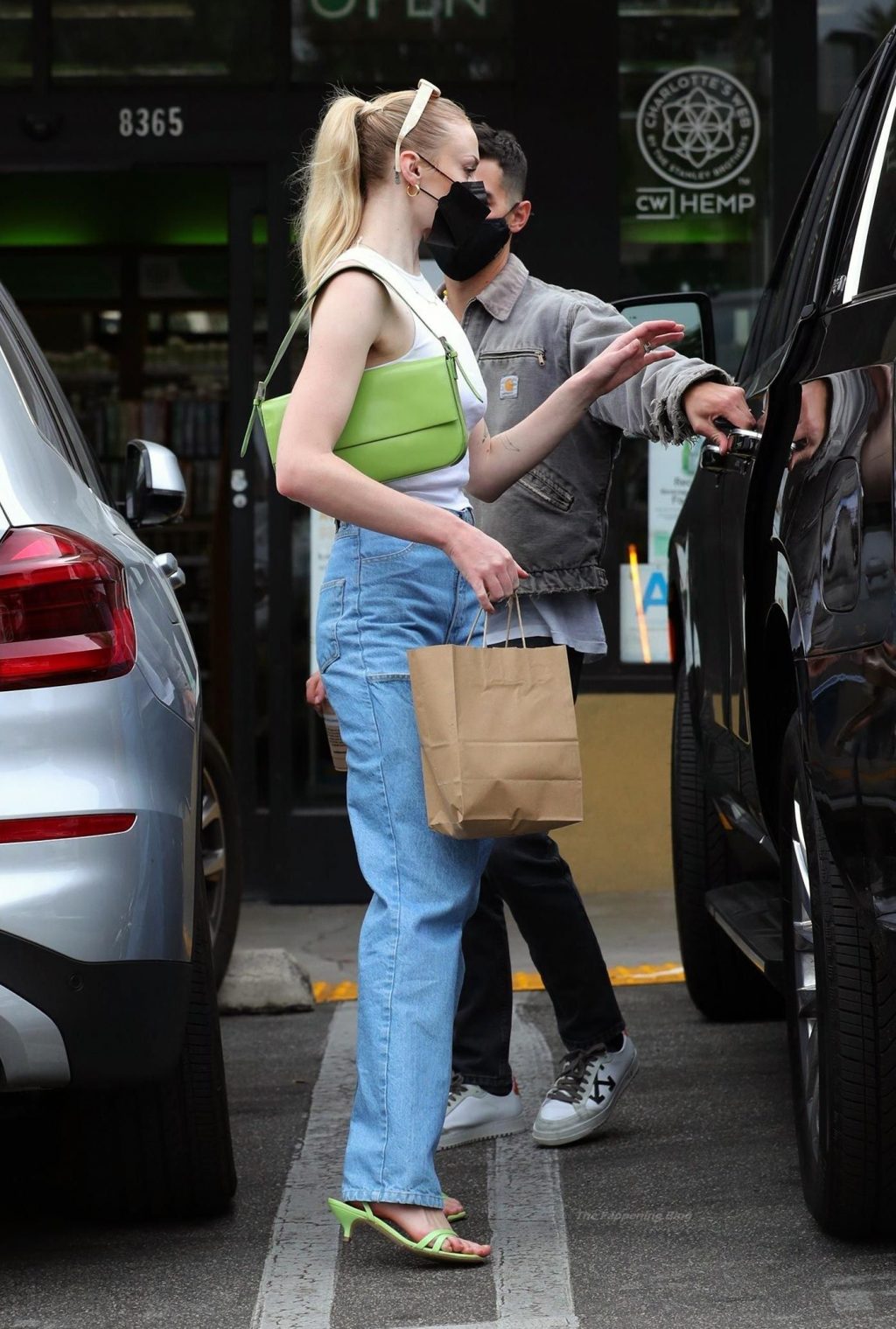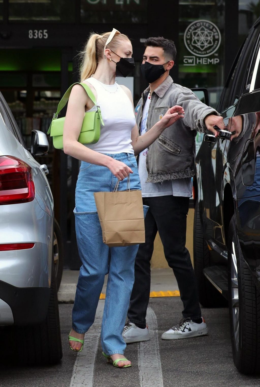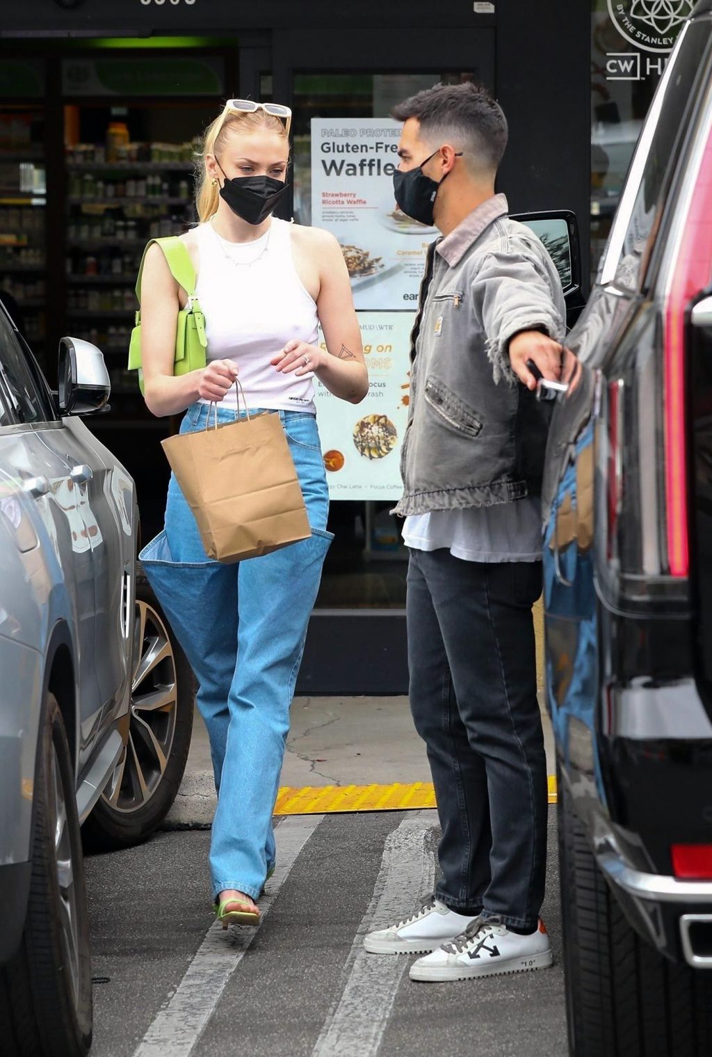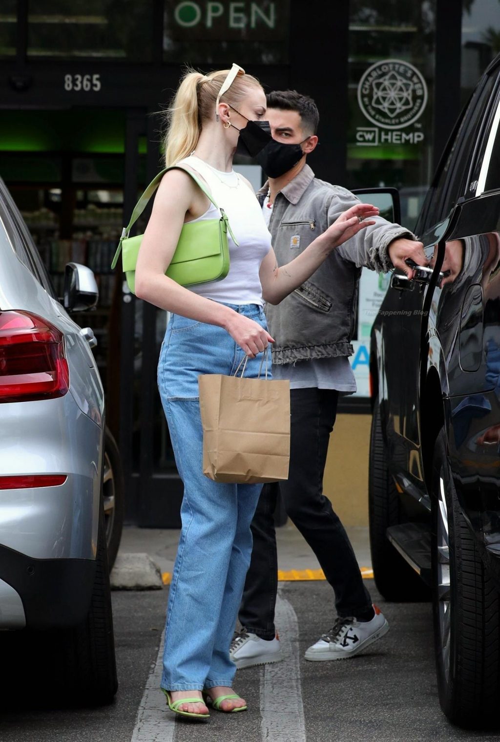 While out shopping with a pal, Joe Jonas gets the door for his wife Sophie Turner as they stop for juice at Earthbar in West Hollywood. These photos were taken a few days ago, and she looks lovely after giving birth! Sophie Turner’s tits were seen as she was not wearing a bra, and the shirt that she had on was more than see-through!