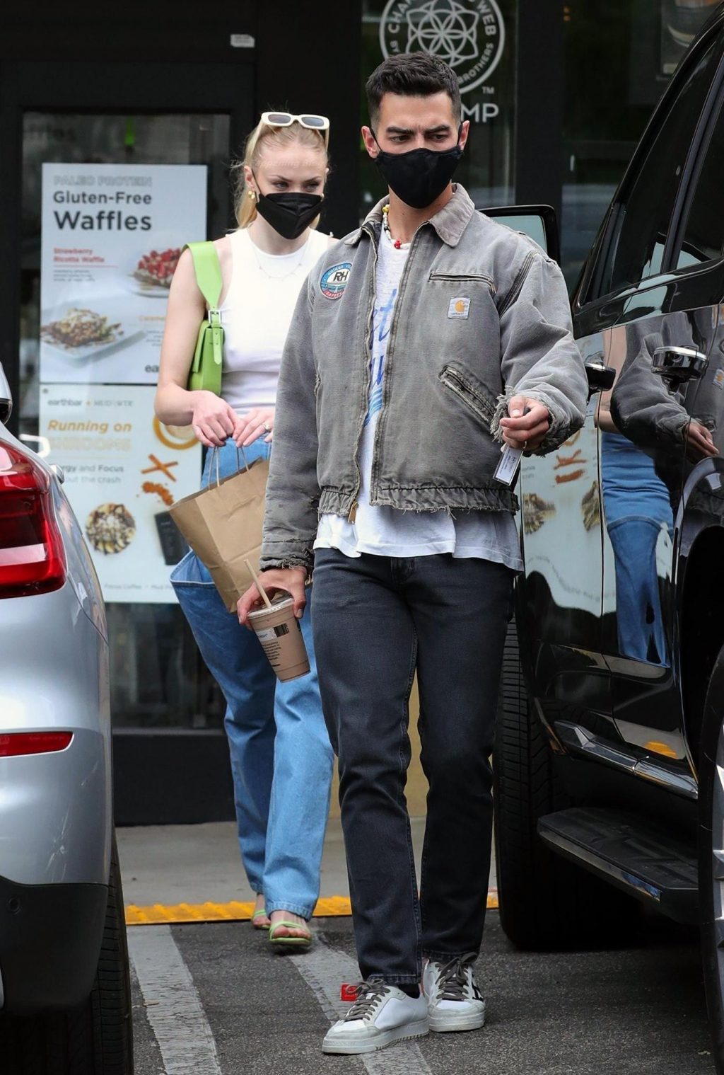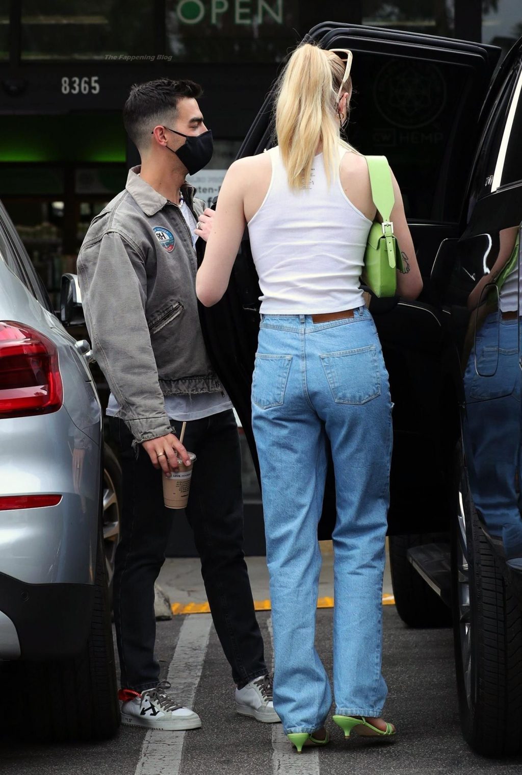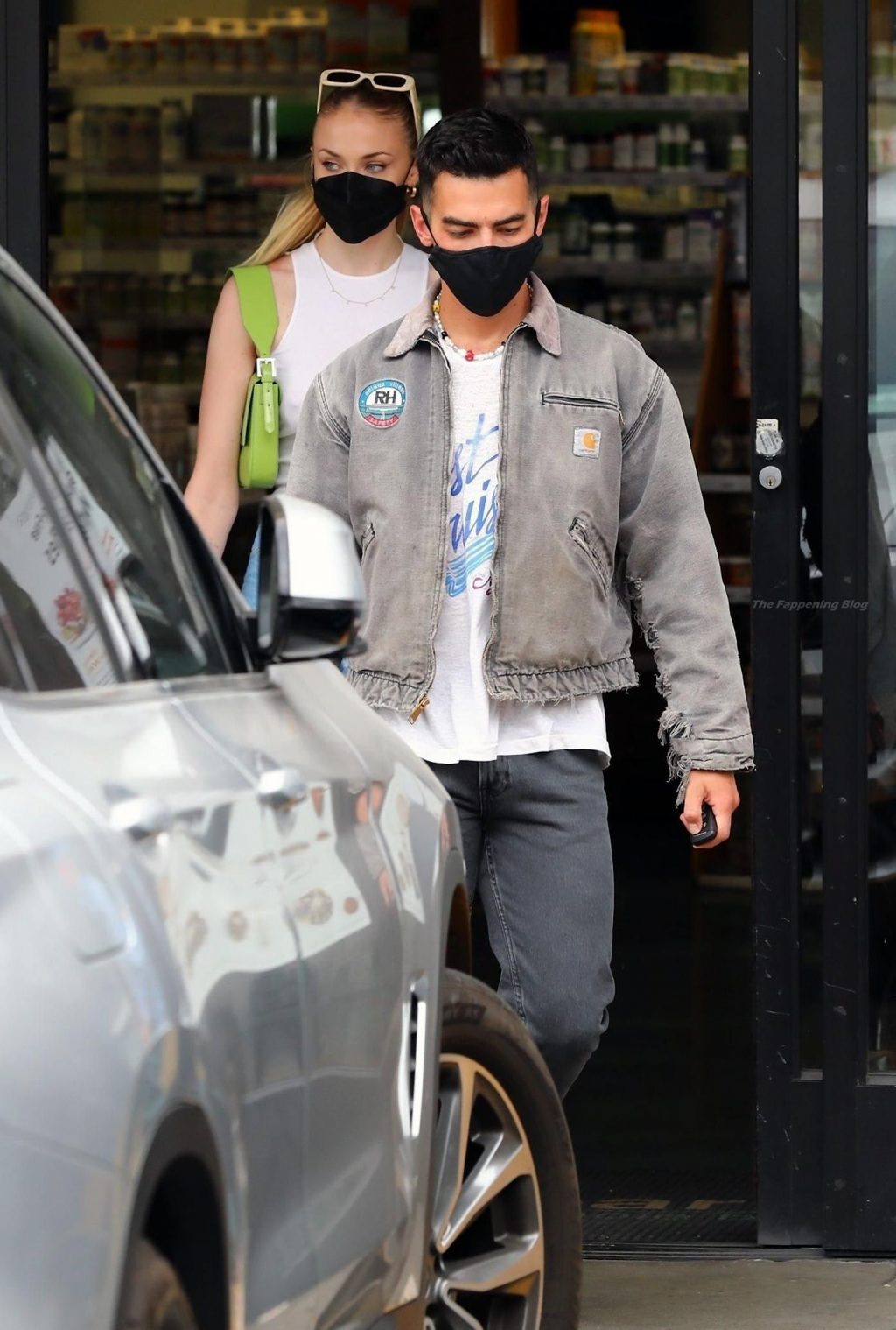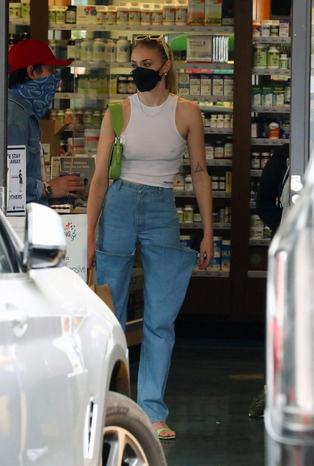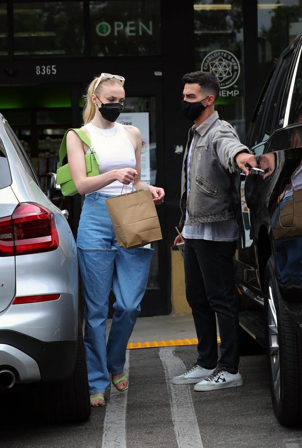 While out shopping with a pal, Joe Jonas gets the door for his wife Sophie Turner as they stop for juice at Earthbar in West Hollywood. These photos were taken a few days ago, and she looks lovely after giving birth! Sophie Turner’s tits were seen as she was not wearing a bra, and the shirt that she had on was more than see-through!