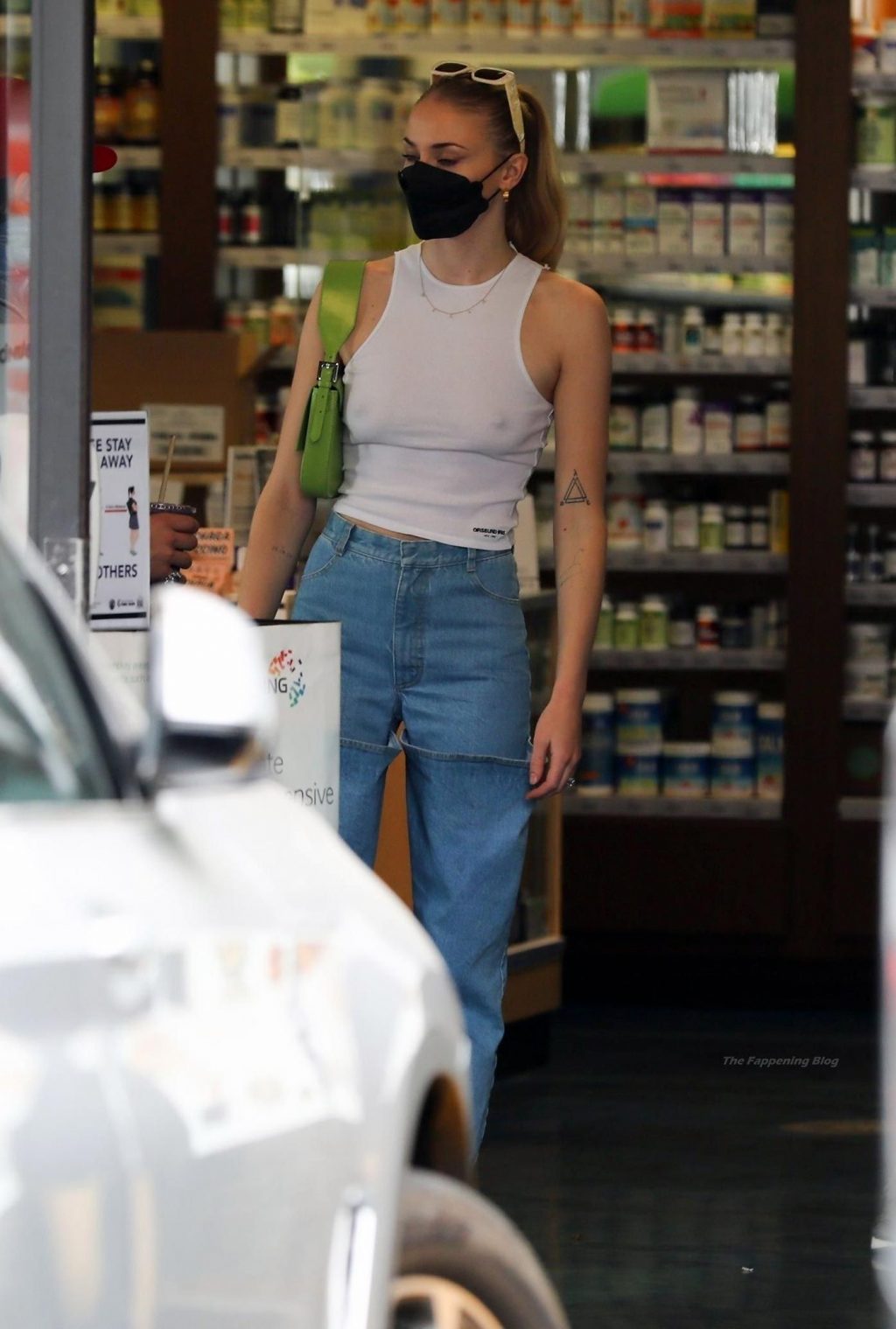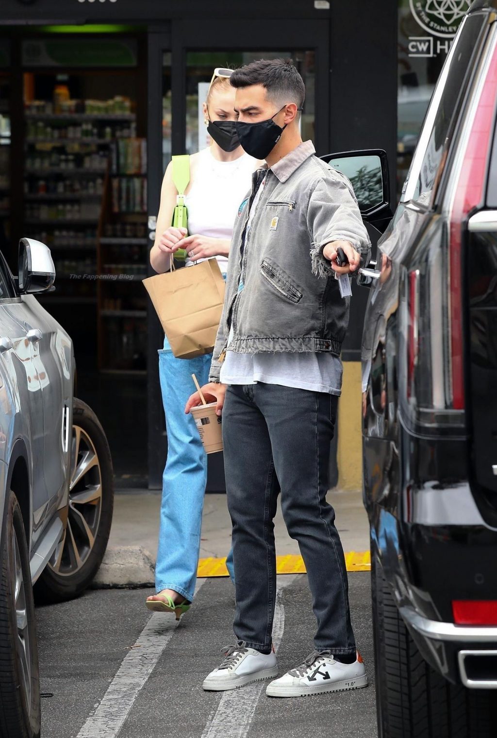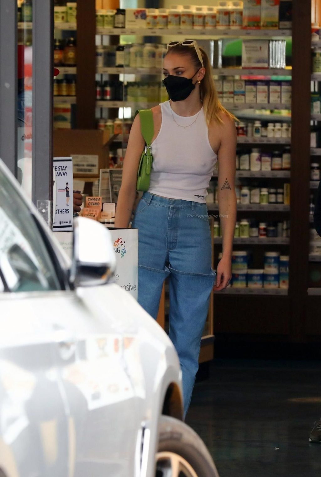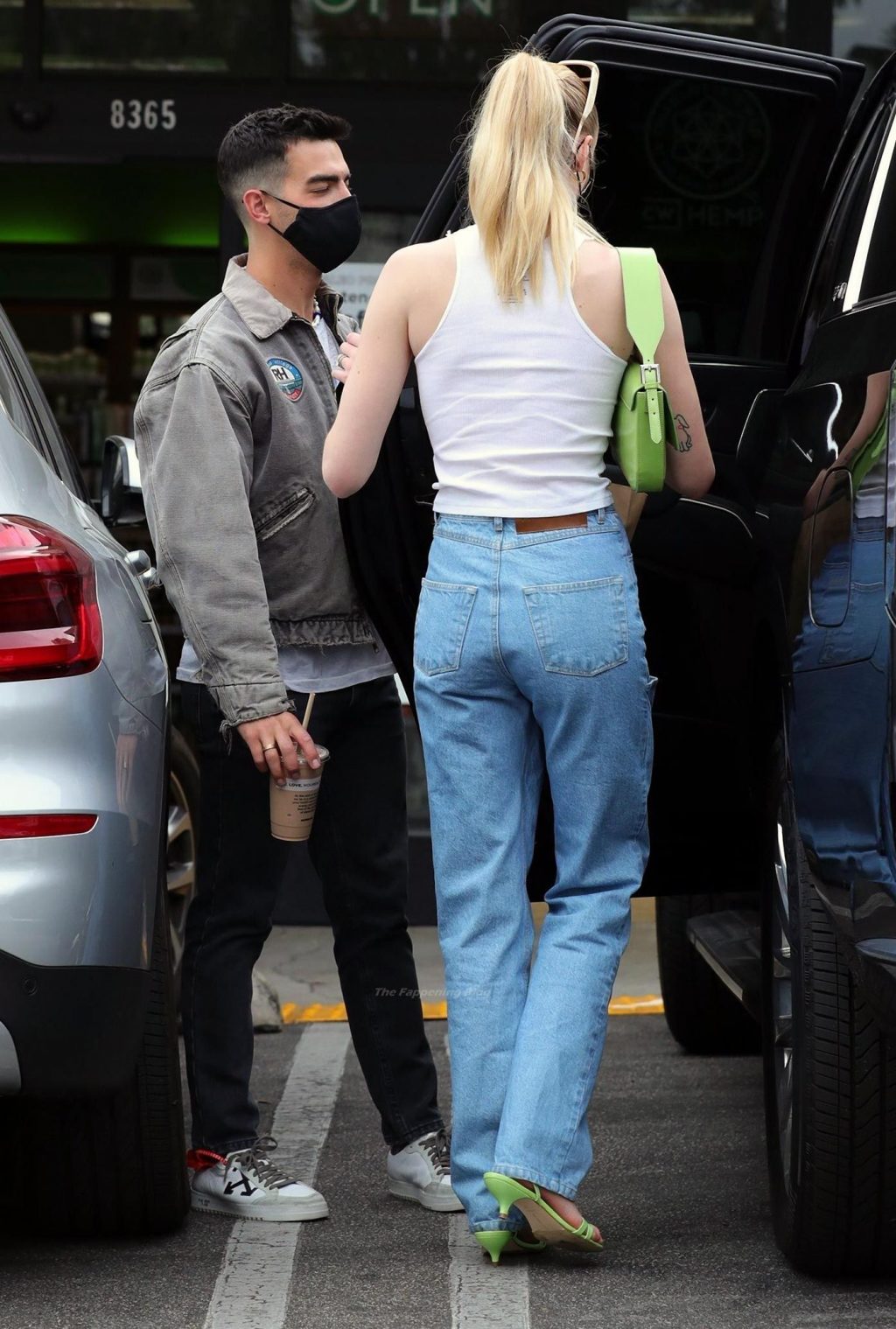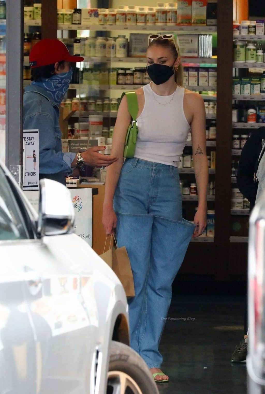 While out shopping with a pal, Joe Jonas gets the door for his wife Sophie Turner as they stop for juice at Earthbar in West Hollywood. These photos were taken a few days ago, and she looks lovely after giving birth! Sophie Turner’s tits were seen as she was not wearing a bra, and the shirt that she had on was more than see-through!