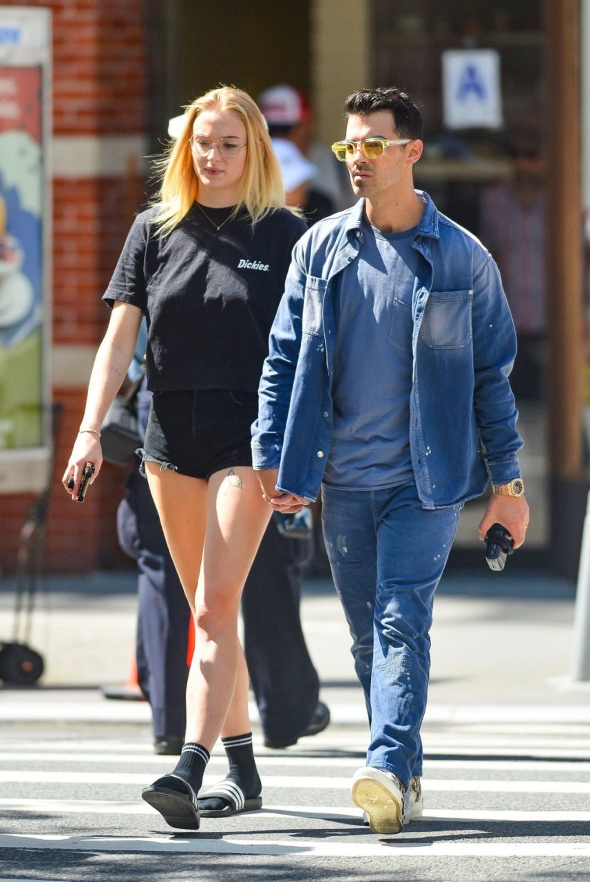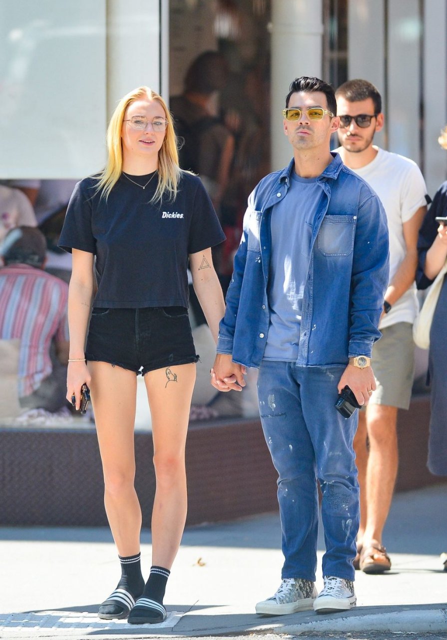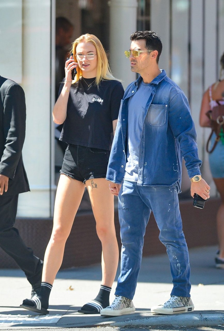 Sophie Turner et Joe Jonas s’embrassent à New York, le 29/08/2019. L’ancienne actrice de “Game of Thrones” âgée de 23 ans portait un t-shirt Dickies court, un short en jean noir, des chaussettes et des sandales. Jonas a opté pour un look double denim associé à des baskets montantes.
