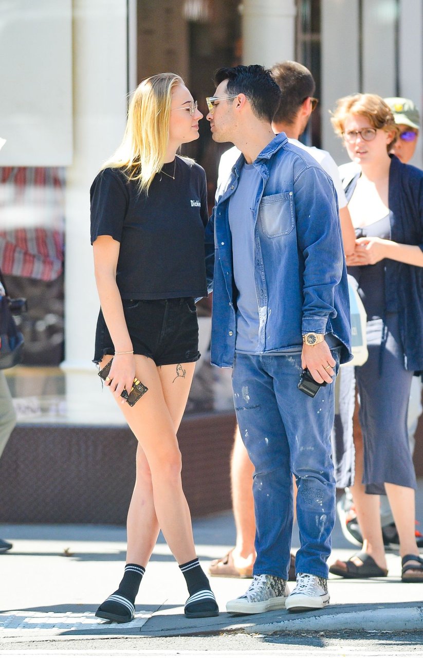 Sophie Turner et Joe Jonas s’embrassent à New York, le 29/08/2019. L’ancienne actrice de “Game of Thrones” âgée de 23 ans portait un t-shirt Dickies court, un short en jean noir, des chaussettes et des sandales. Jonas a opté pour un look double denim associé à des baskets montantes.