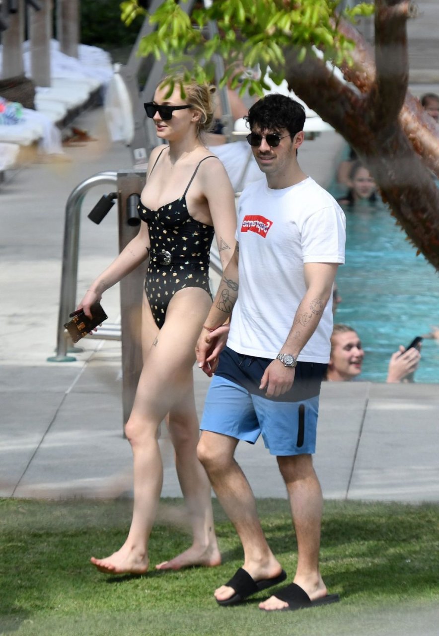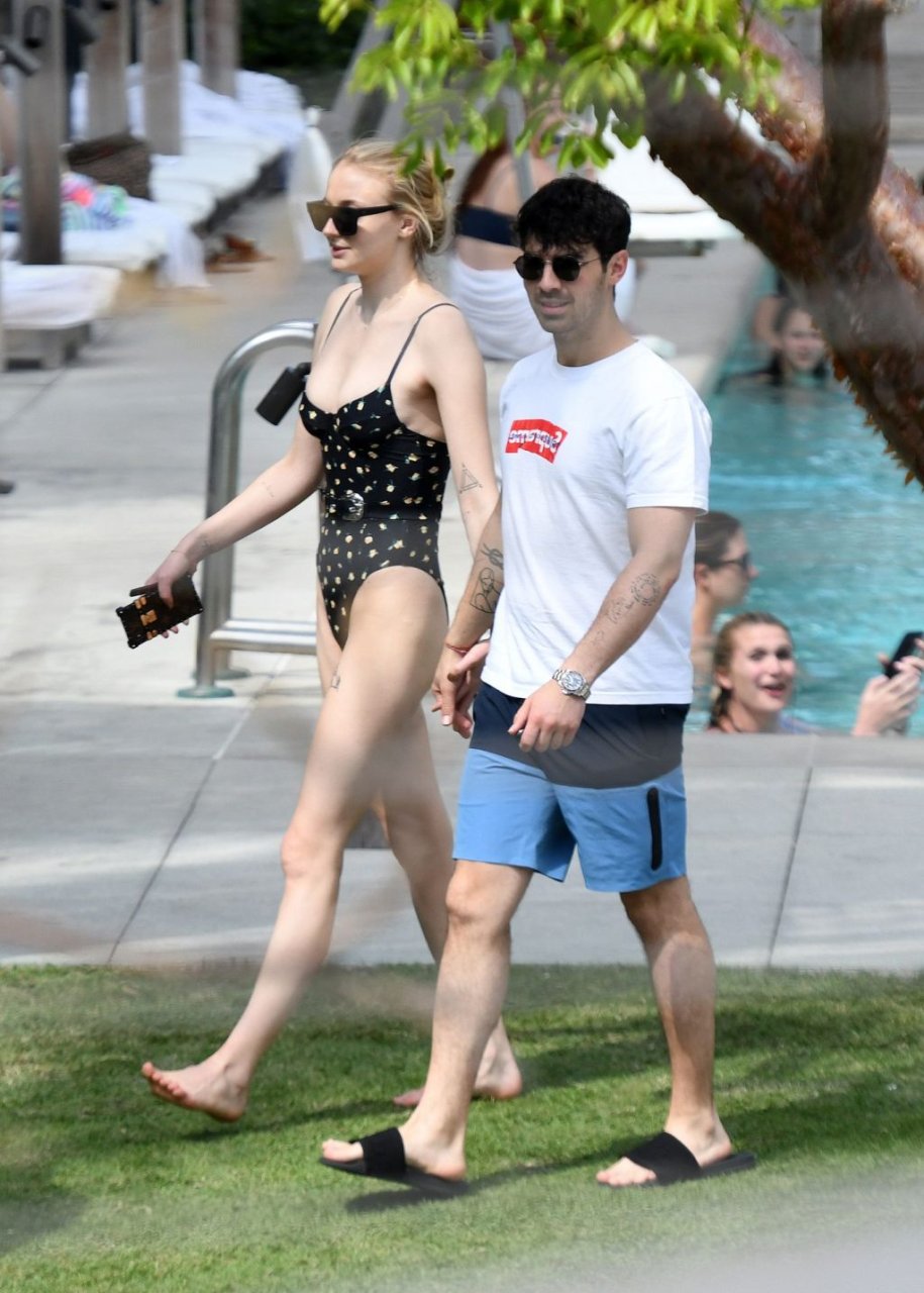 L’actrice Sophie Turner porte un maillot de bain noir ceinturé alors qu’elle était avec son fiancé Joe Jonas à Miami, 23/03/2019.