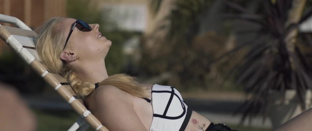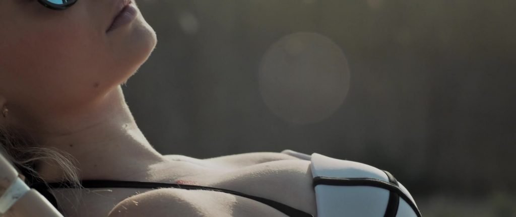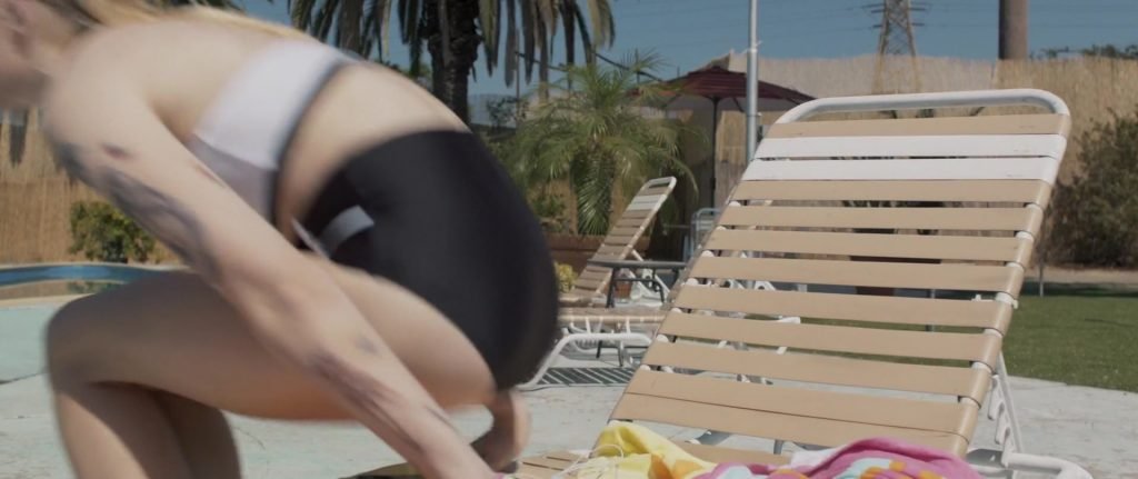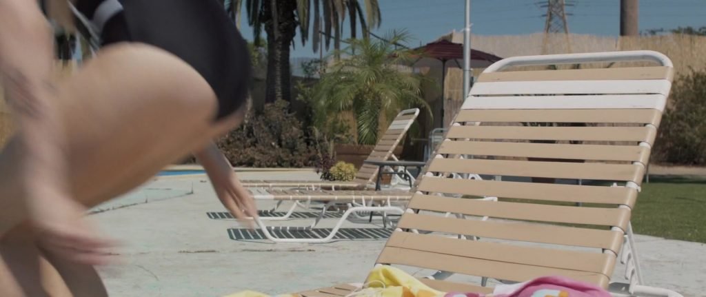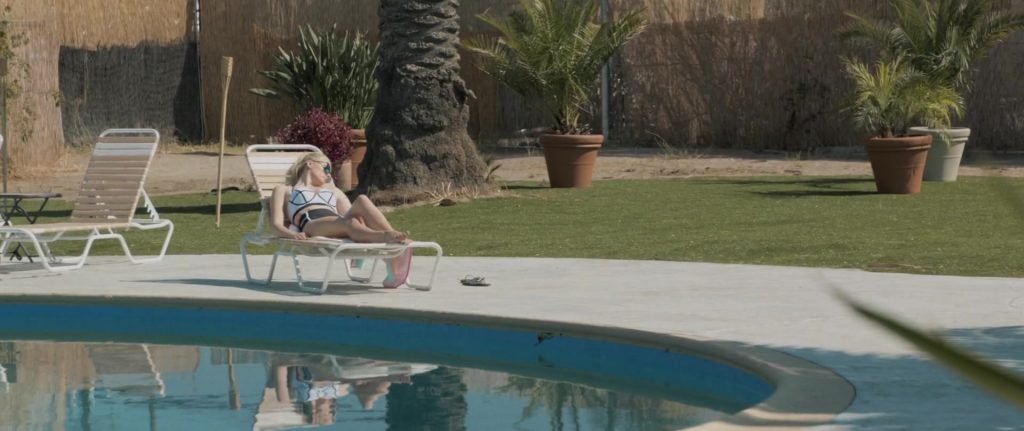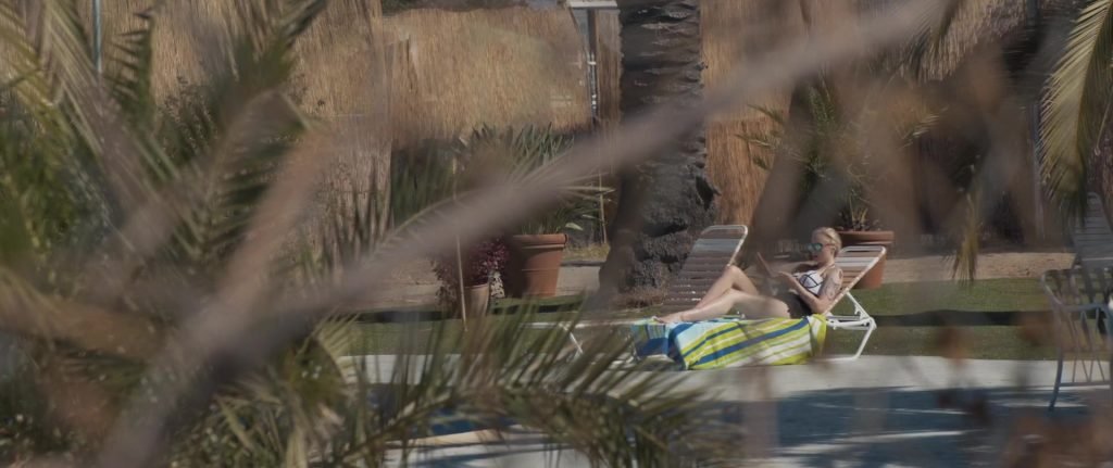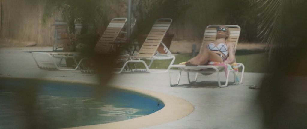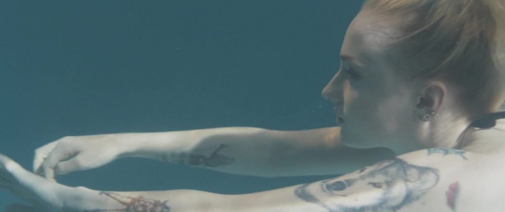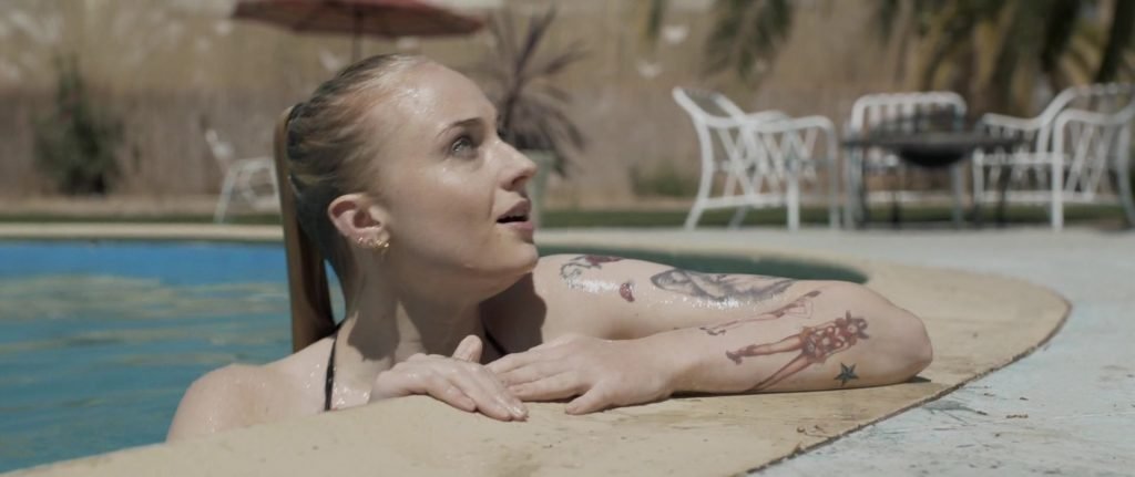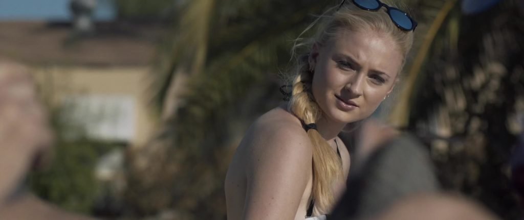 Gros plans sur Sophie Turner en bikini allongée. Puis elle saute dans la piscine et nage sous l’eau.