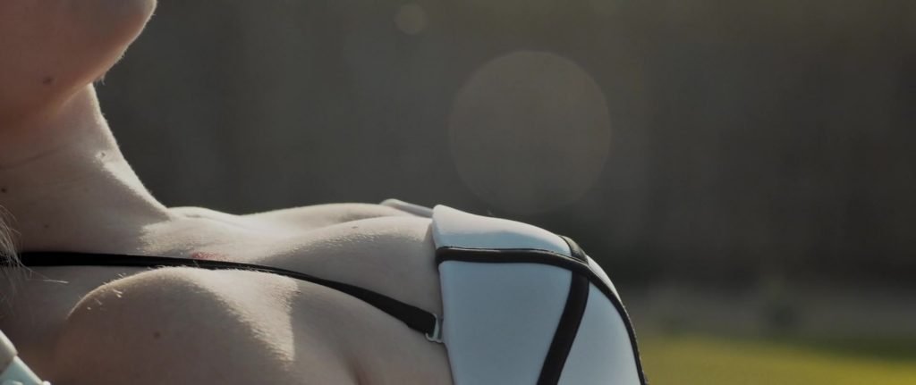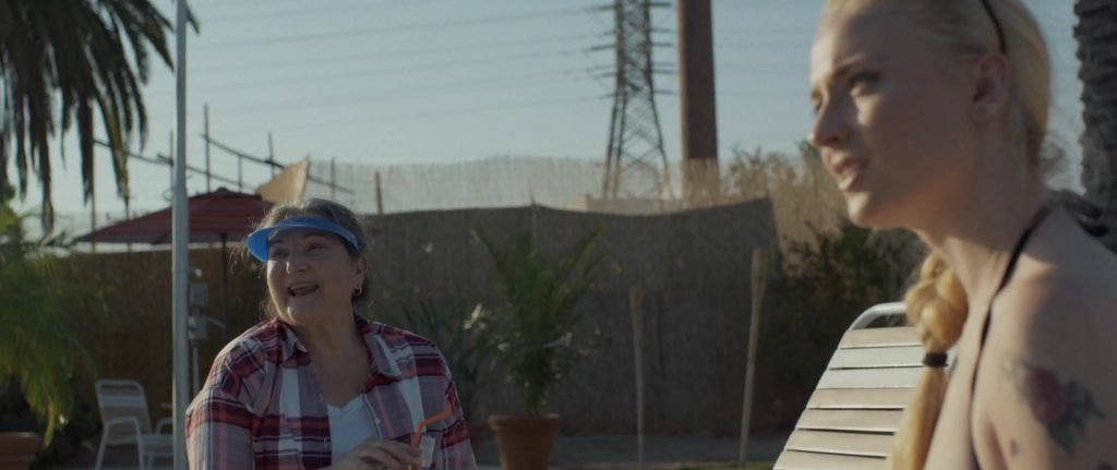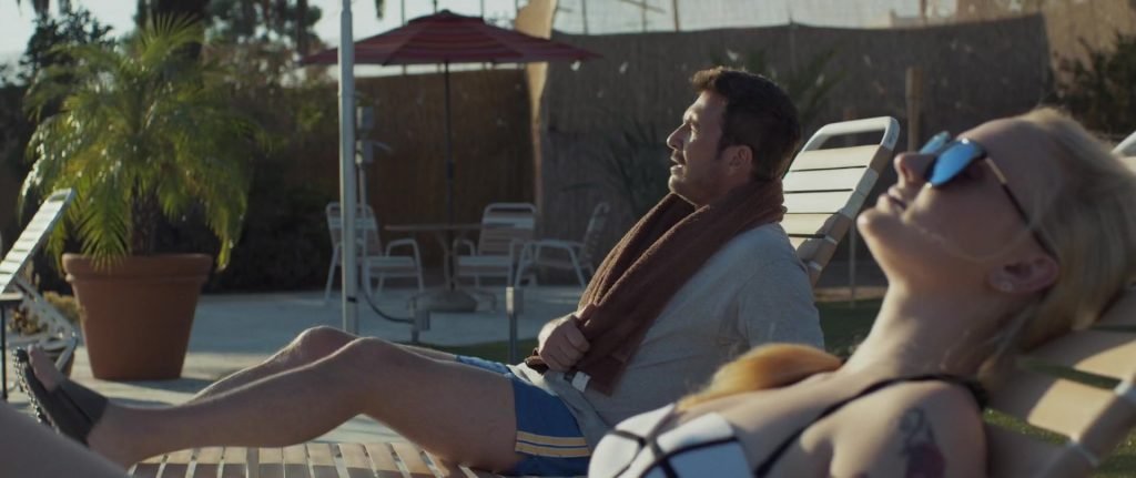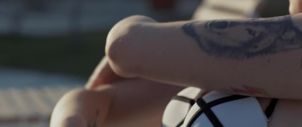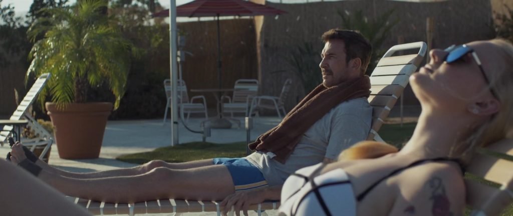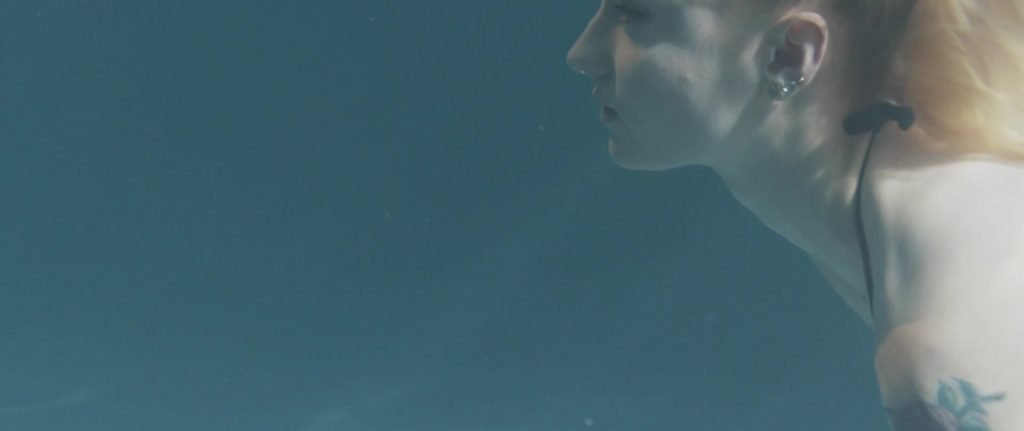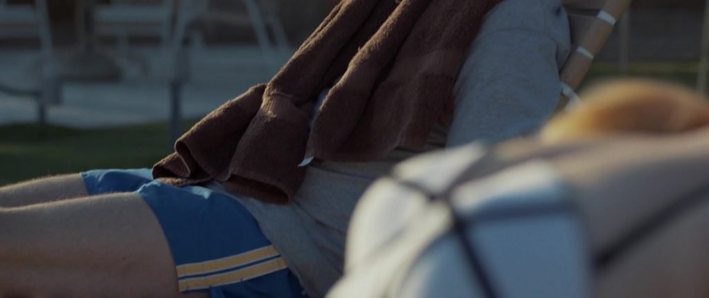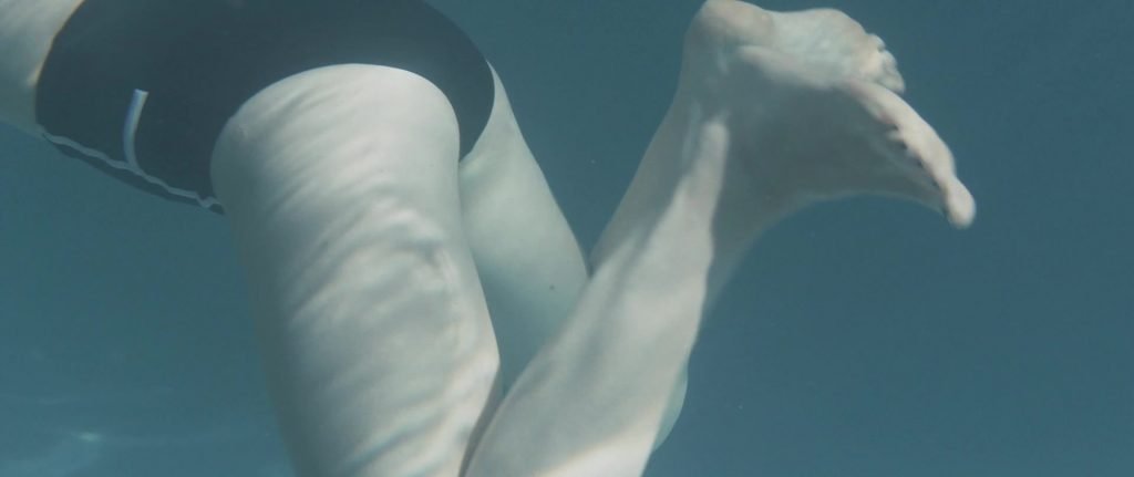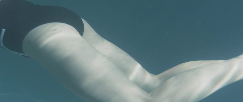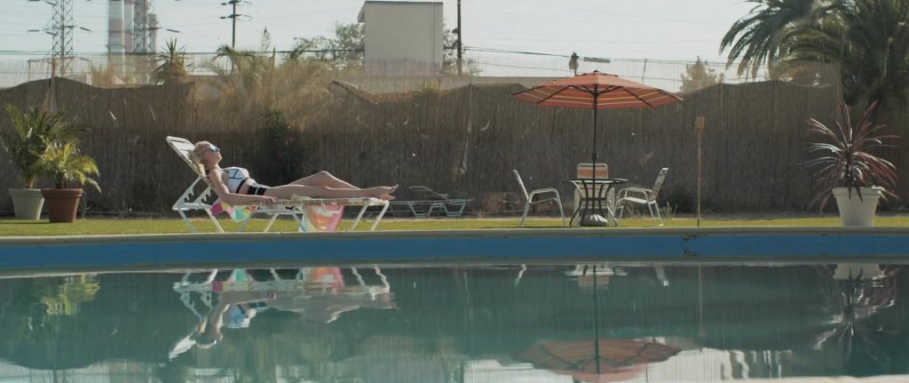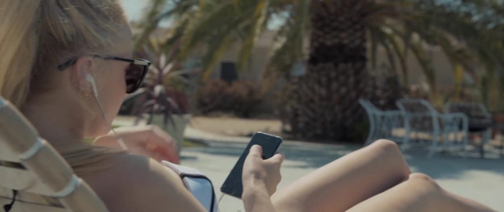 Gros plans sur Sophie Turner en bikini allongée. Puis elle saute dans la piscine et nage sous l’eau.