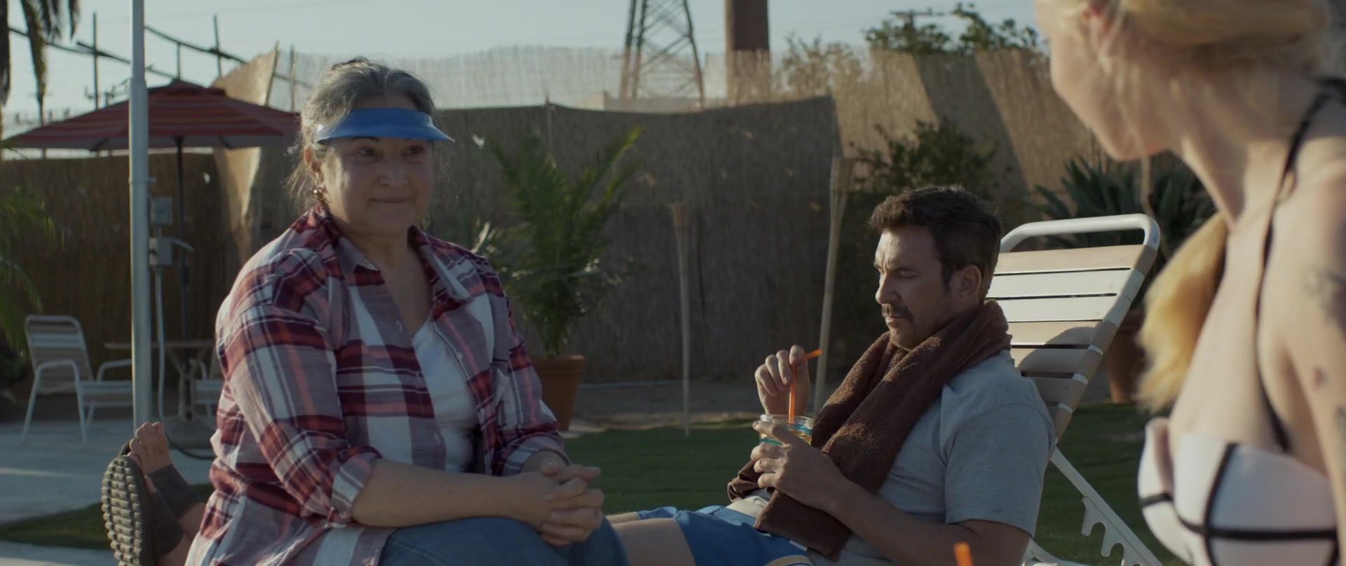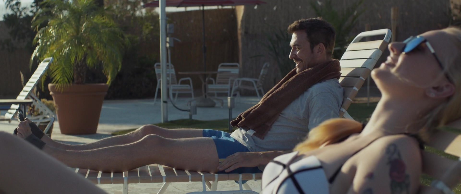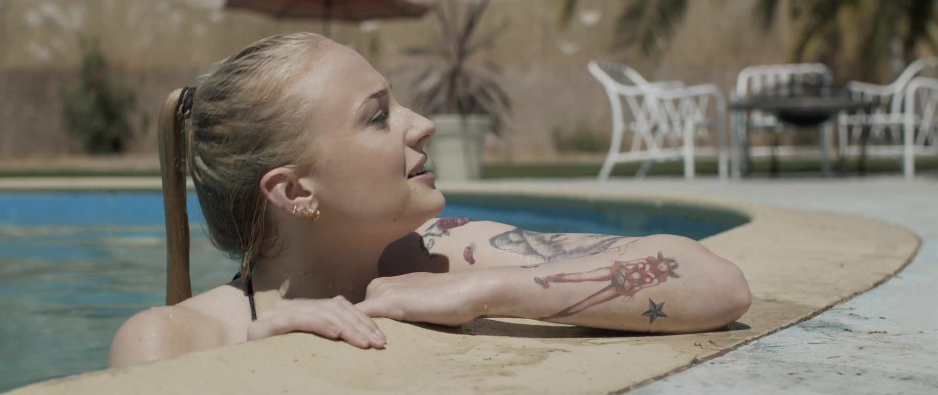 Gros plans sur Sophie Turner en bikini allongée. Puis elle saute dans la piscine et nage sous l’eau.