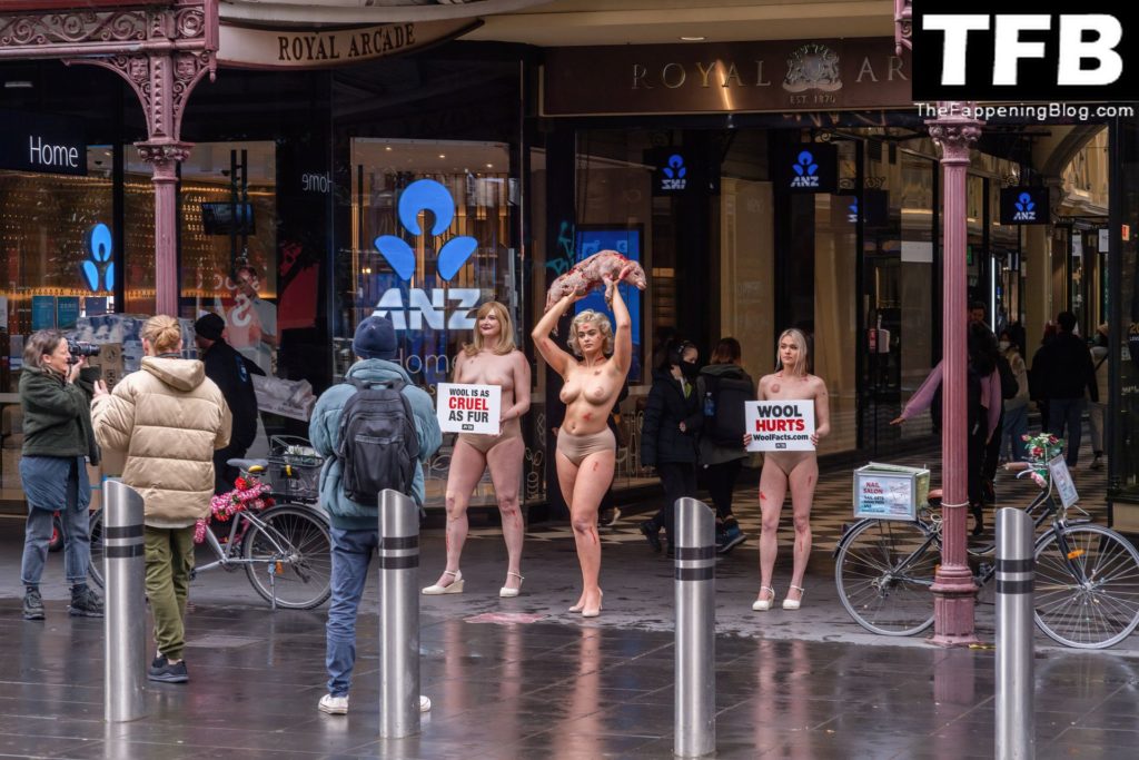 Modèle et influenceuse, Stefania Ferrario organise une manifestation en semi-nudité sur le traitement des moutons par l’industrie de la laine devant le Royal Arcade au milieu du Bourke Street Mall à Melbourne dans le cadre d’un groupe de PETA.