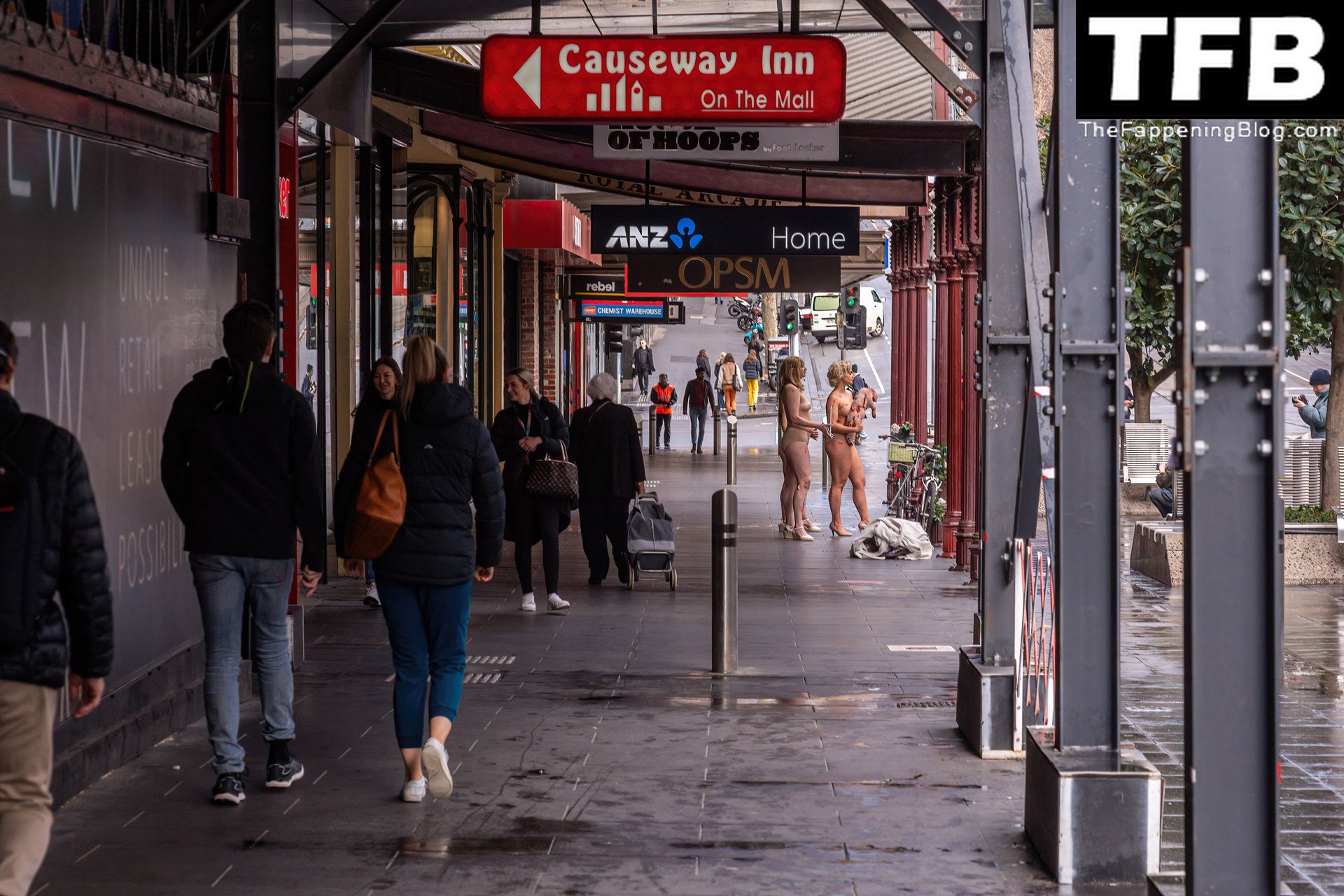 Modèle et influenceuse, Stefania Ferrario organise une manifestation en semi-nudité sur le traitement des moutons par l’industrie de la laine devant le Royal Arcade au milieu du Bourke Street Mall à Melbourne dans le cadre d’un groupe de PETA.
