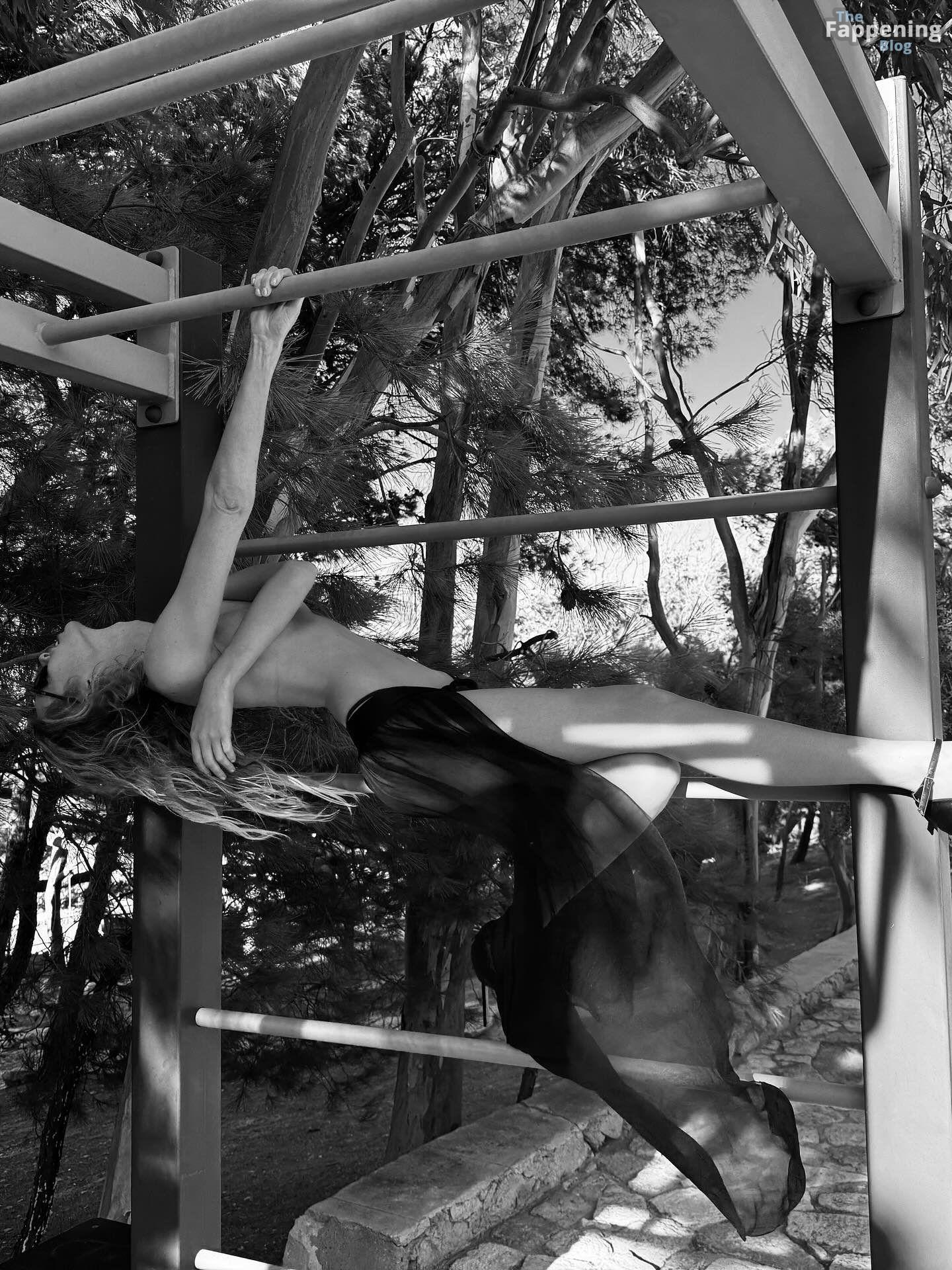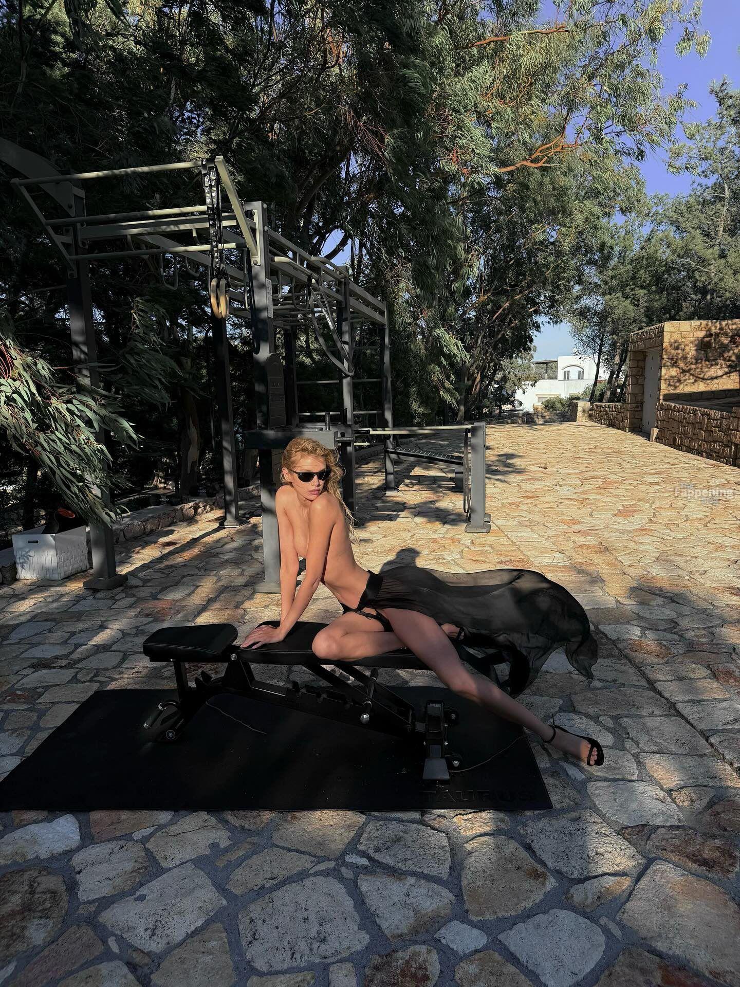 La star du Fappening Stella Maxwell se dénude, seule une barre noire couvre sa poitrine lors d’une séance photo en extérieur dans une salle de sport brute.