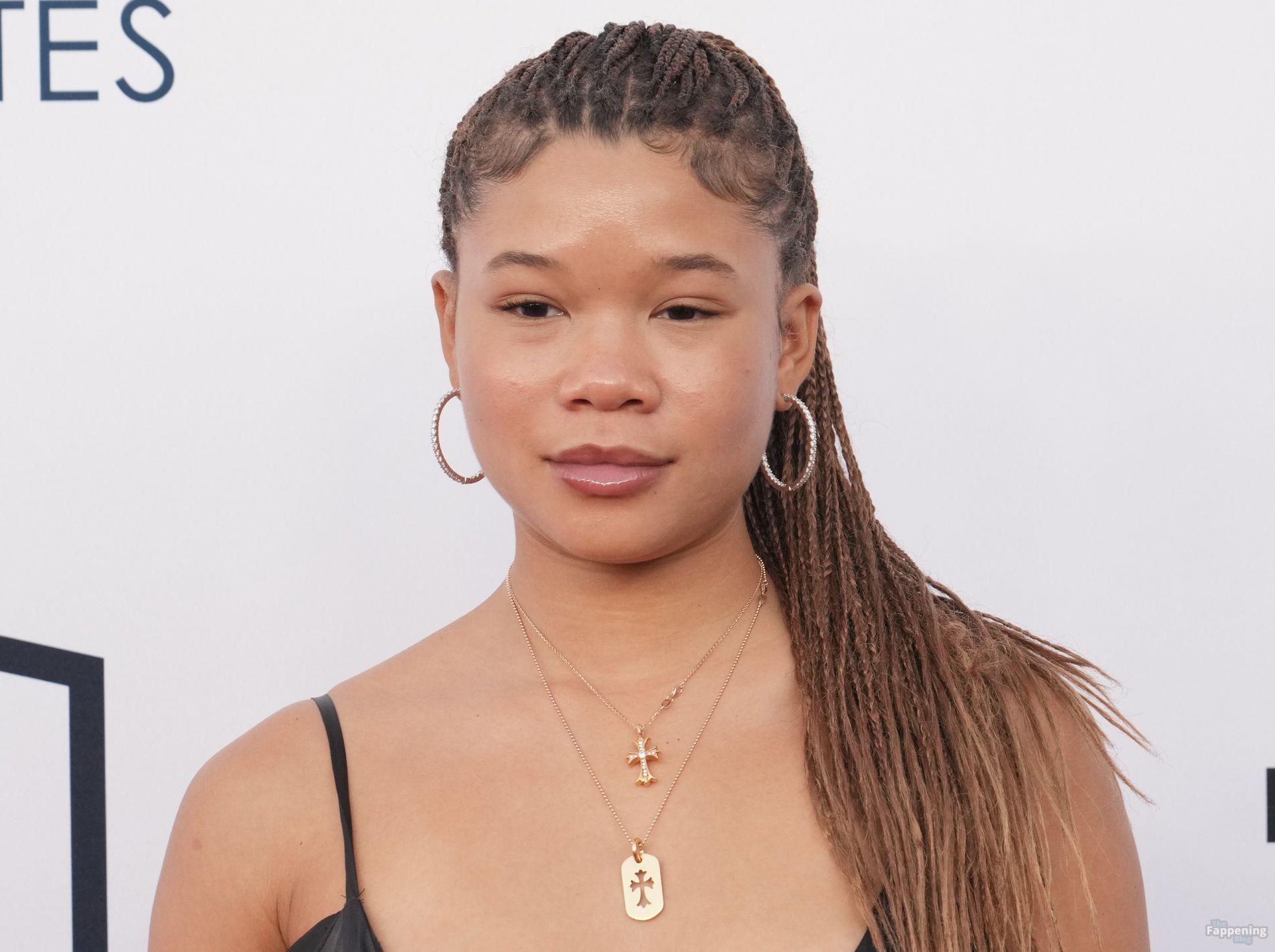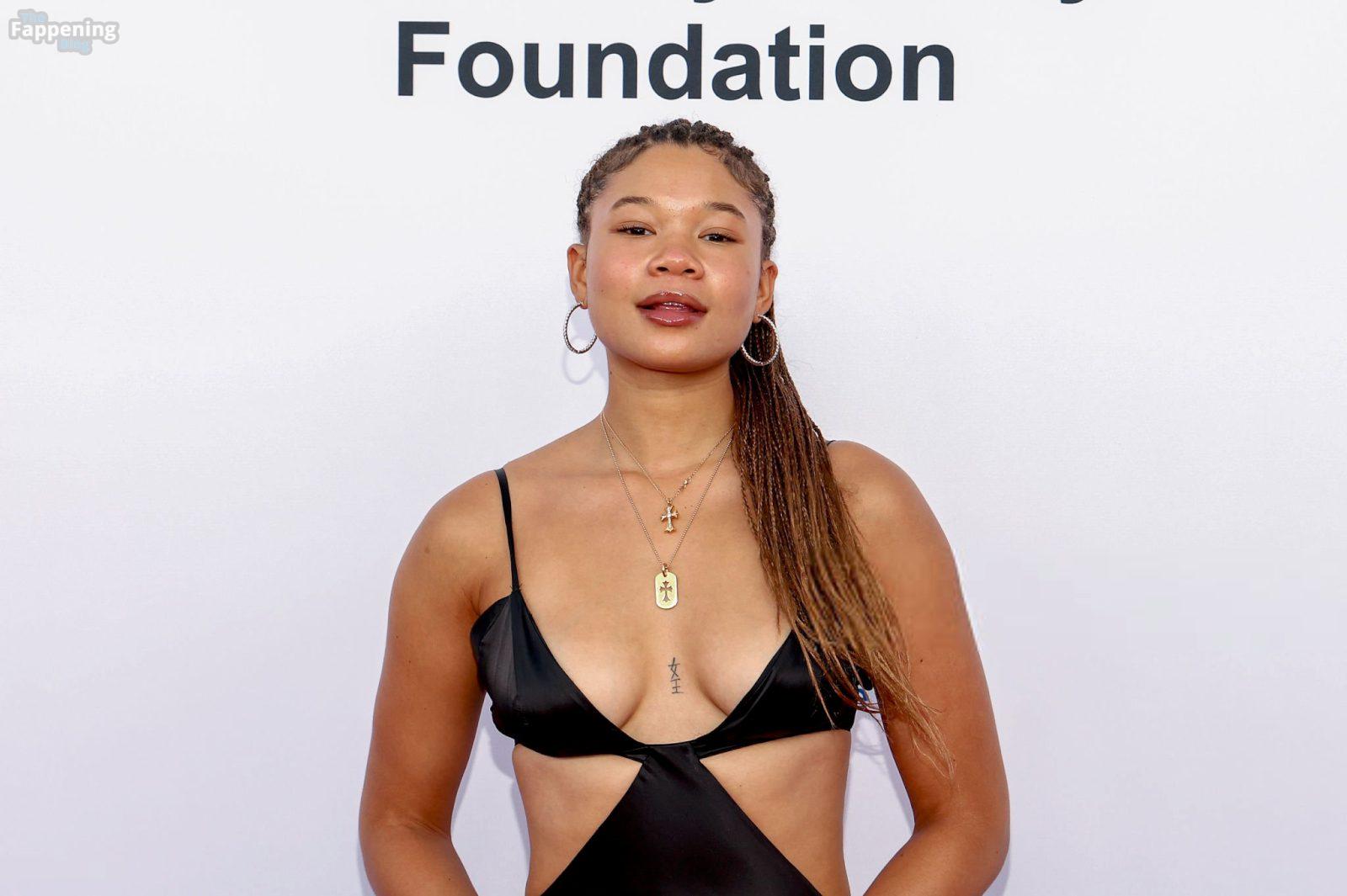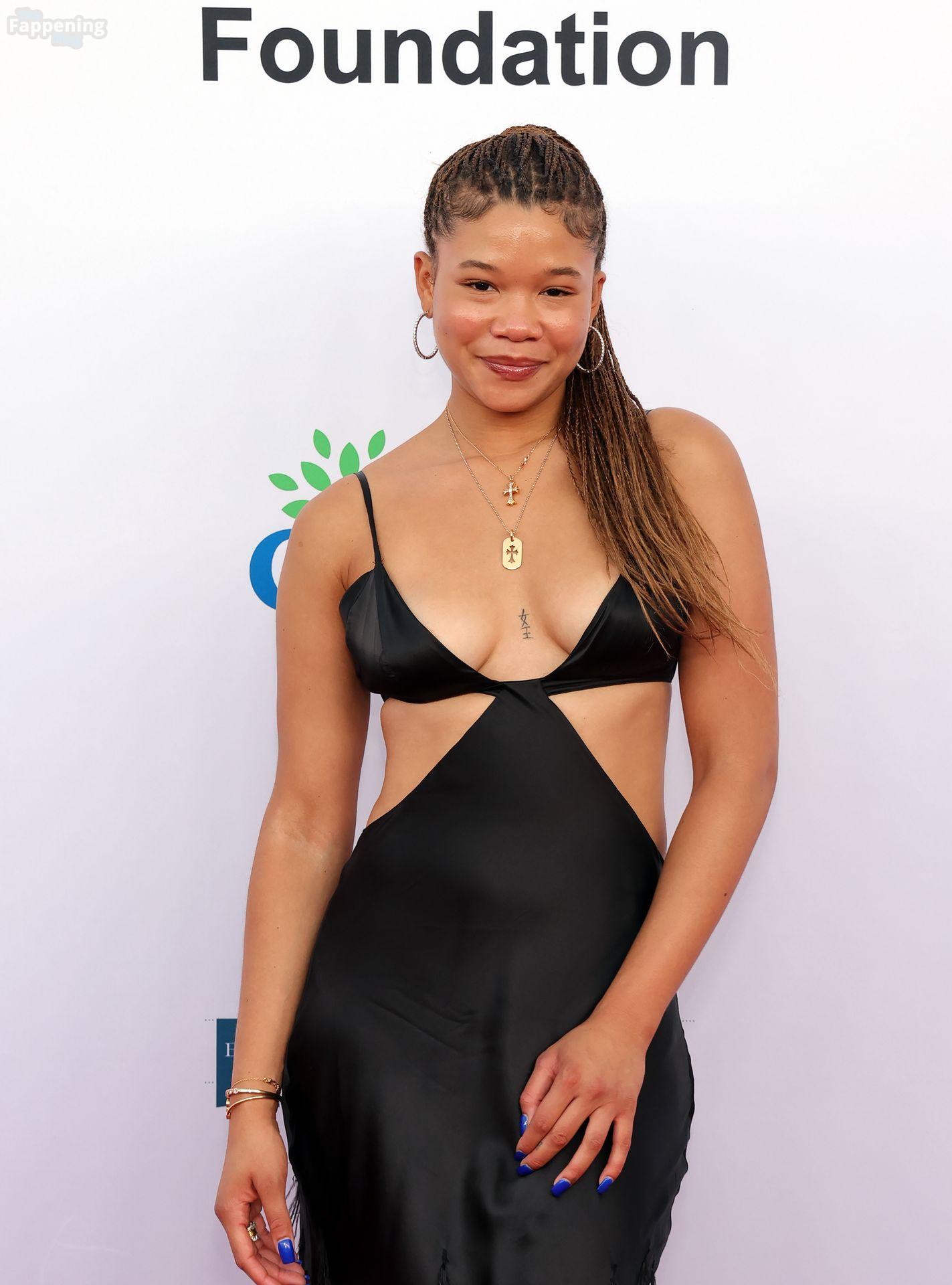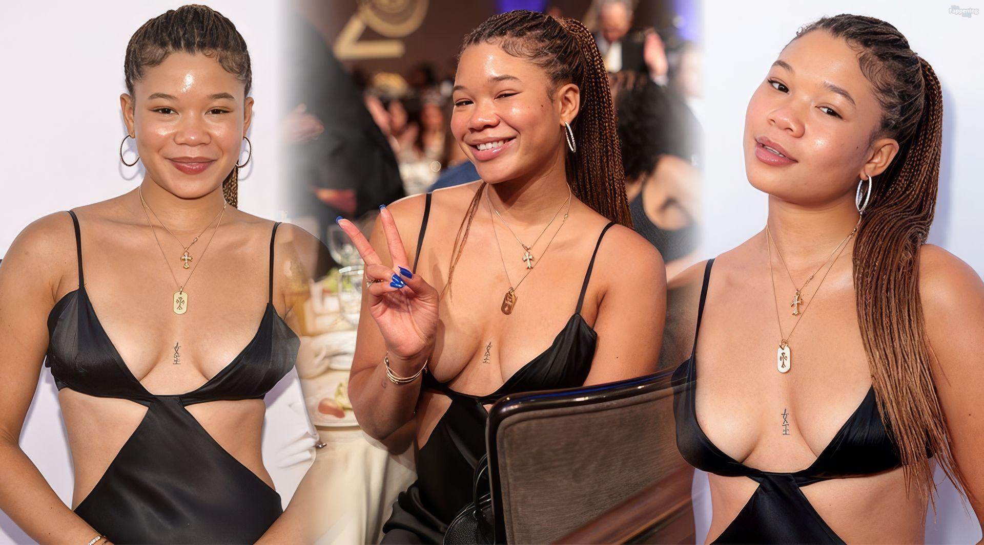 Storm Reid est vue à la Harold and Carole Pump Foundation lors de la fête au Beverly Hilton à Beverly Hills, portant une robe noire sauvage avec quelques découpes, montrant ses seins sexy.