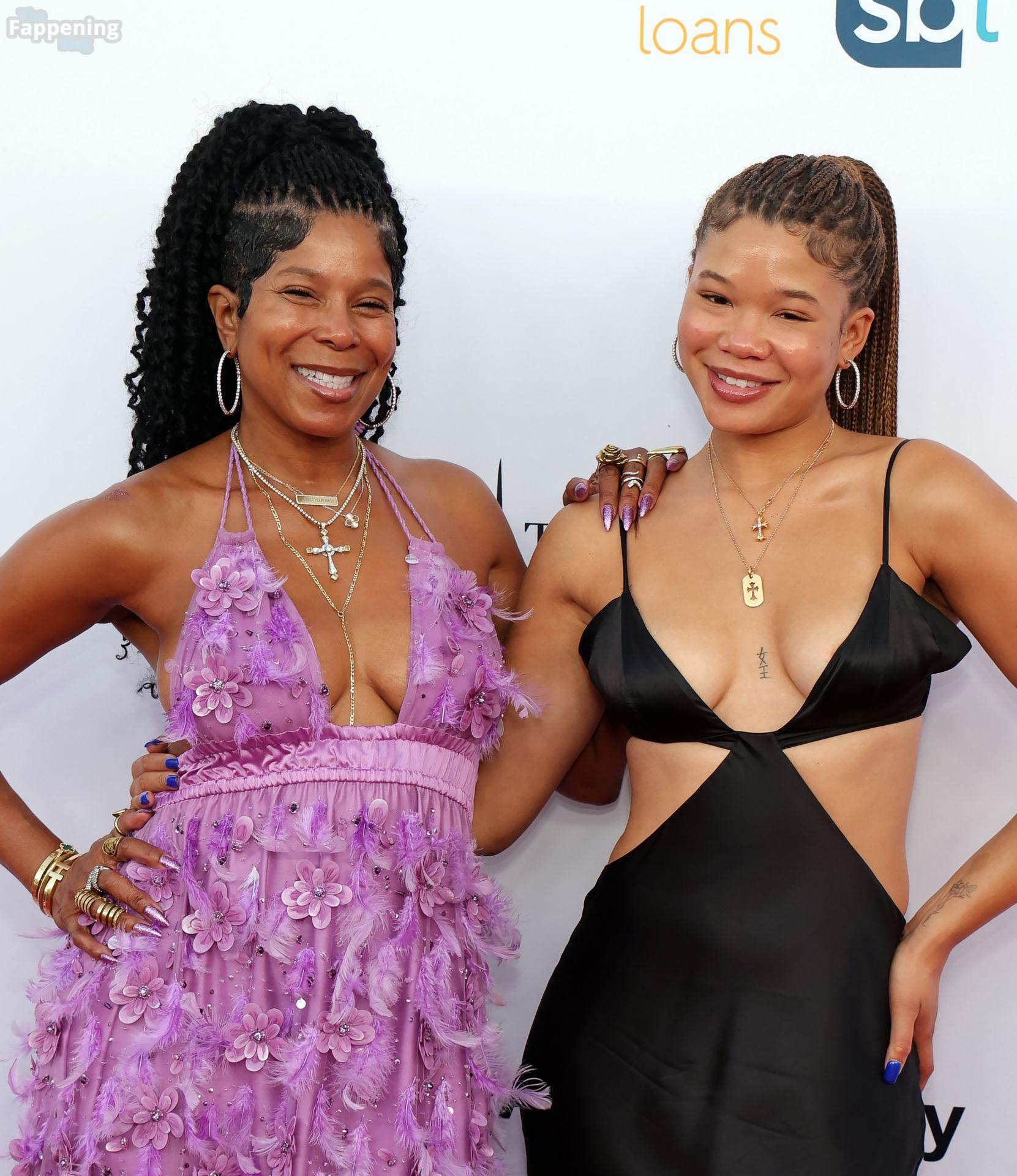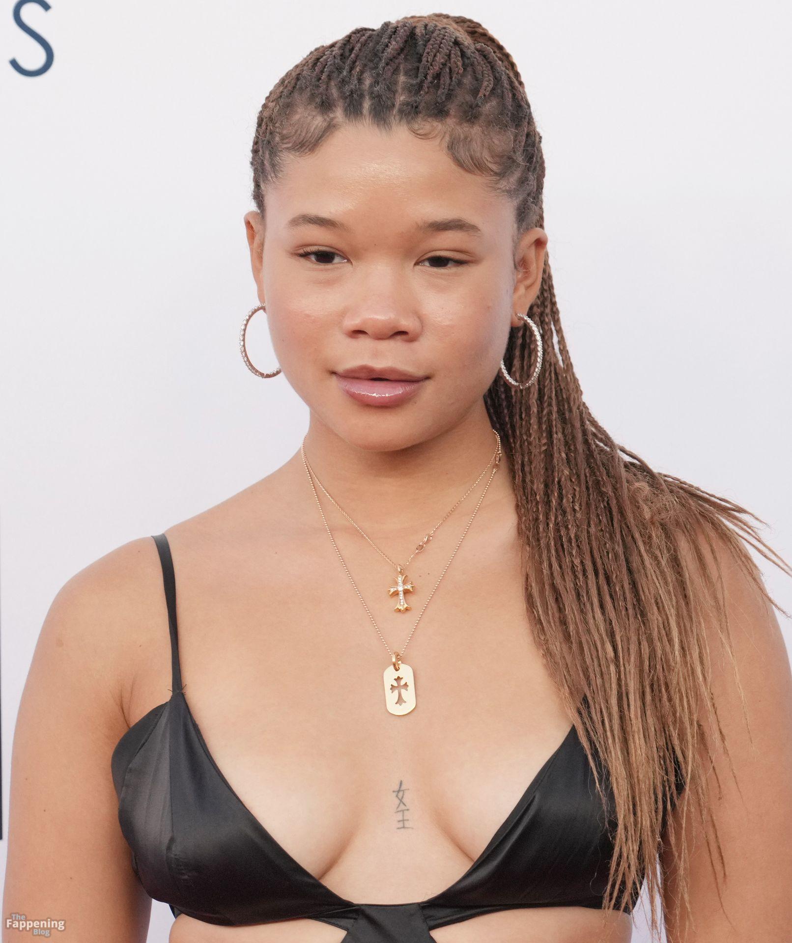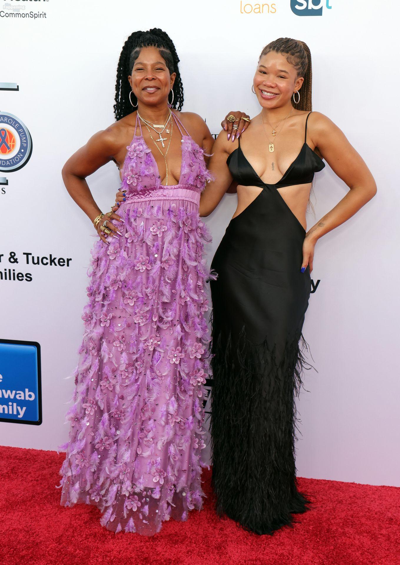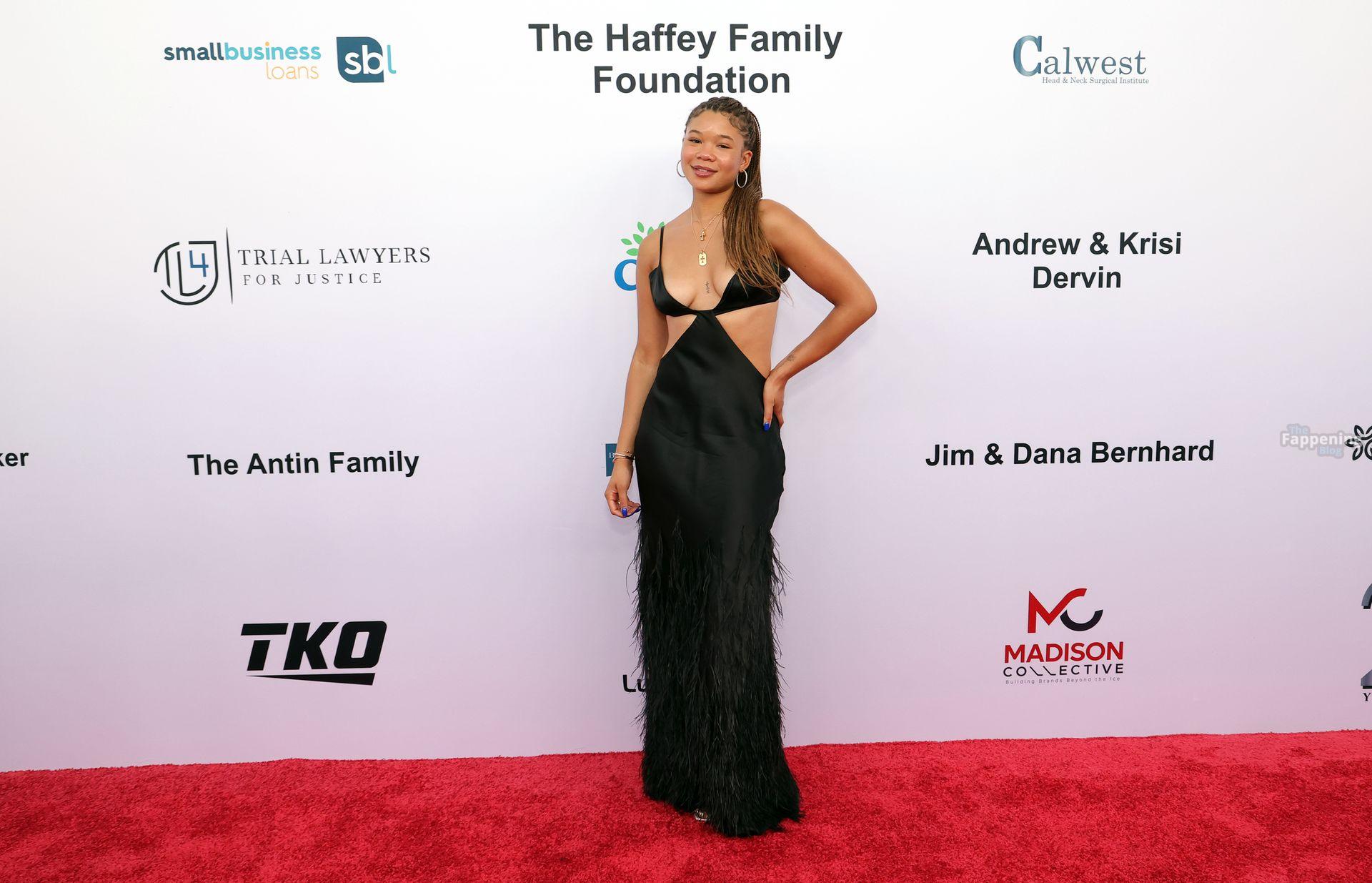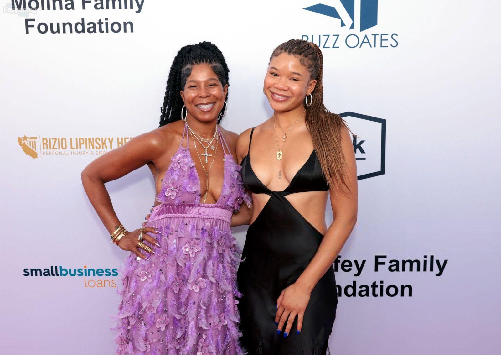 Storm Reid est vue à la Harold and Carole Pump Foundation lors de la fête au Beverly Hilton à Beverly Hills, portant une robe noire sauvage avec quelques découpes, montrant ses seins sexy.