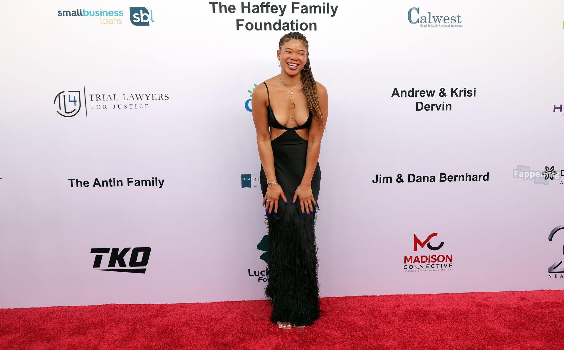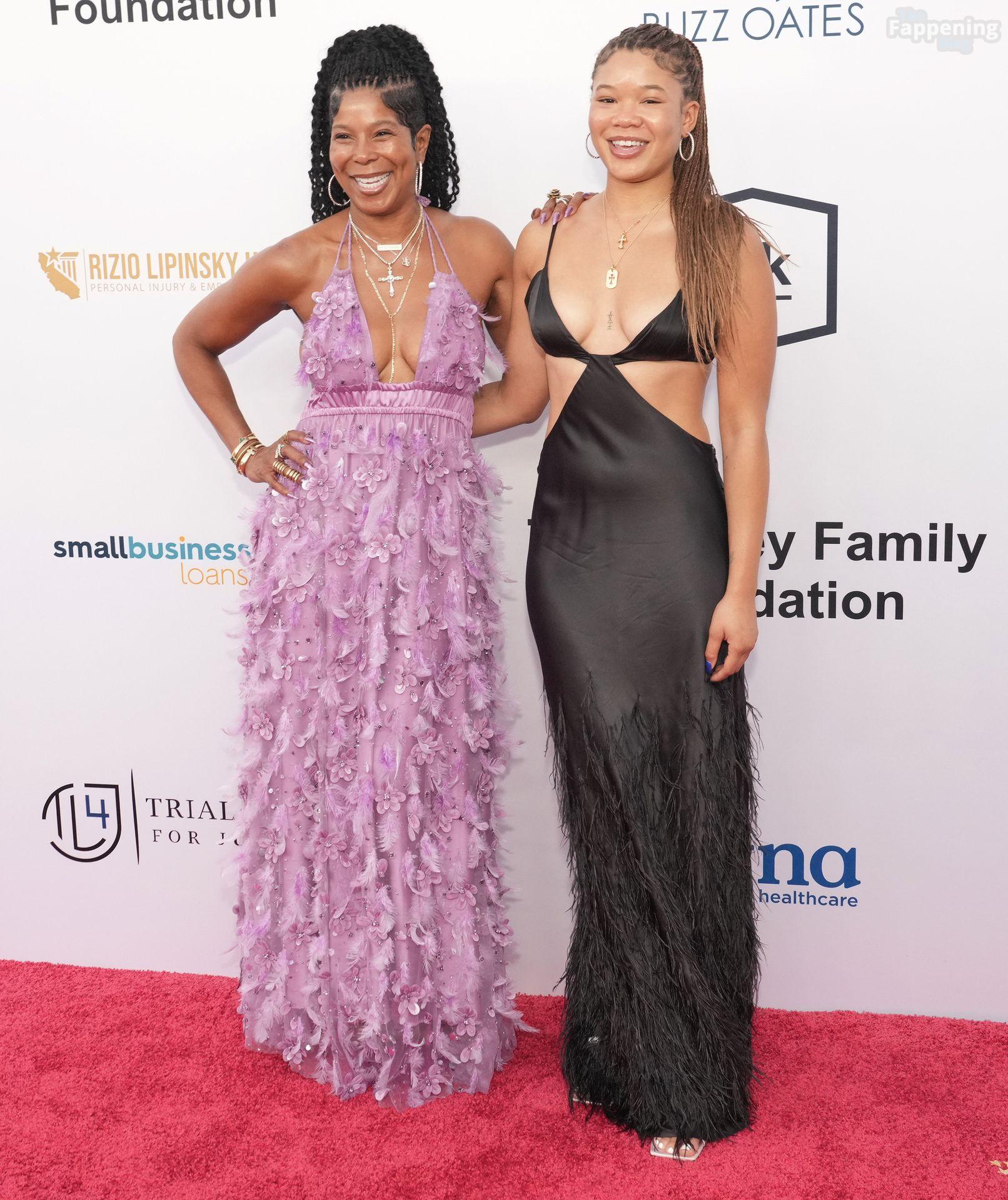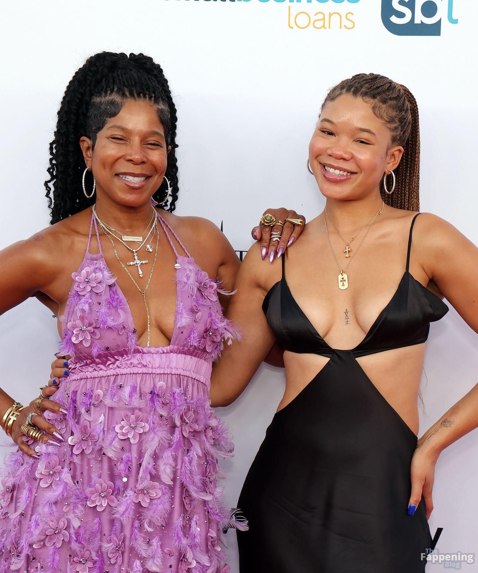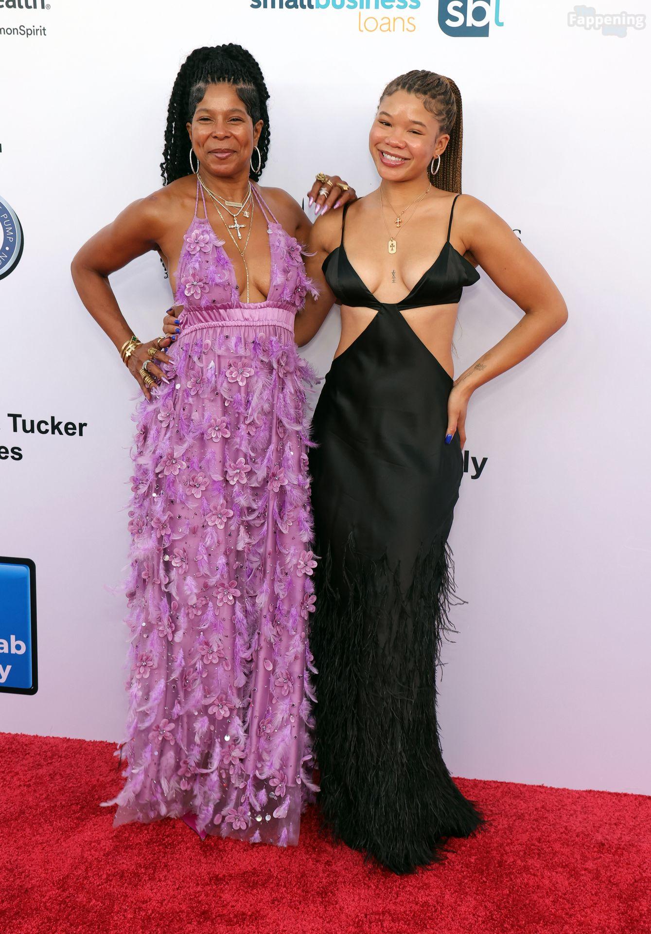 Storm Reid est vue à la Harold and Carole Pump Foundation lors de la fête au Beverly Hilton à Beverly Hills, portant une robe noire sauvage avec quelques découpes, montrant ses seins sexy.