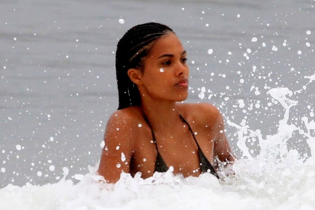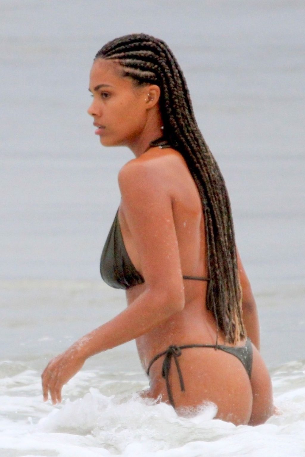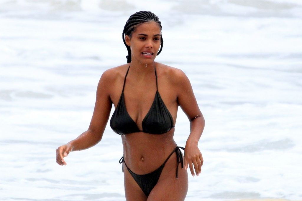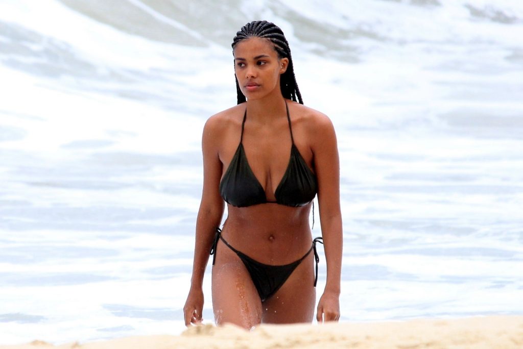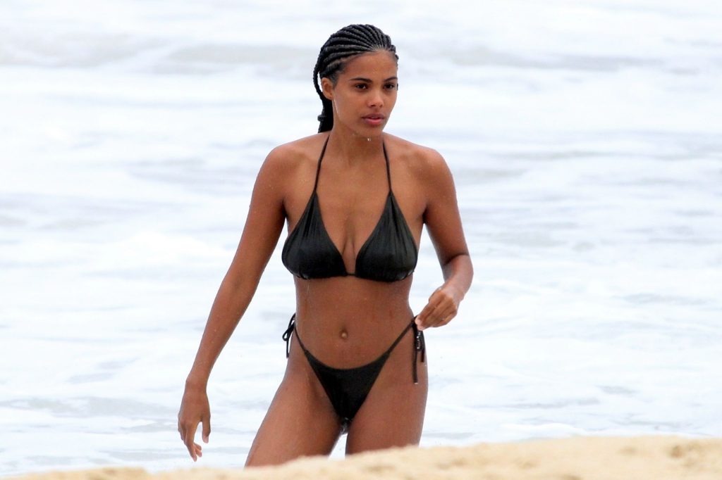 La femme de Vincent Cassel, Tina Kunakey, est accompagnée d’une amie pour une journée à la plage à Rio de Janeiro, le 21/02/2020. Le mannequin, portant un bikini noir, est allée se baigner tout en montrant ses nouvelles tresses.