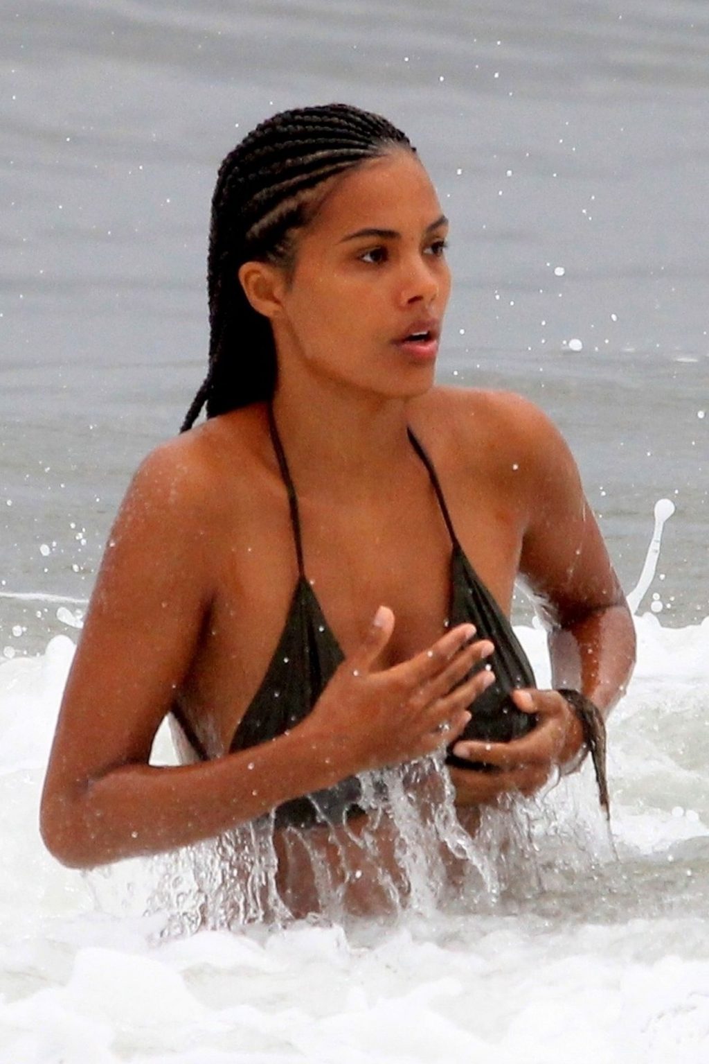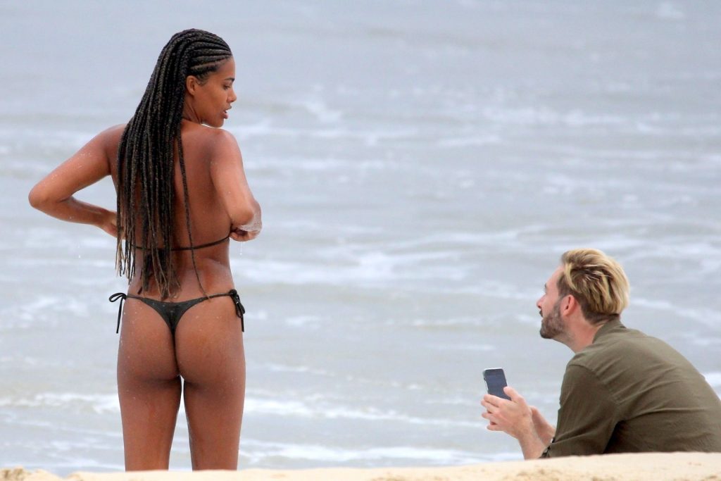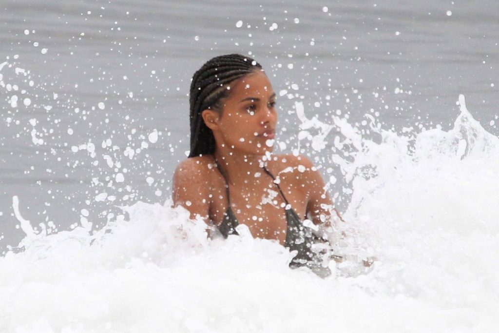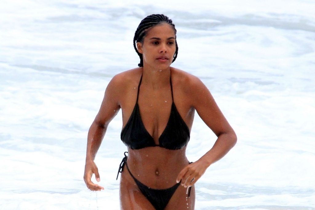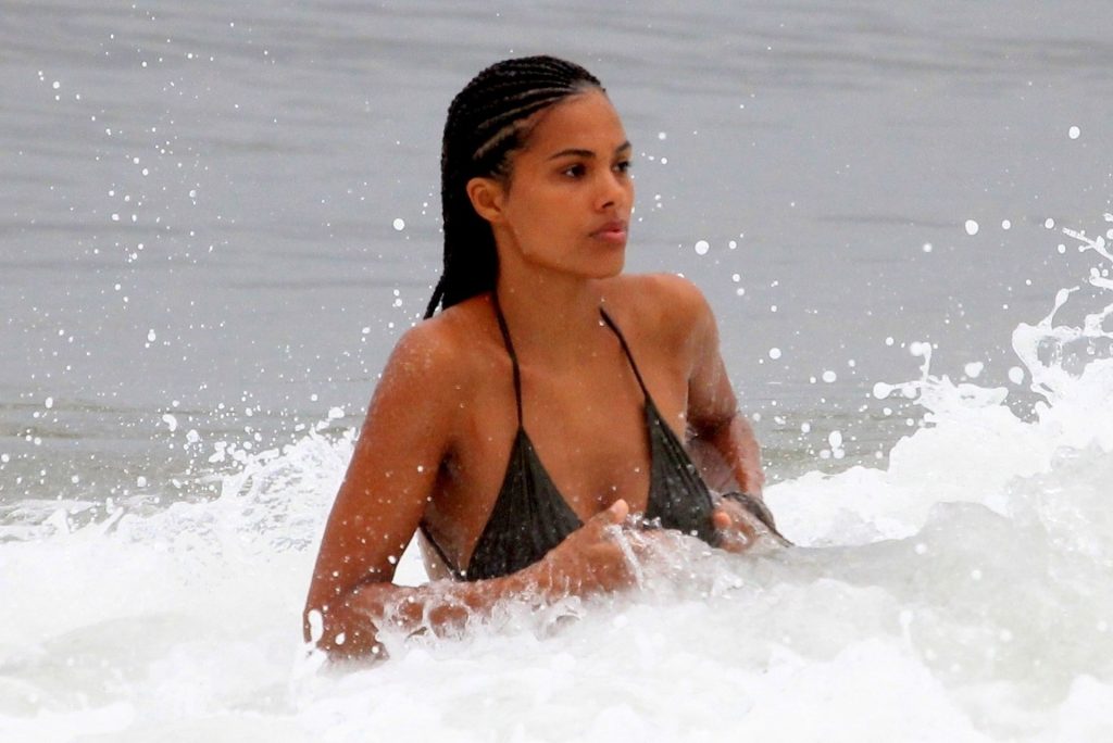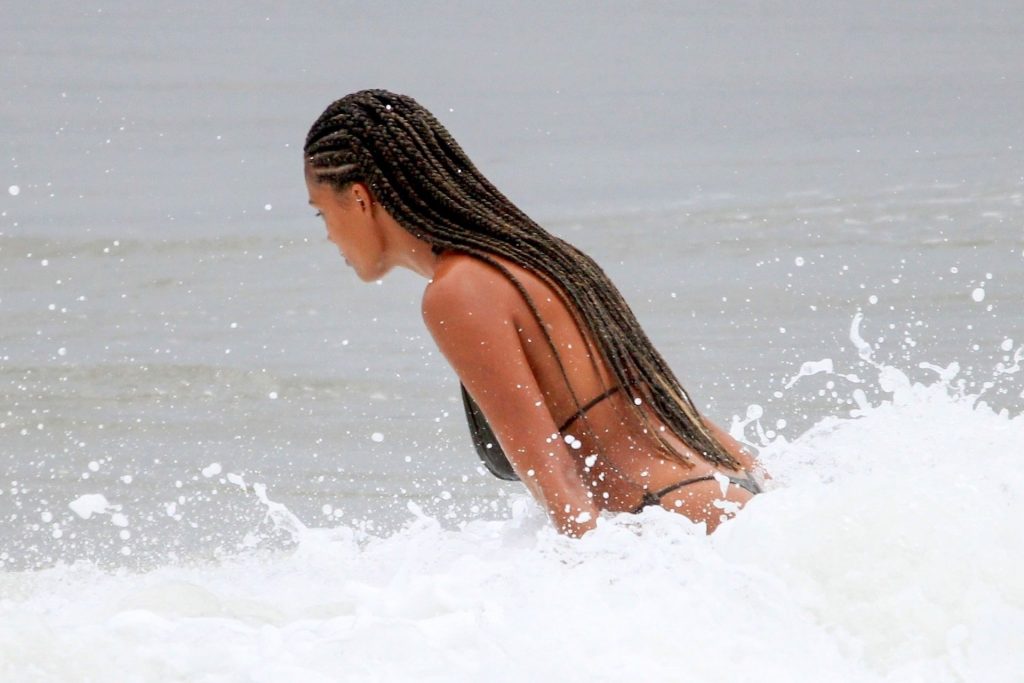 La femme de Vincent Cassel, Tina Kunakey, est accompagnée d’une amie pour une journée à la plage à Rio de Janeiro, le 21/02/2020. Le mannequin, portant un bikini noir, est allée se baigner tout en montrant ses nouvelles tresses.