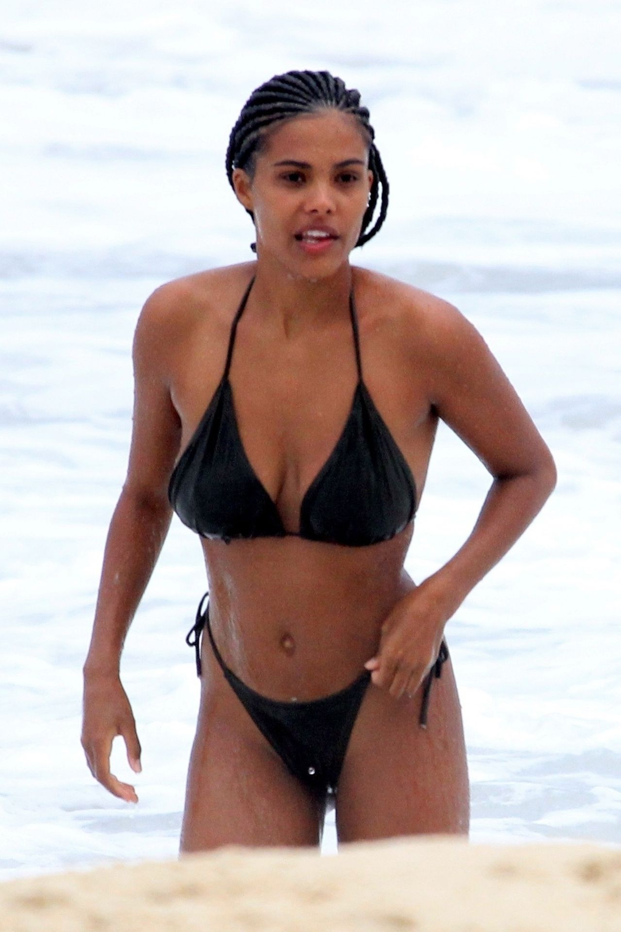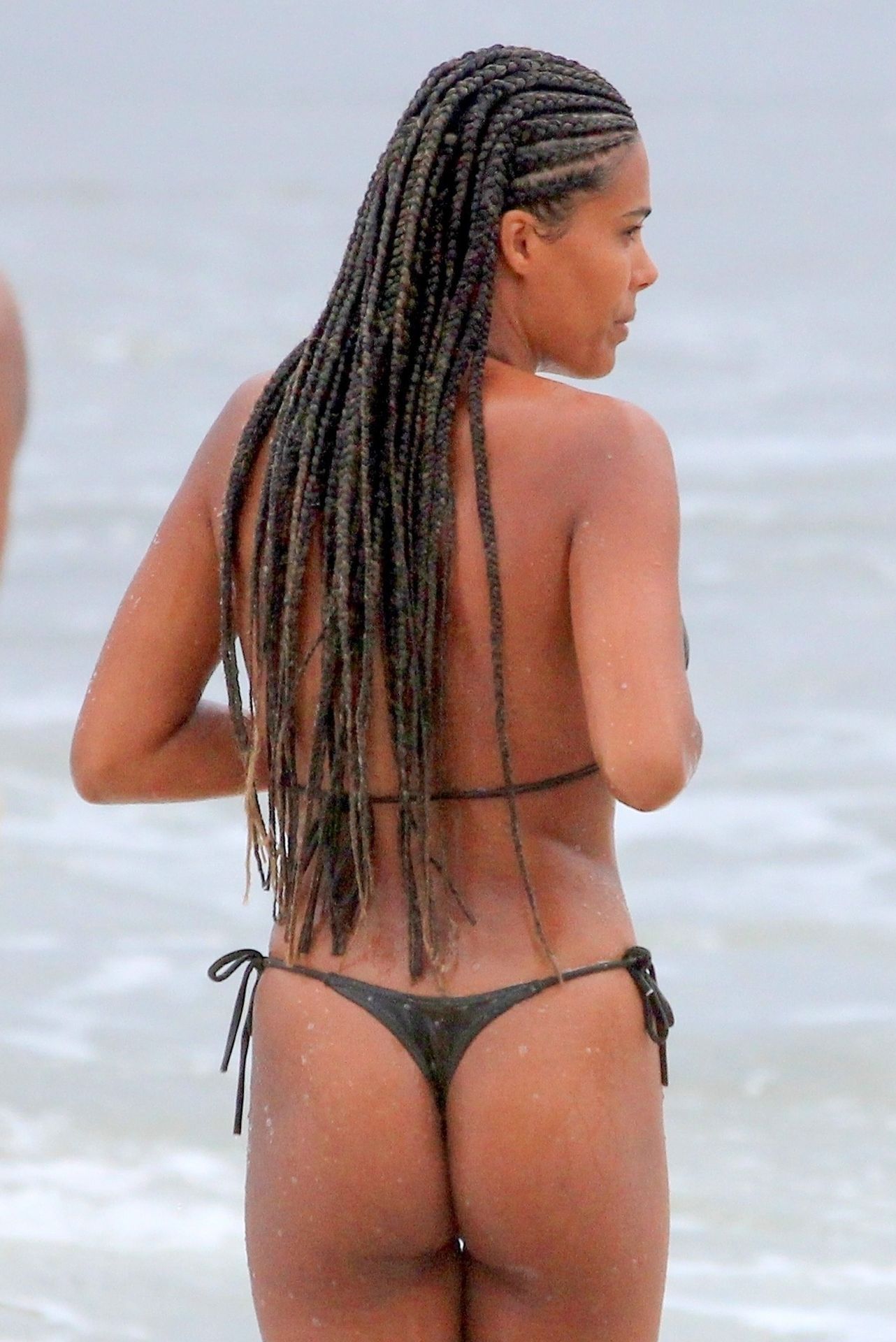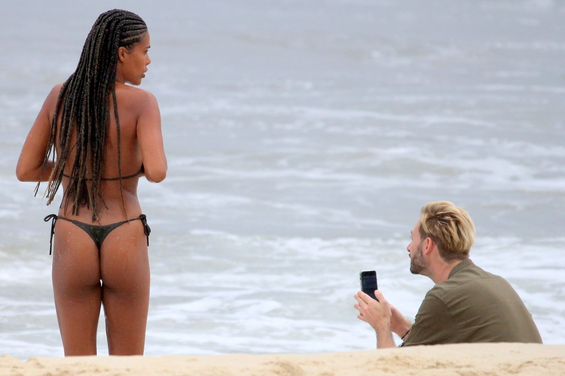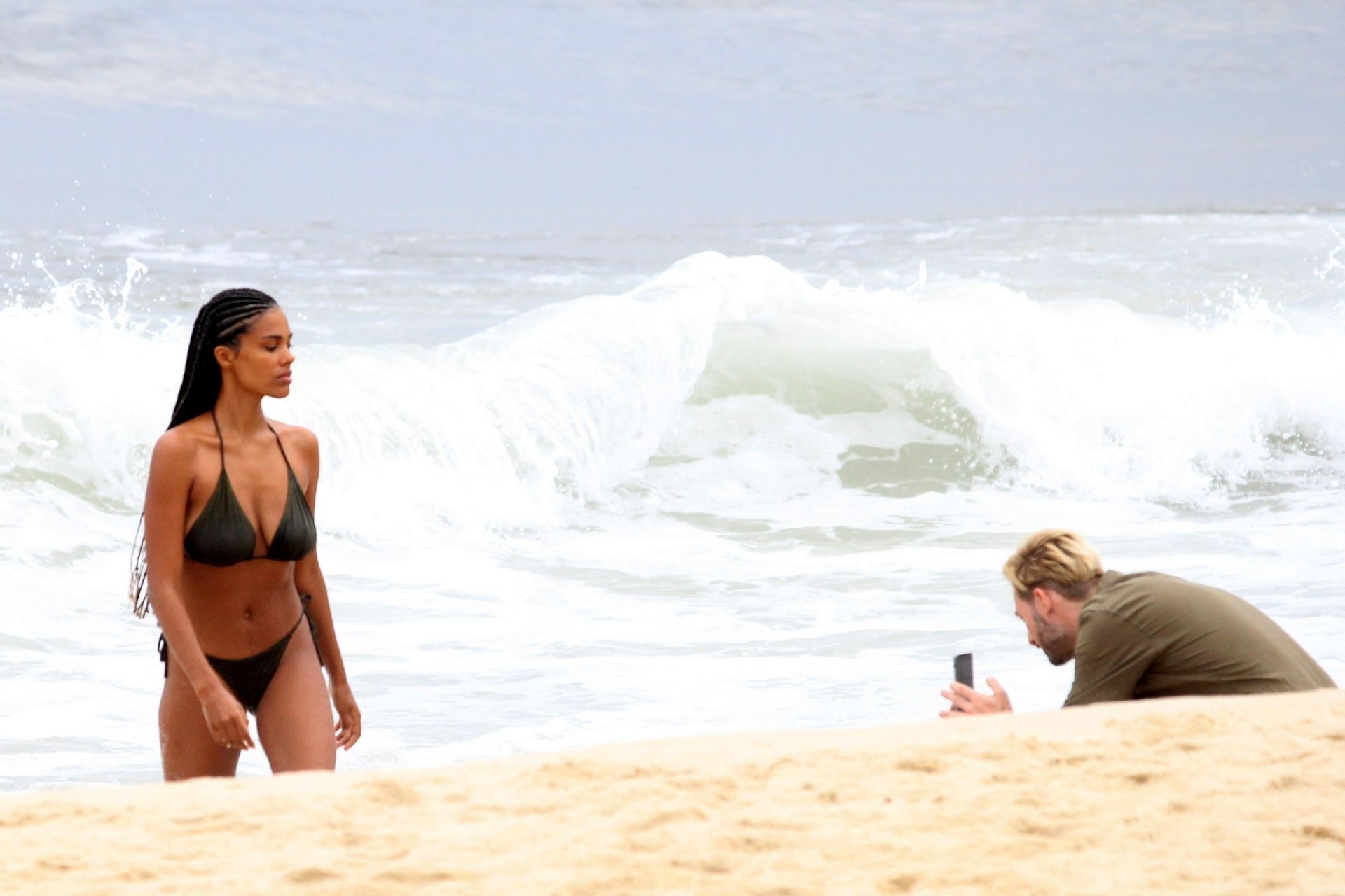 La femme de Vincent Cassel, Tina Kunakey, est accompagnée d’une amie pour une journée à la plage à Rio de Janeiro, le 21/02/2020. Le mannequin, portant un bikini noir, est allée se baigner tout en montrant ses nouvelles tresses.