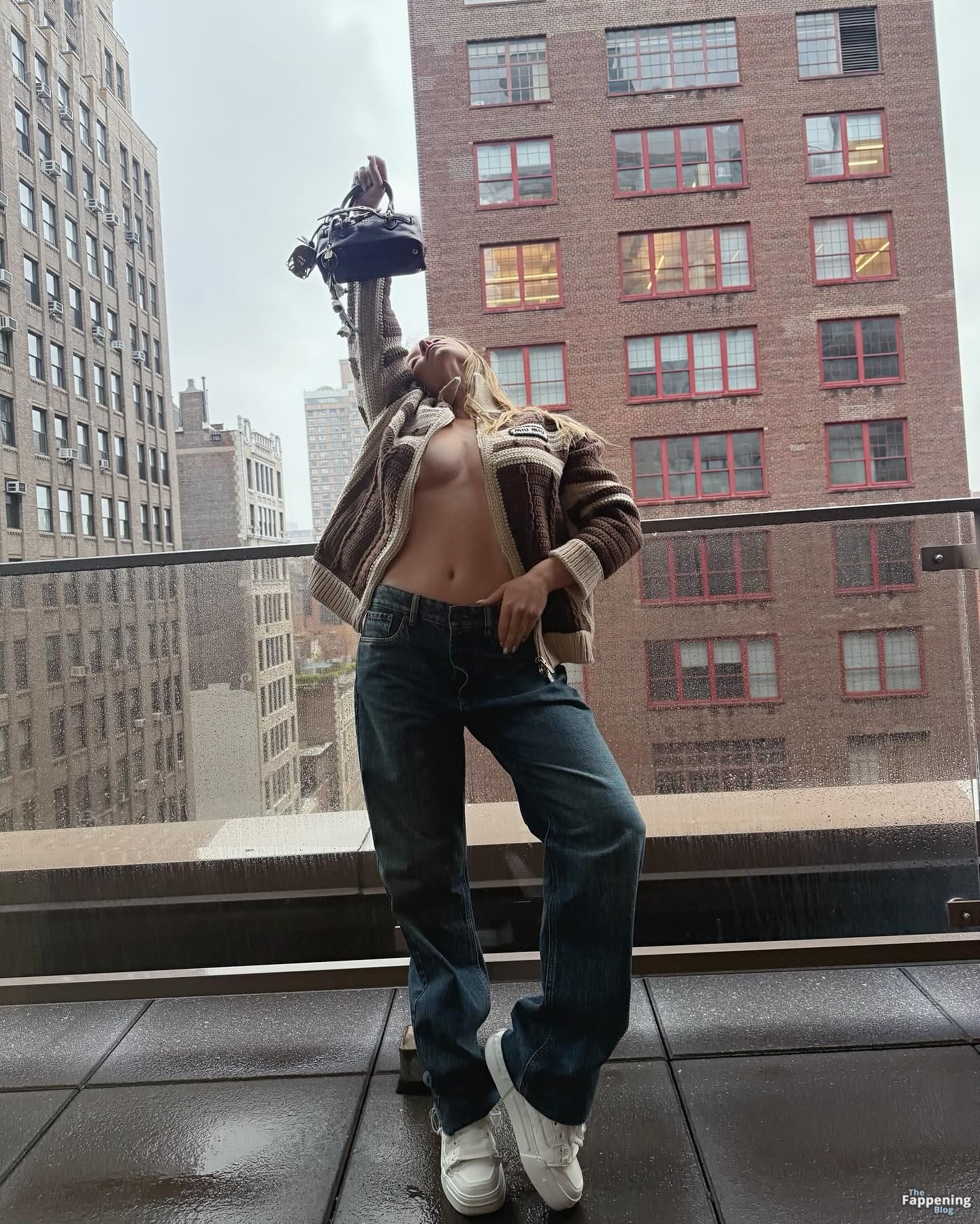 L’actrice et star du Fappening Sydney Sweeney, qui est une véritable vedette de la série télévisée Euphoria, vient de publier des photos ultra sexy et une vidéo d’elle-même en train de se détendre sur un balcon lors d’une journée pluvieuse à New York. Elle porte un cardigan en cachemire marron foncé de Miu Miu, sans soutien-gorge, mettant en valeur ses atouts.