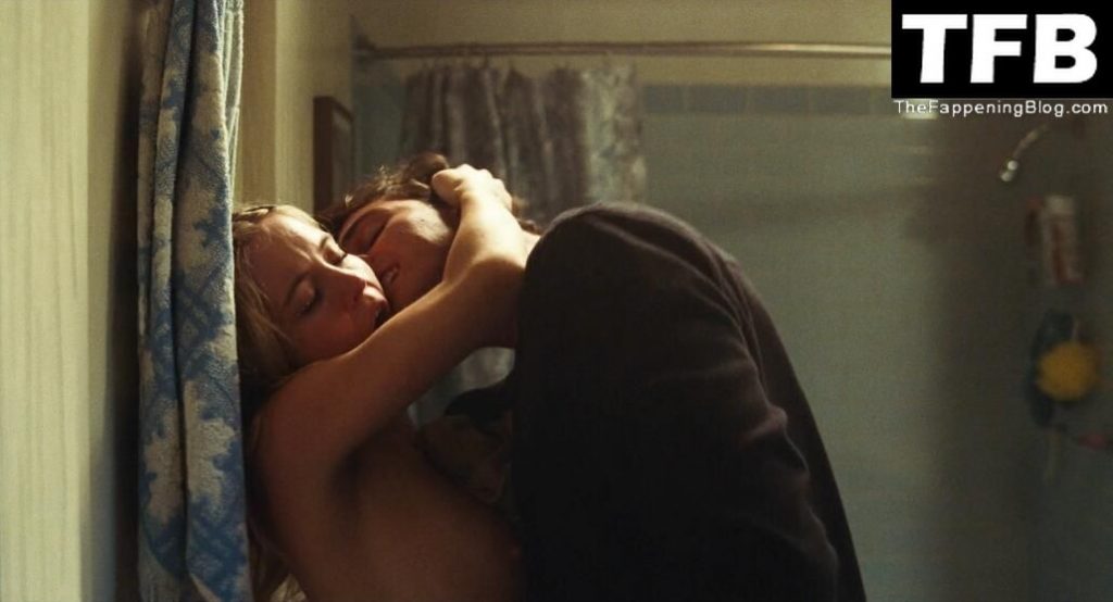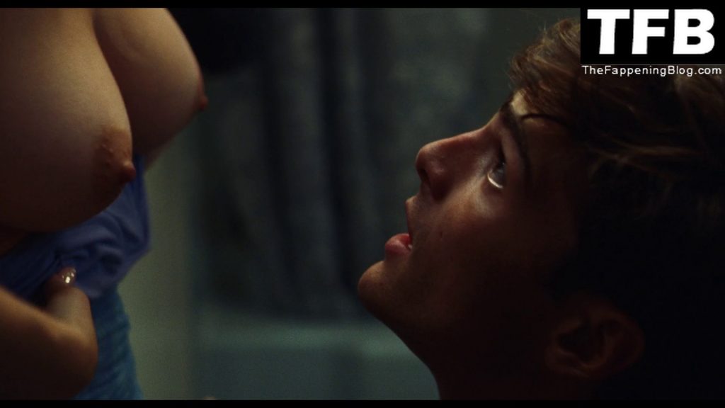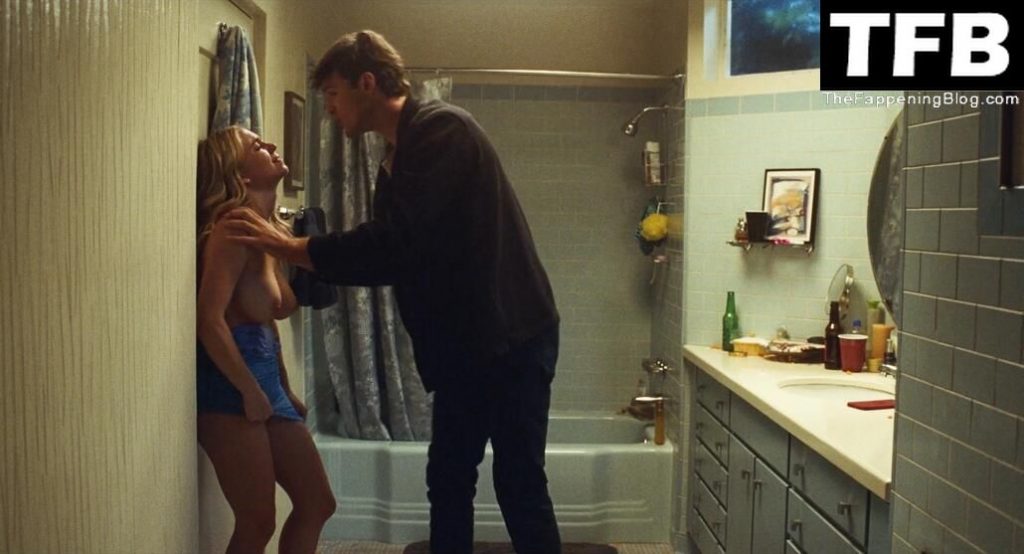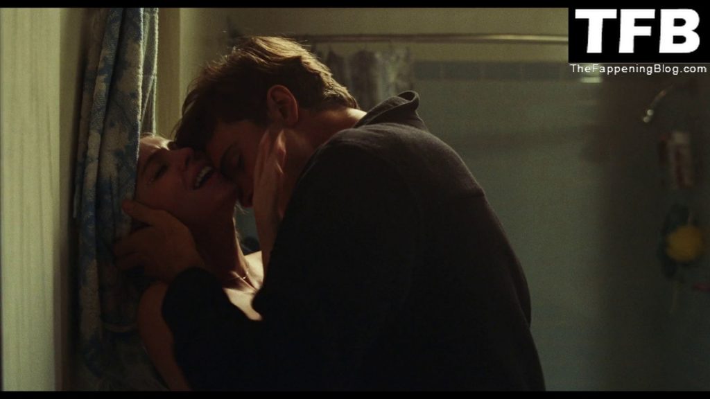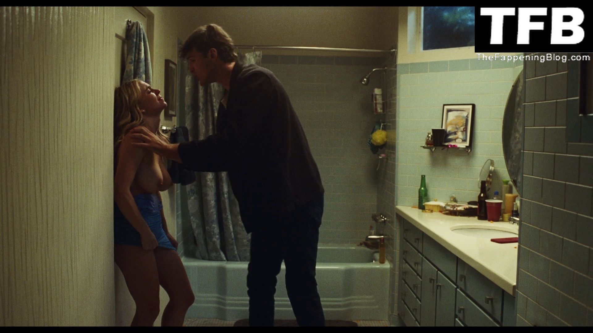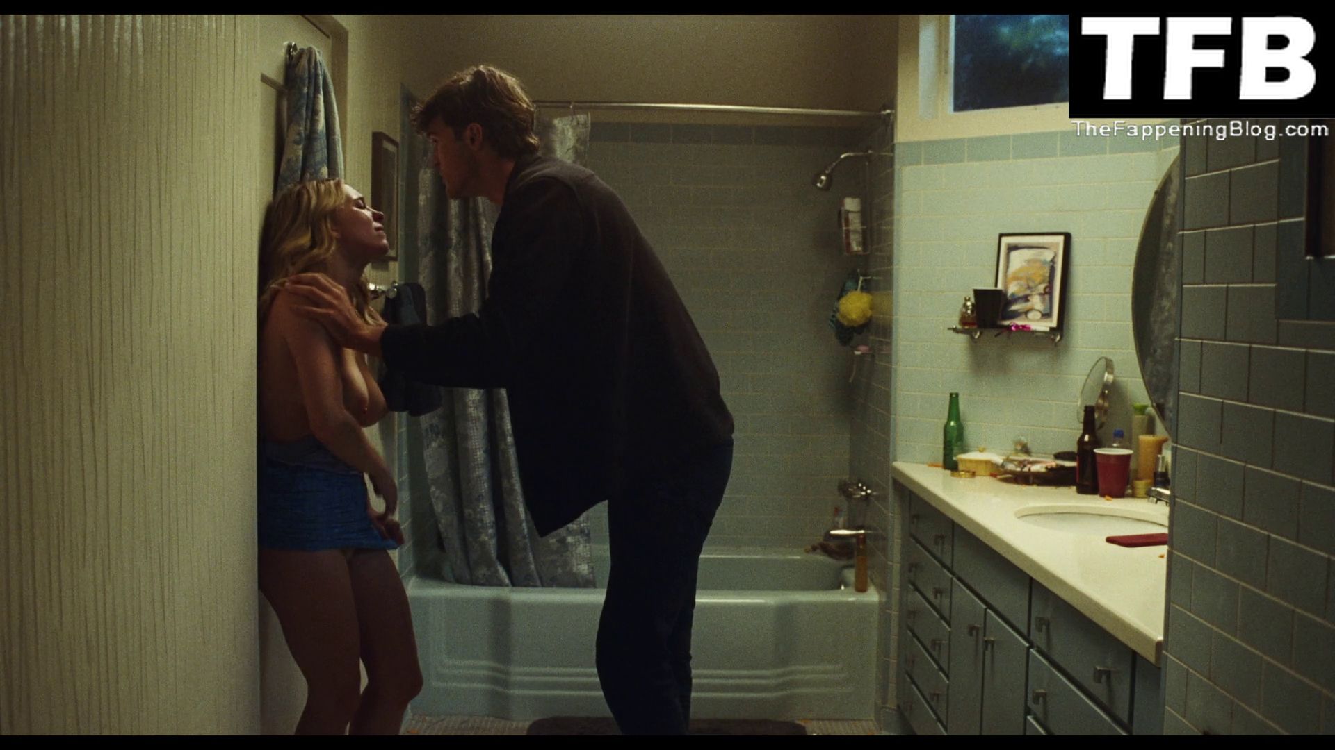 Sydney Sweeney s’embrasse avec un homme contre une porte dans une salle de bain lors d’une fête à la maison, sa robe bleue baissée à la taille tandis que l’homme lui saisit le sein. Elle et l’homme sont ensuite interrompus par des coups frappés à la porte de la salle de bain, et nous voyons Sydney topless de profil pendant un moment alors qu’elle a peur d’être surprise et que l’homme essaie de la calmer et de la faire taire.