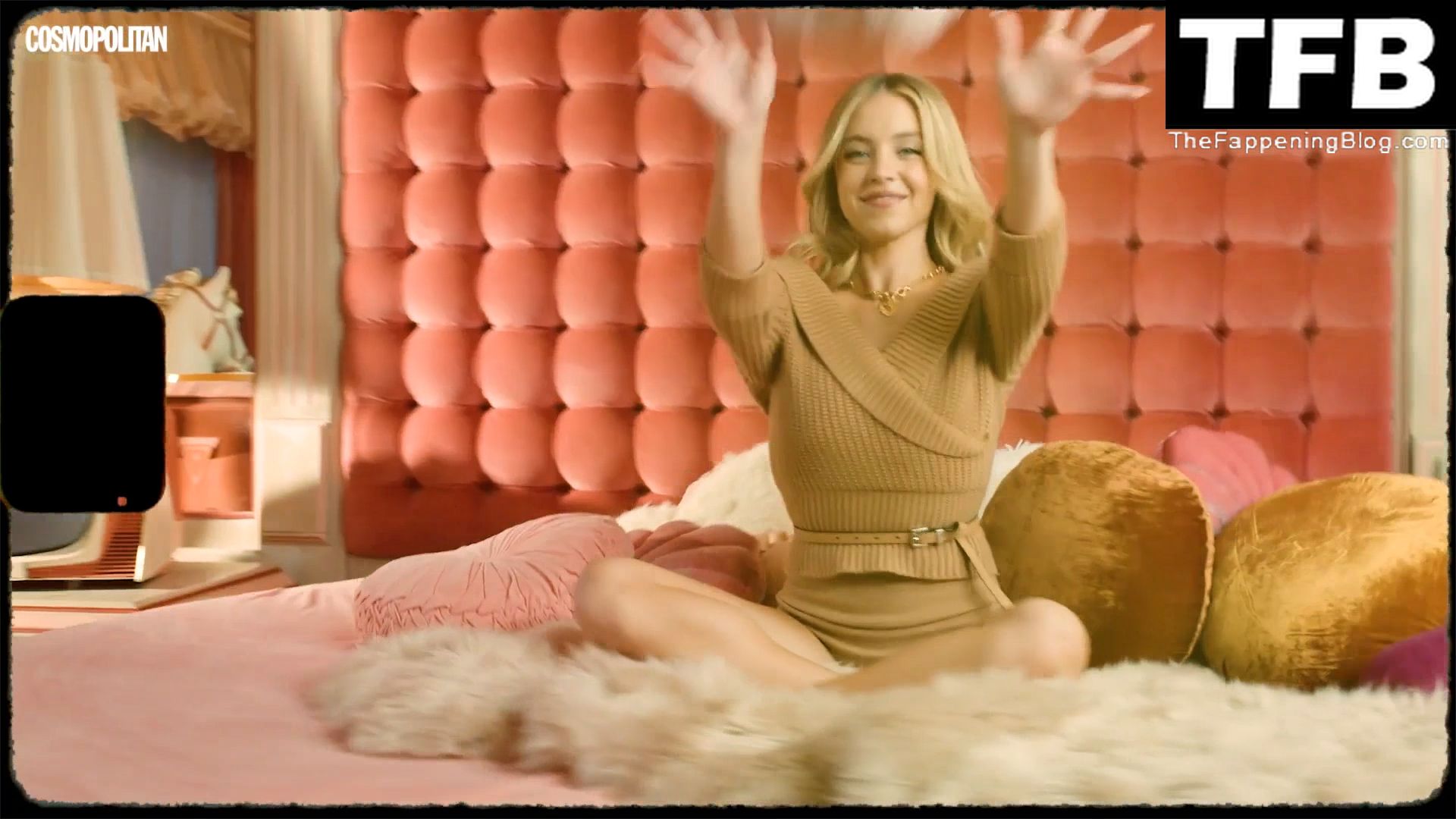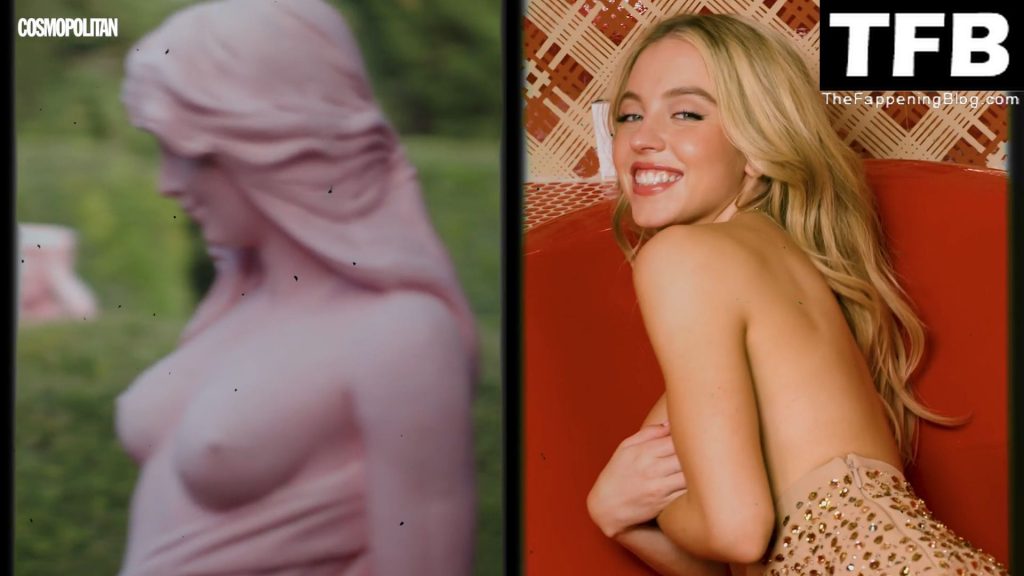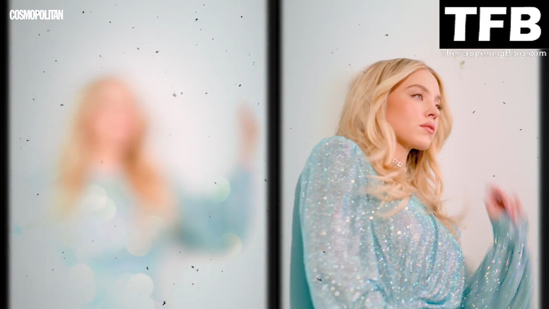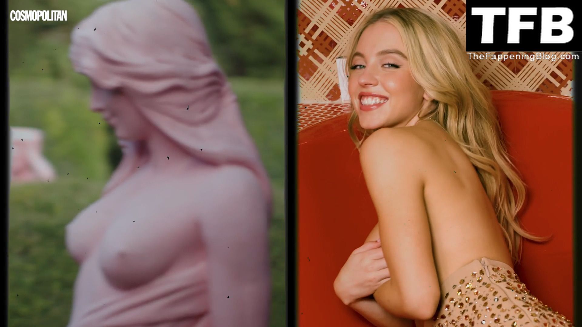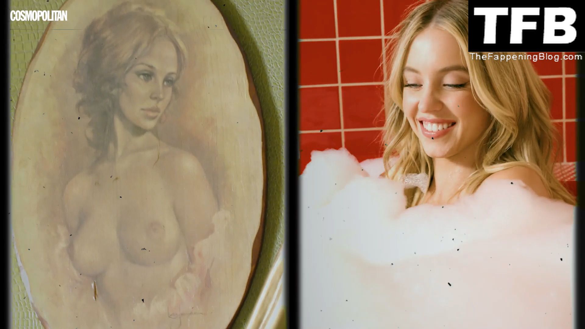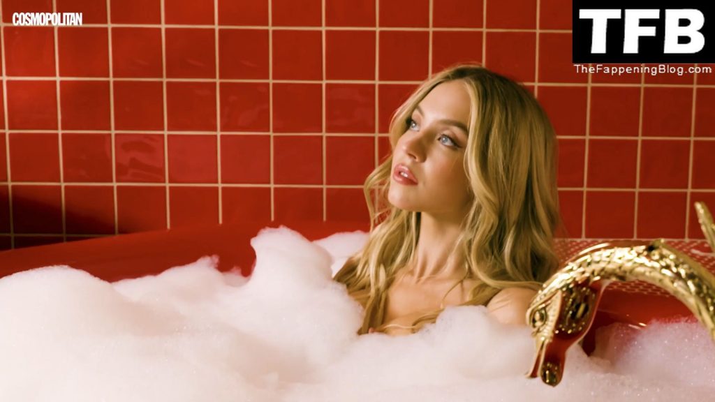 L’actrice Sydney Sweeney pose topless en portant un slip scintillant orné de strass dans une séance photo rétro dans une baignoire pour Cosmopolitan (2022).