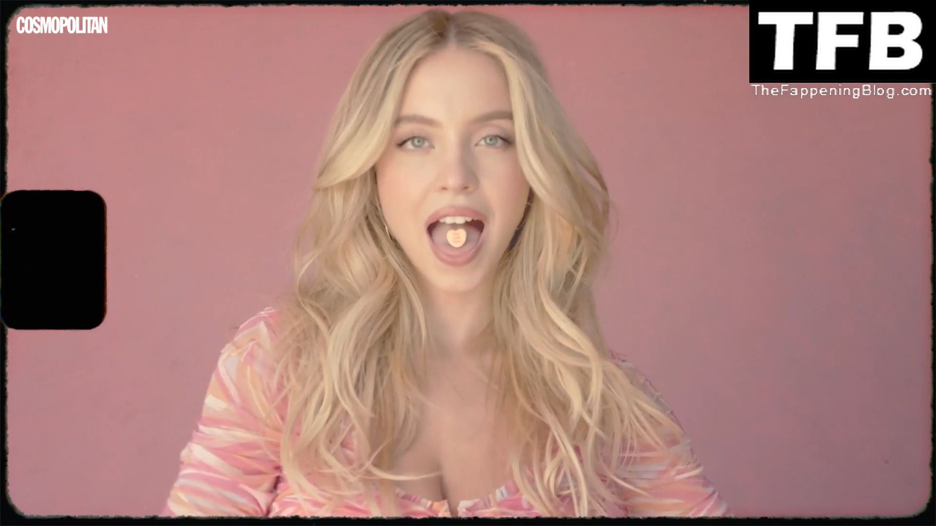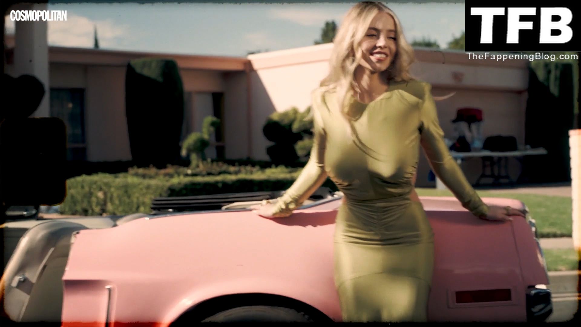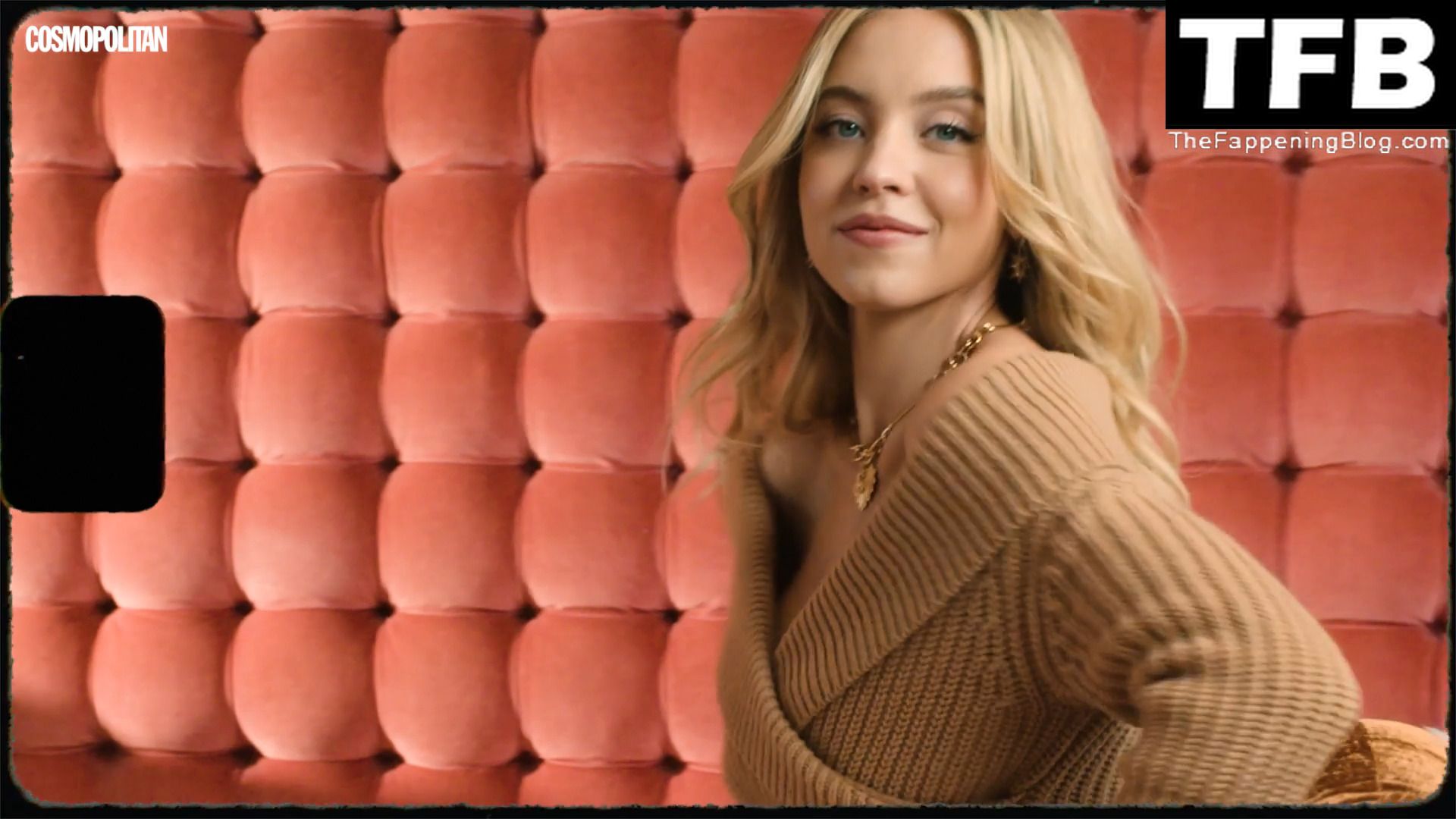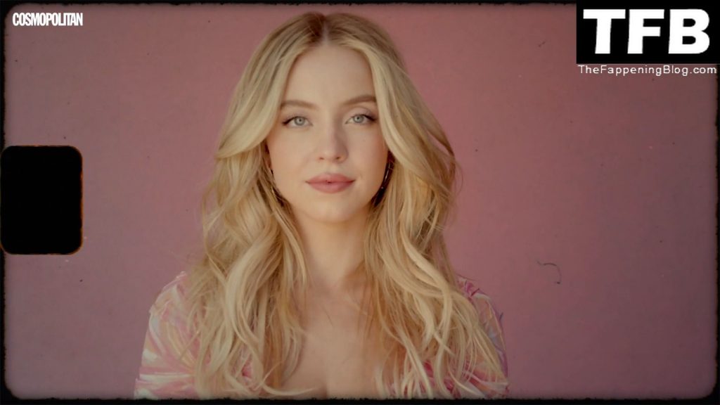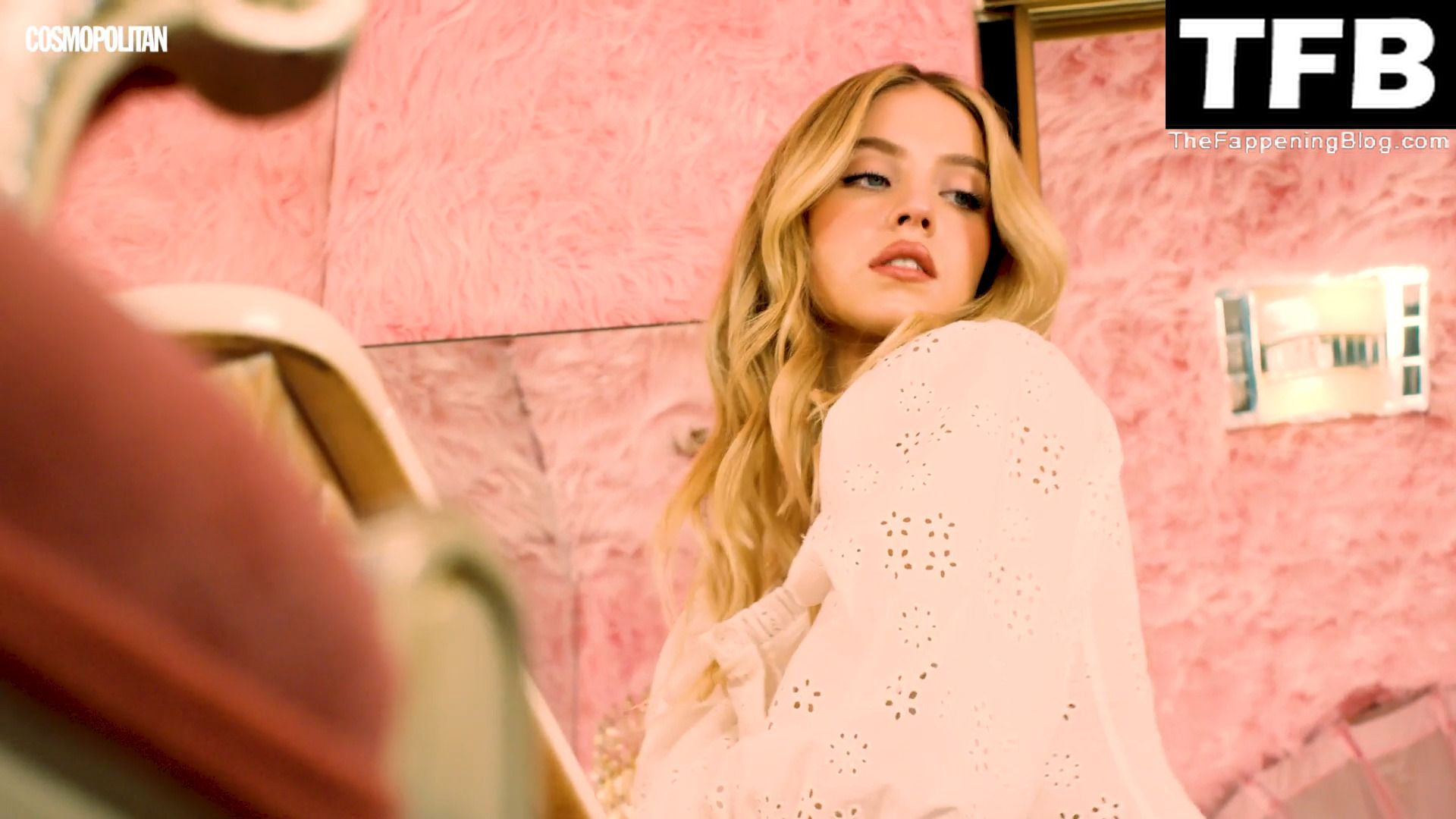 L’actrice Sydney Sweeney pose topless en portant un slip scintillant orné de strass dans une séance photo rétro dans une baignoire pour Cosmopolitan (2022).