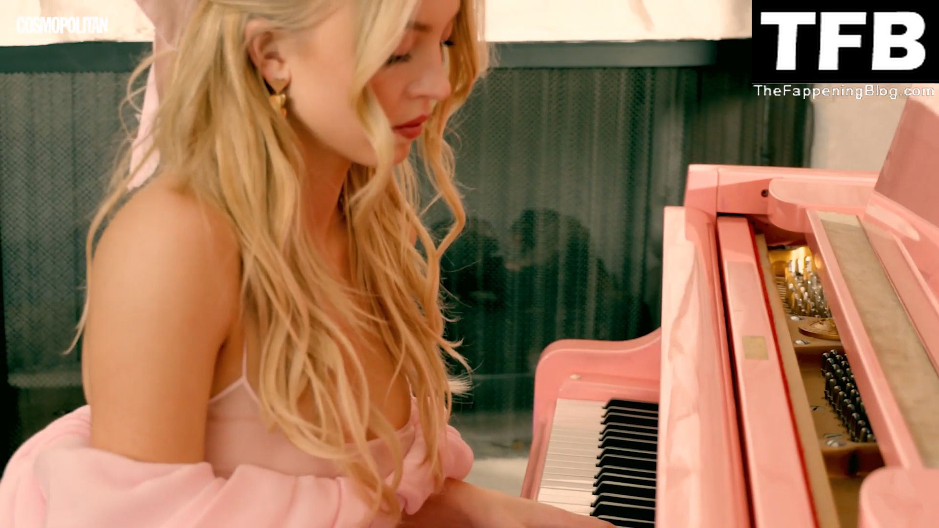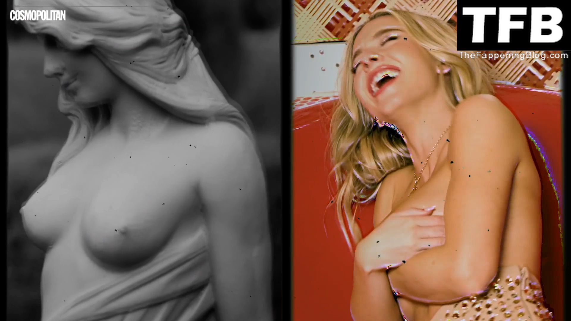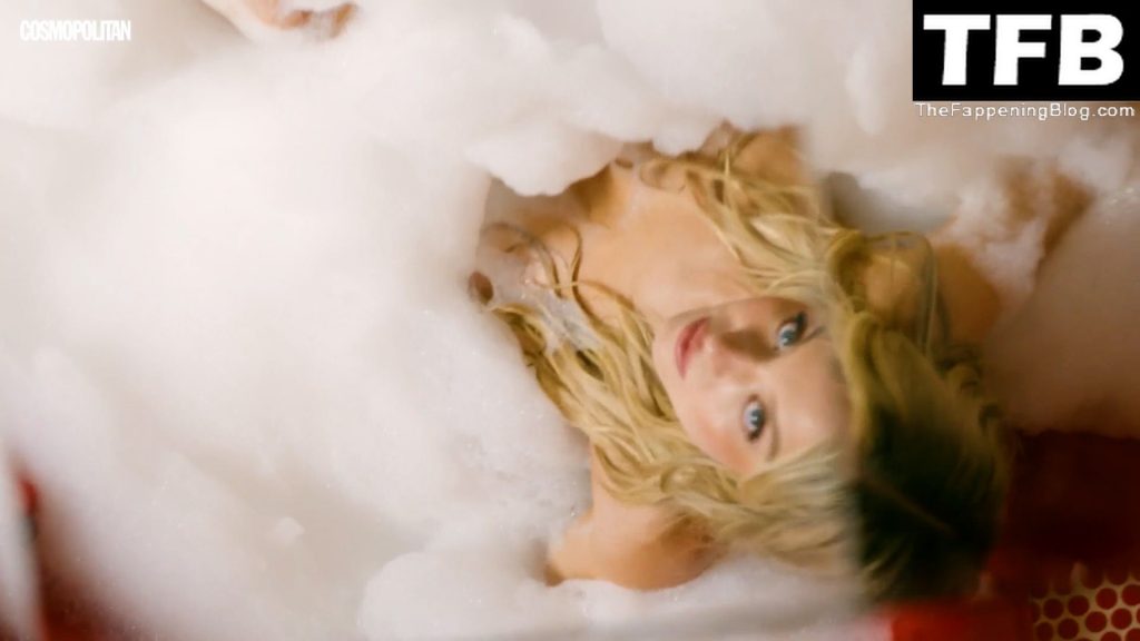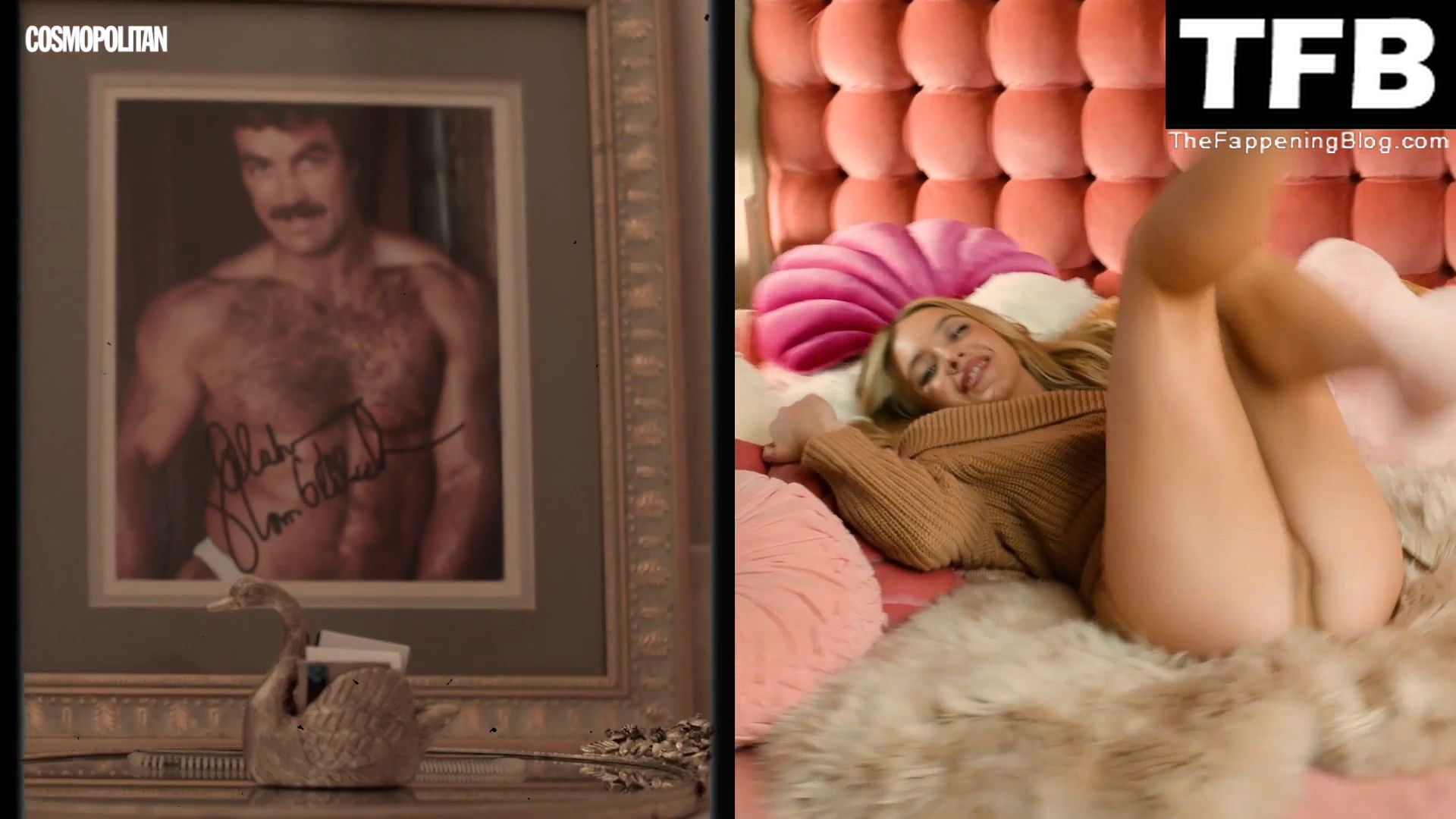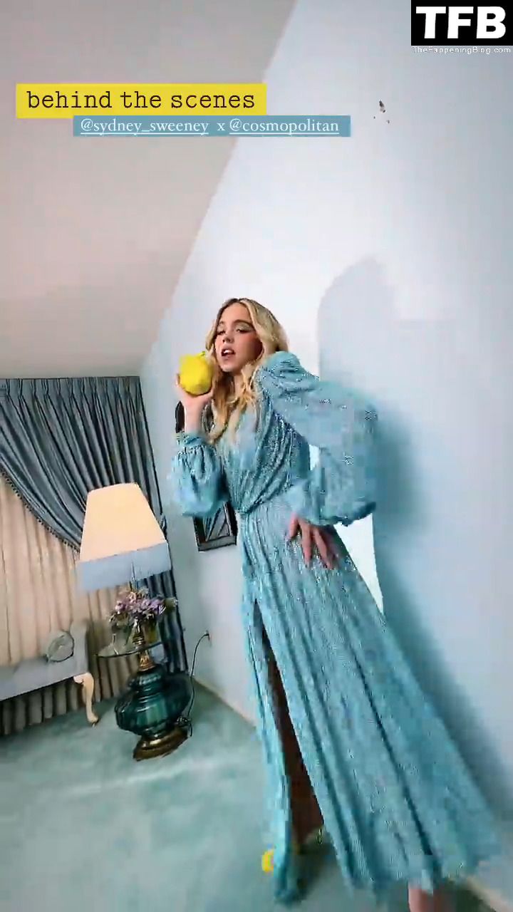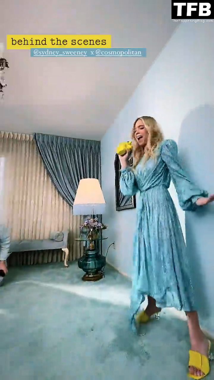 L’actrice Sydney Sweeney pose topless en portant un slip scintillant orné de strass dans une séance photo rétro dans une baignoire pour Cosmopolitan (2022).