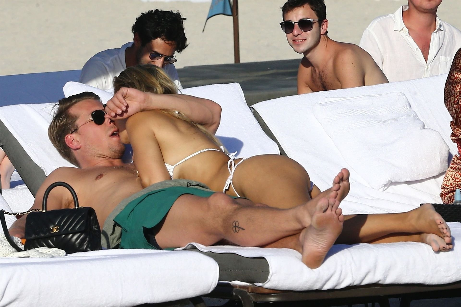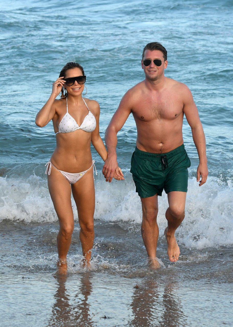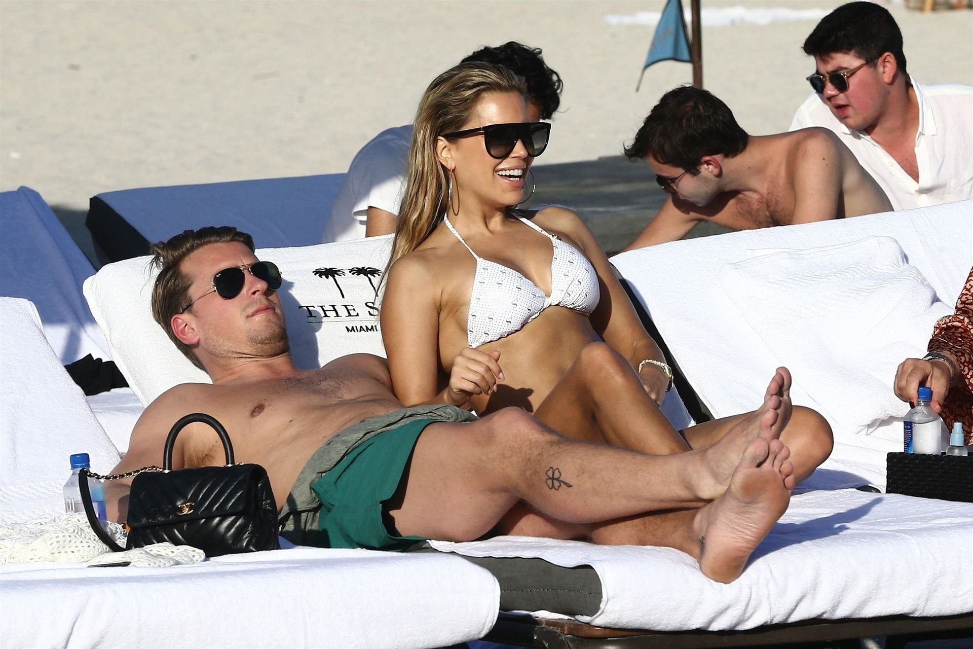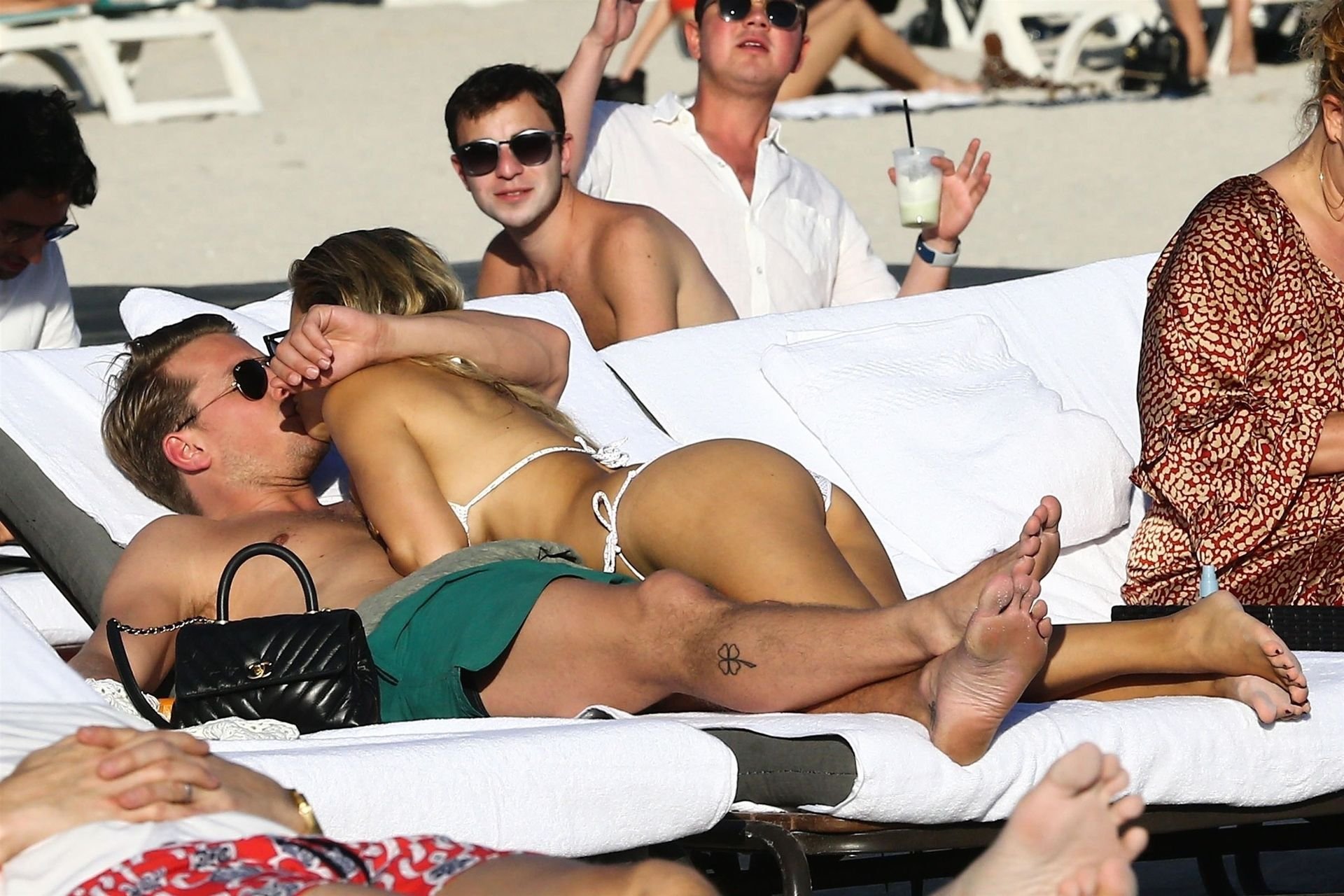 Sylvie Meis porte un bikini blanc révélateur alors qu’elle enlace ses jambes autour de son petit ami Bart Willemsen lors d’une séance de maquillage torride sur la plage de Miami le jour de l’An, 01/01/2019.