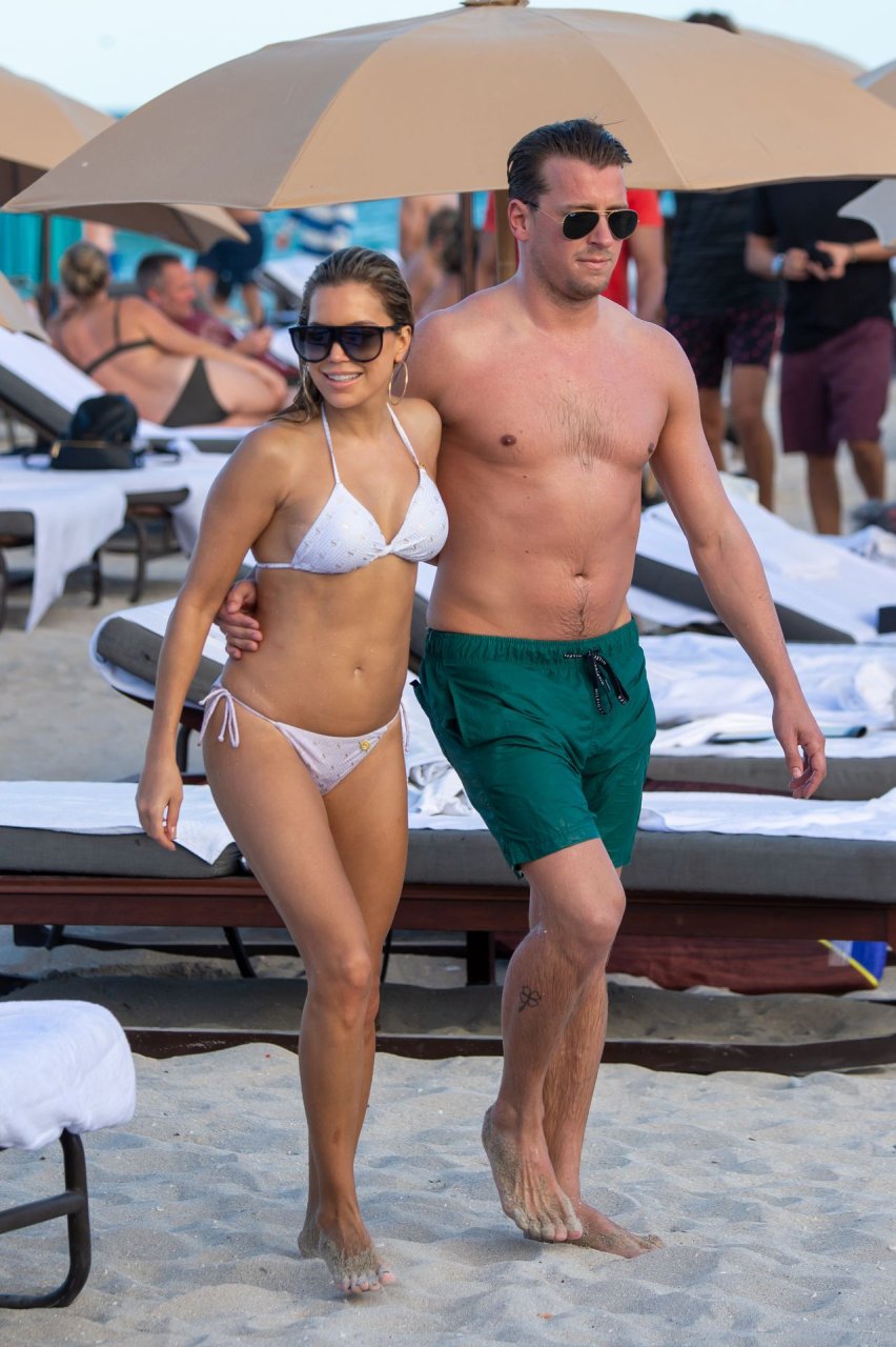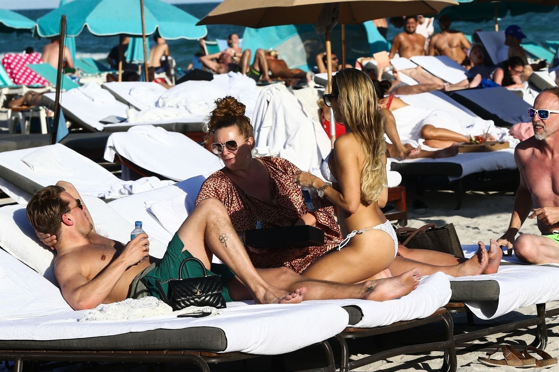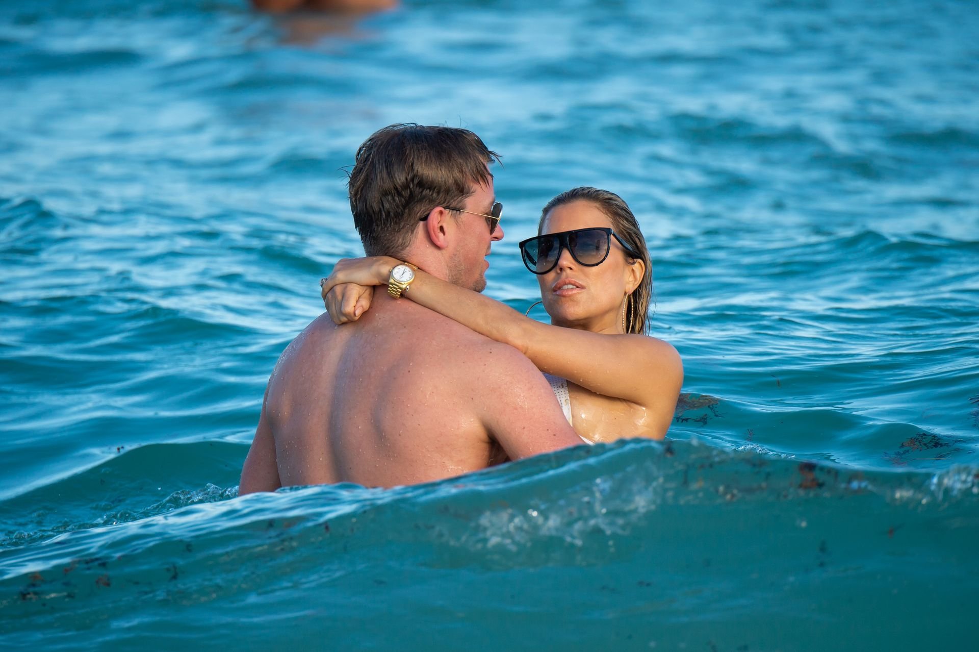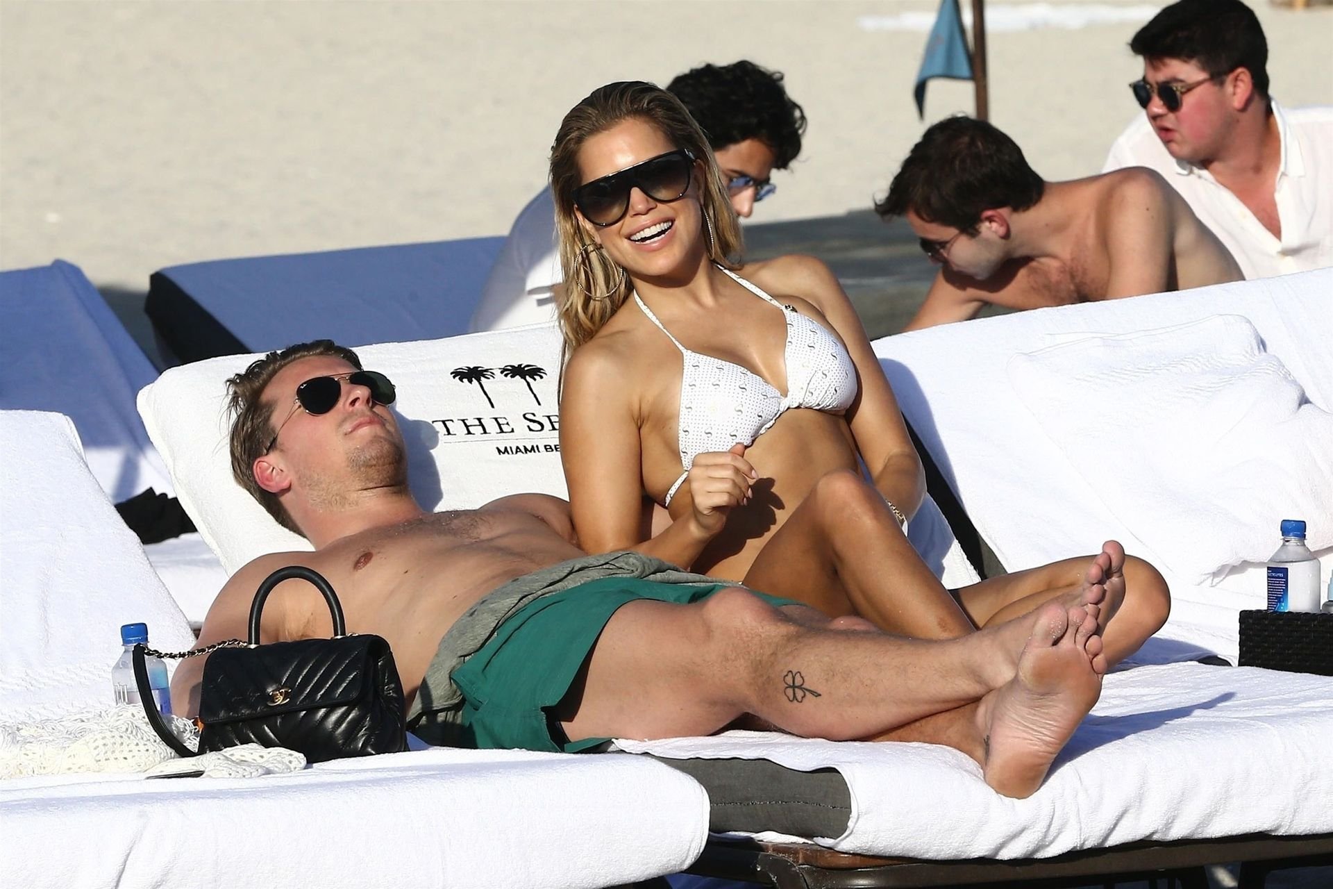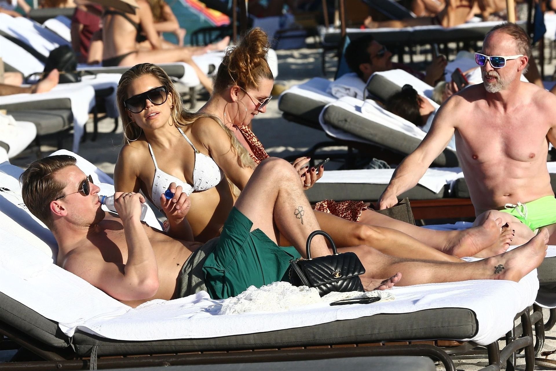 Sylvie Meis porte un bikini blanc révélateur alors qu’elle enlace ses jambes autour de son petit ami Bart Willemsen lors d’une séance de maquillage torride sur la plage de Miami le jour de l’An, 01/01/2019.