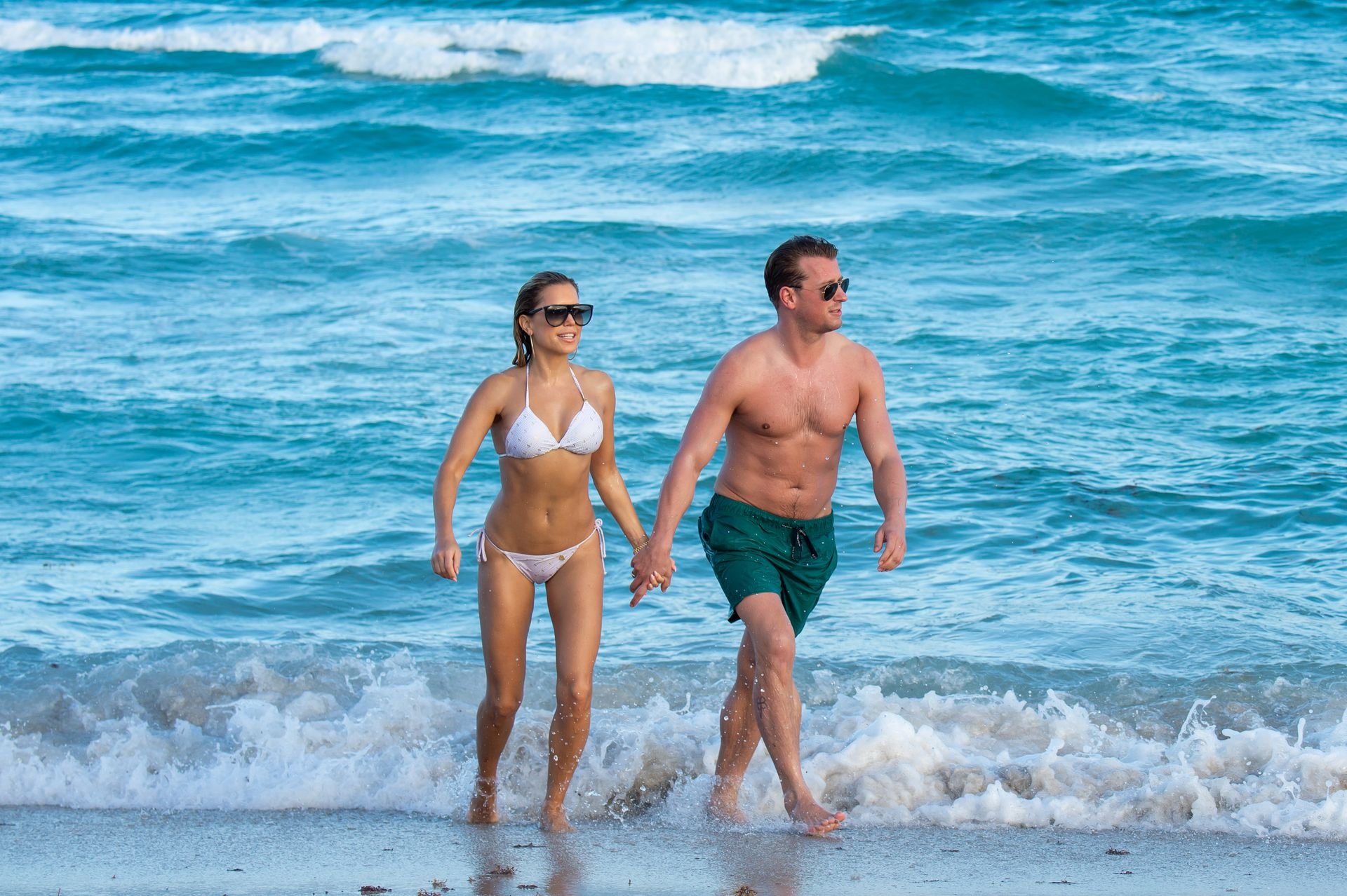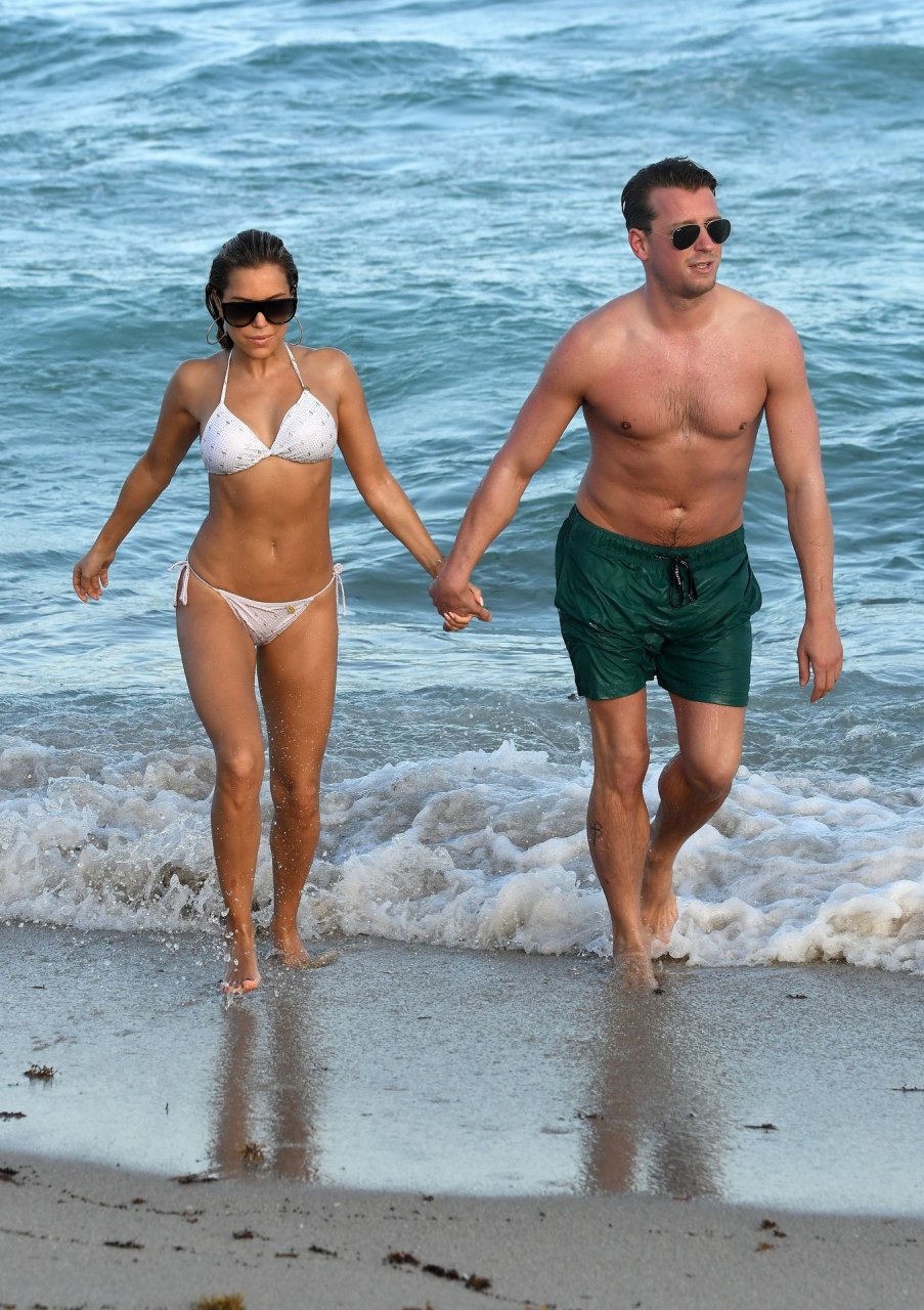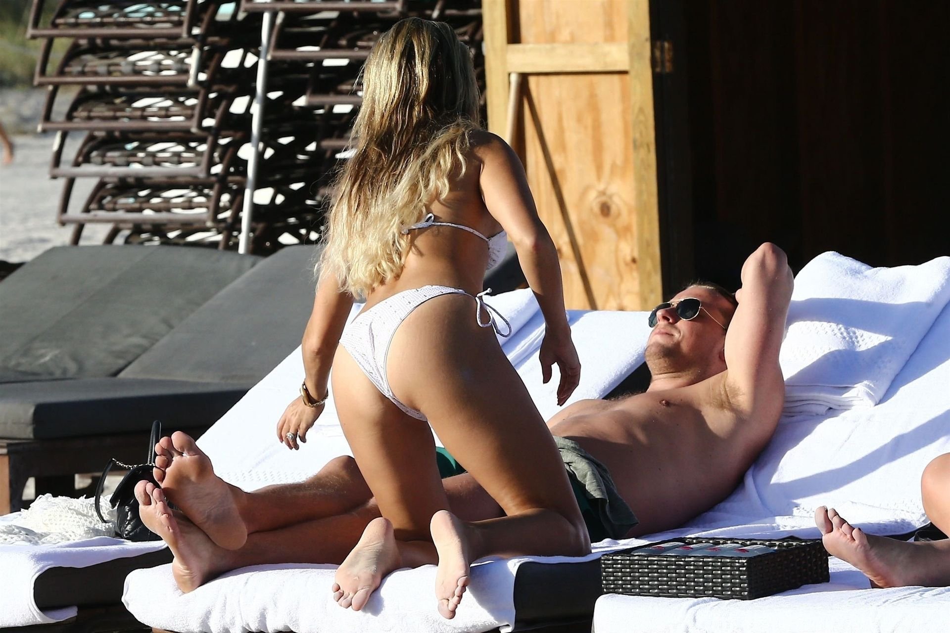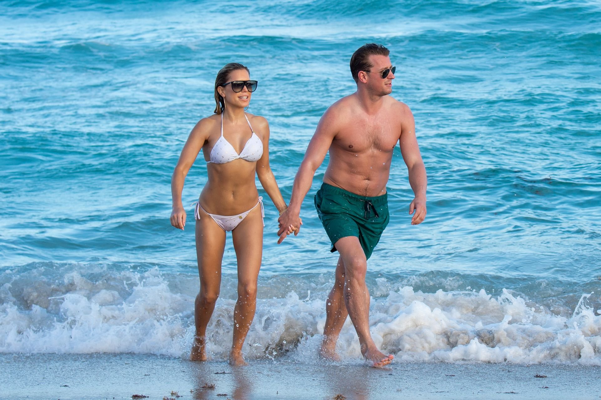 Sylvie Meis porte un bikini blanc révélateur alors qu’elle enlace ses jambes autour de son petit ami Bart Willemsen lors d’une séance de maquillage torride sur la plage de Miami le jour de l’An, 01/01/2019.