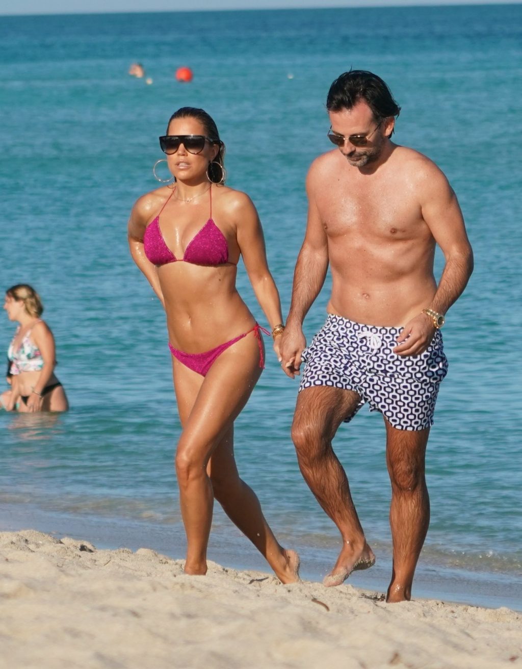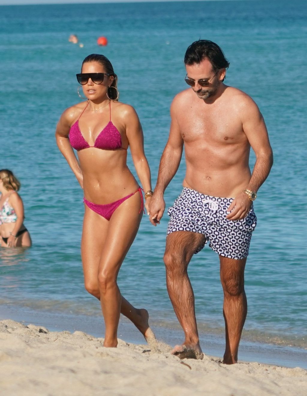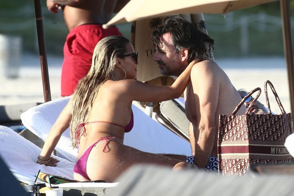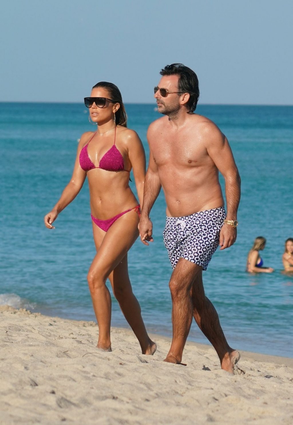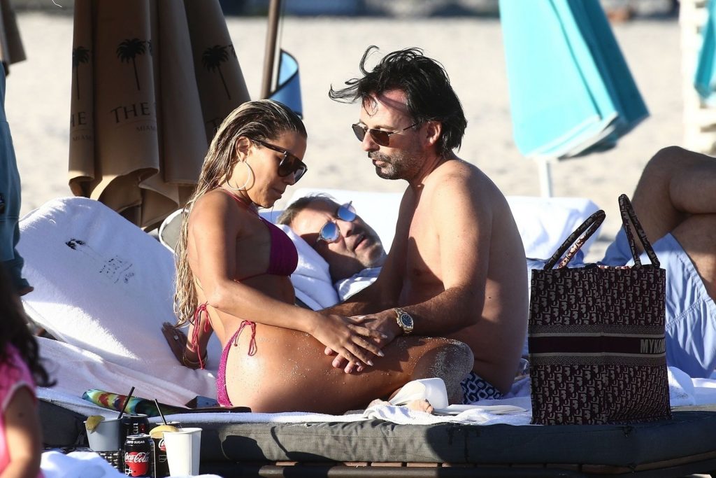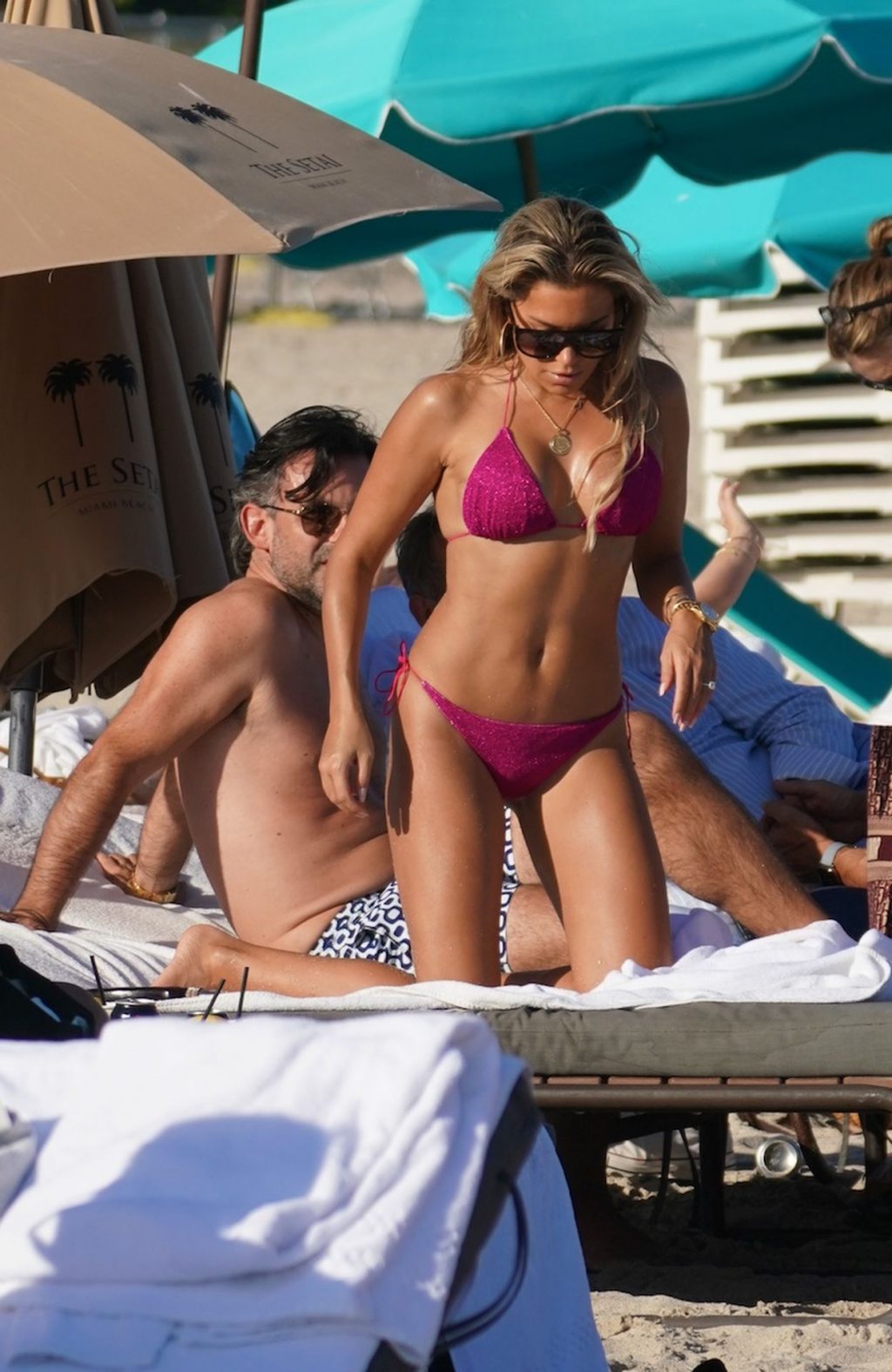 Sylvie Meis, 41 ans, a été photographiée en bikini violet sur la plage de Miami Beach, le 02/12/2019. Sylvie a fait un plongeon dans l’océan avec son fiancé et a profité du soleil sur les plages de Miami.