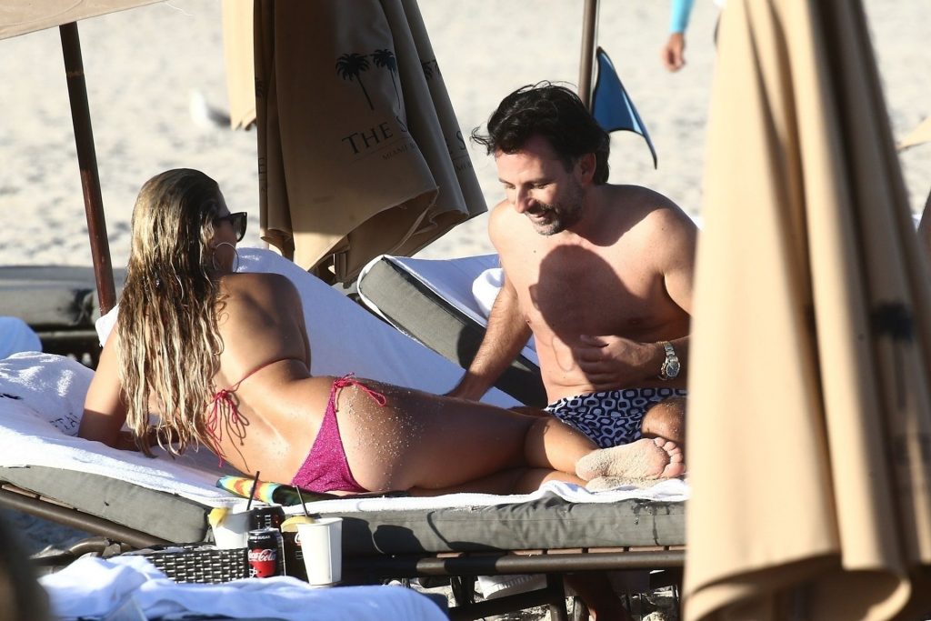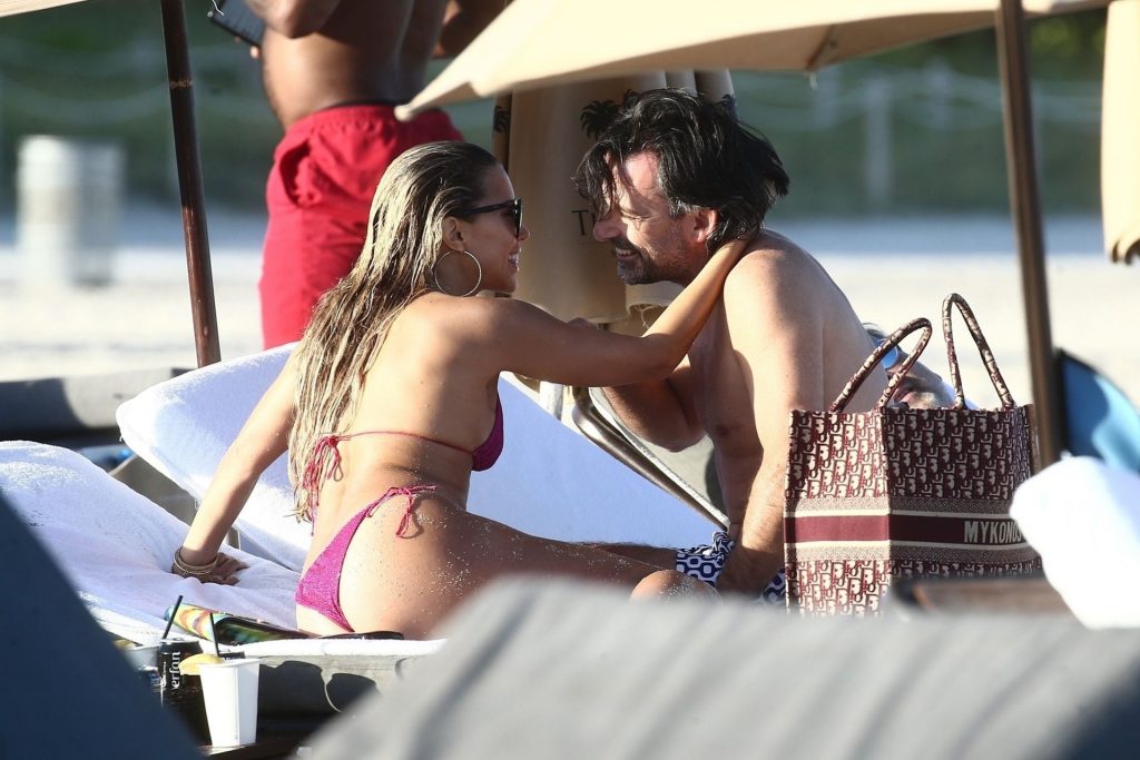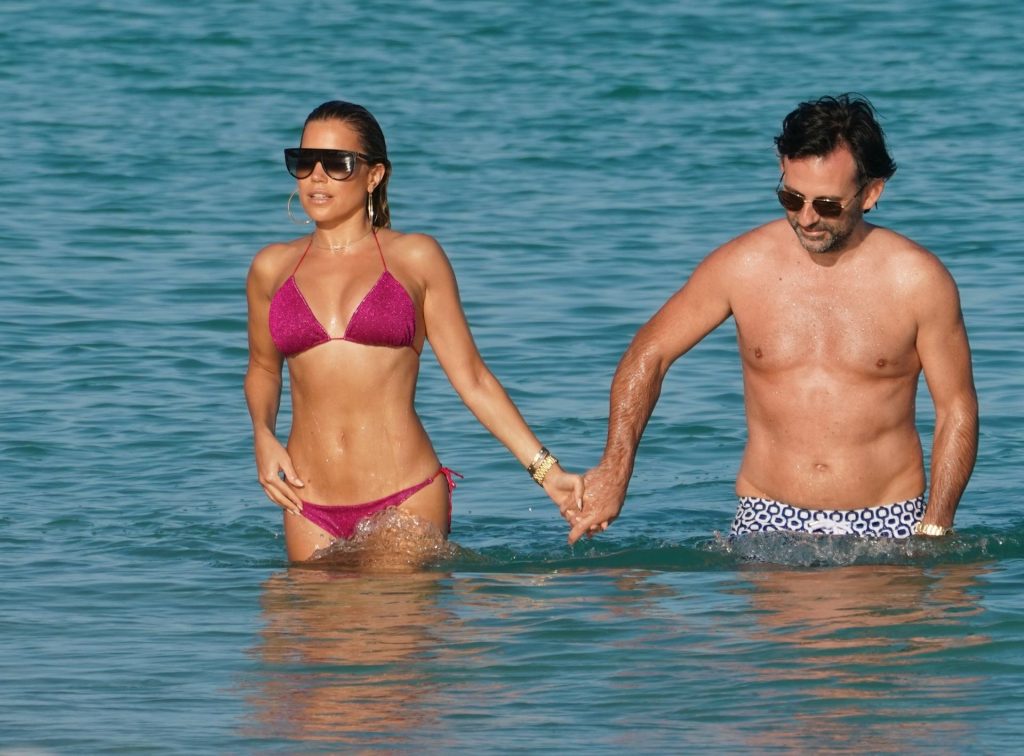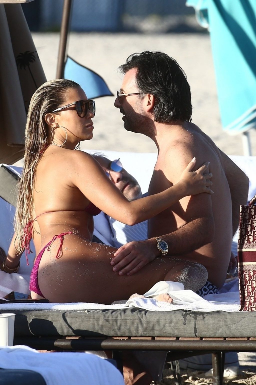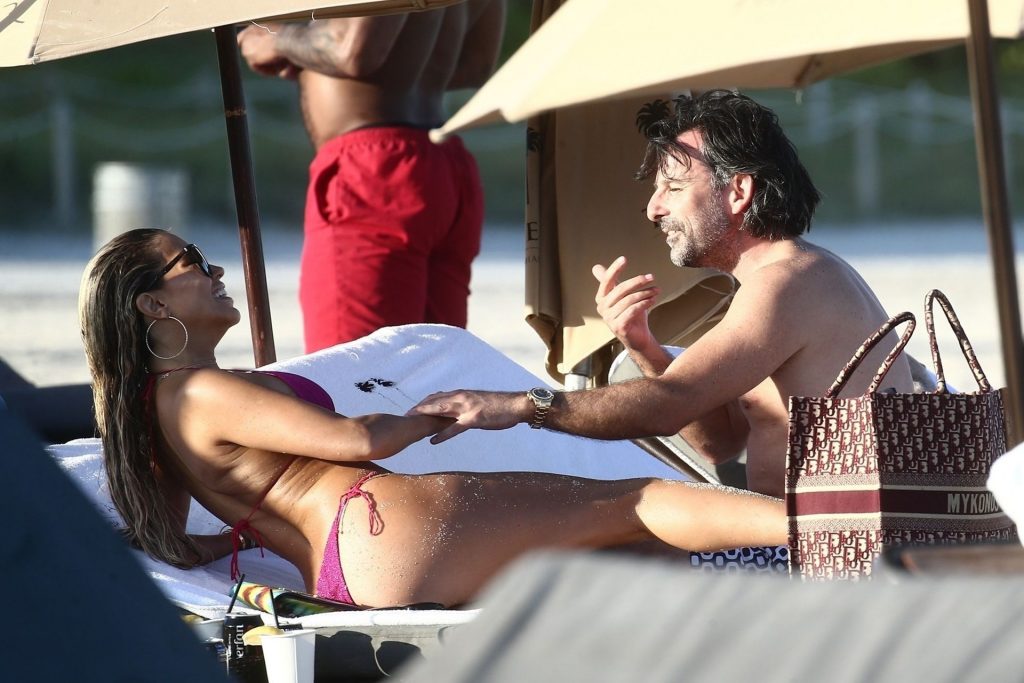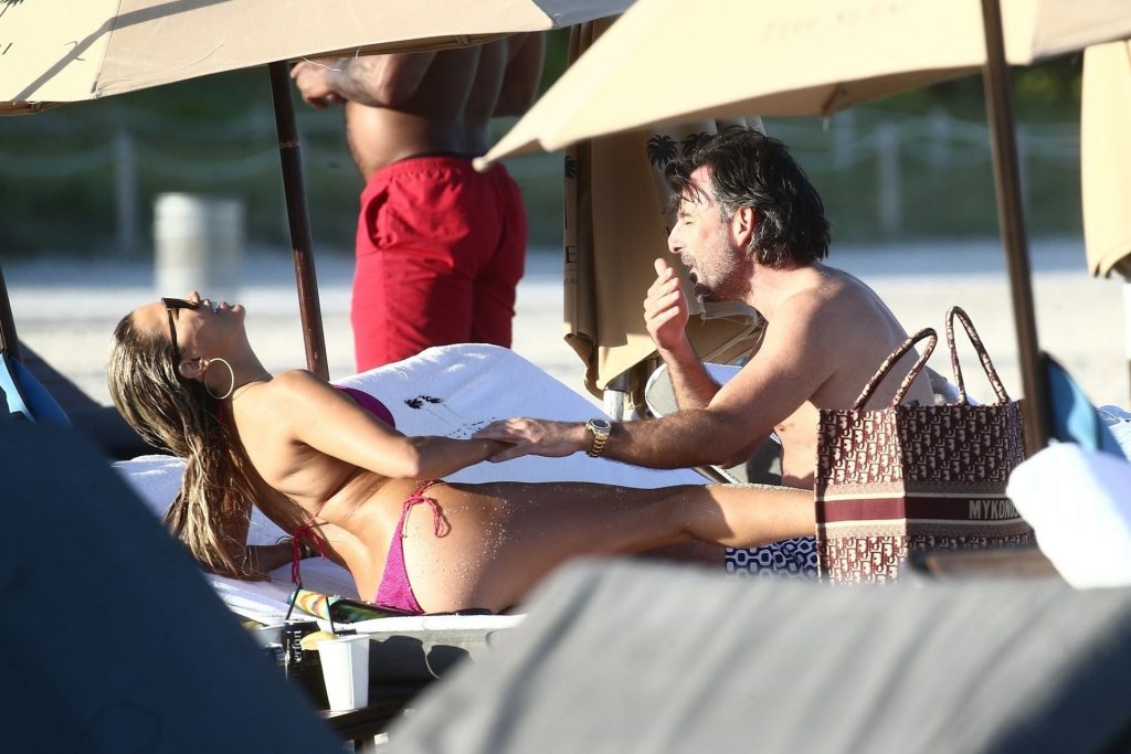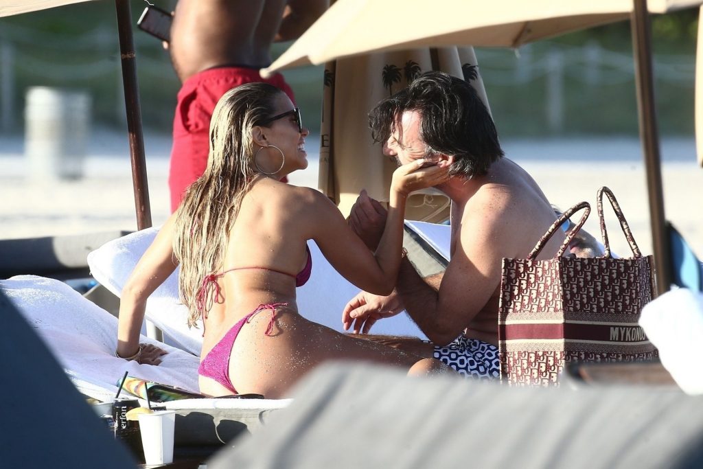 Sylvie Meis, 41 ans, a été photographiée en bikini violet sur la plage de Miami Beach, le 02/12/2019. Sylvie a fait un plongeon dans l’océan avec son fiancé et a profité du soleil sur les plages de Miami.