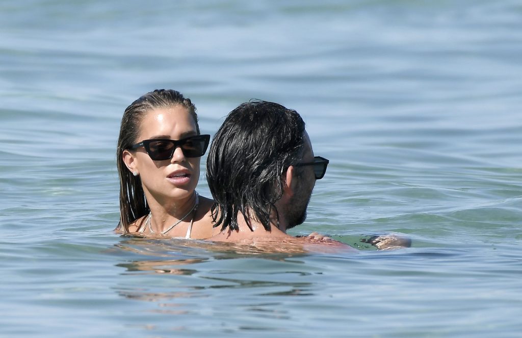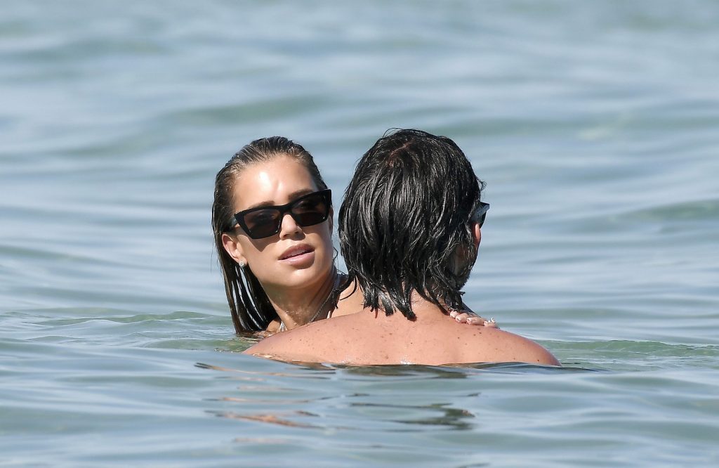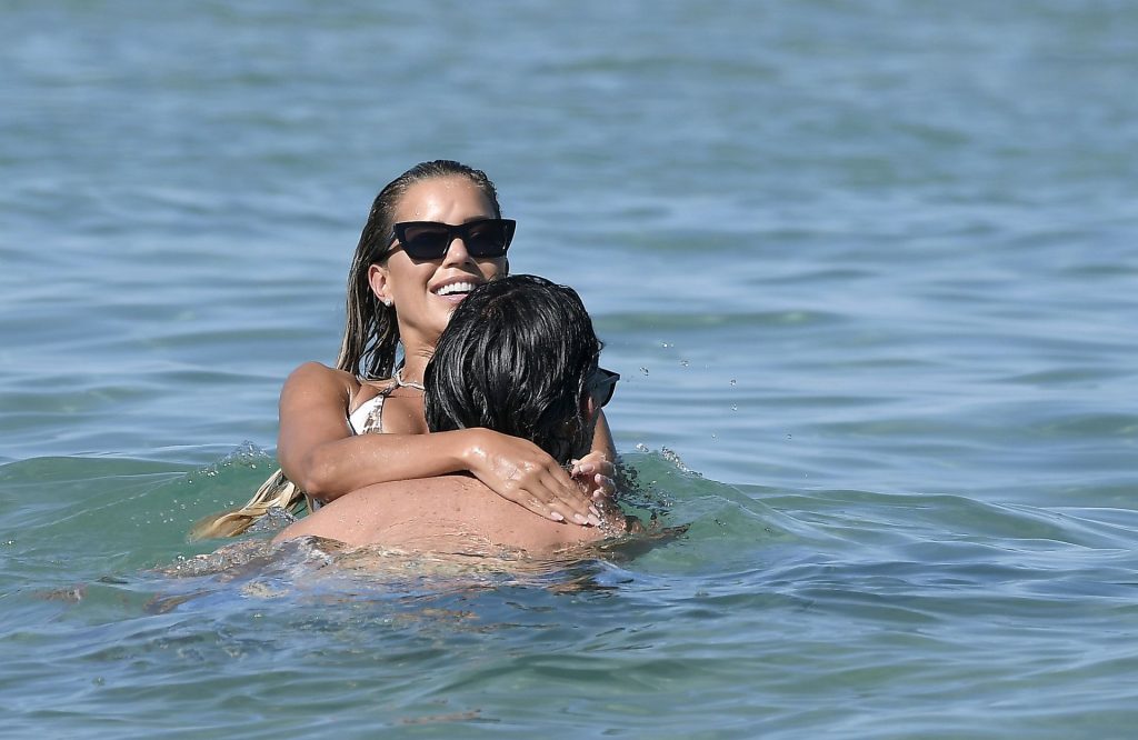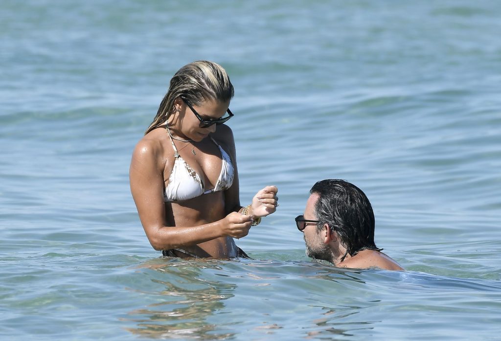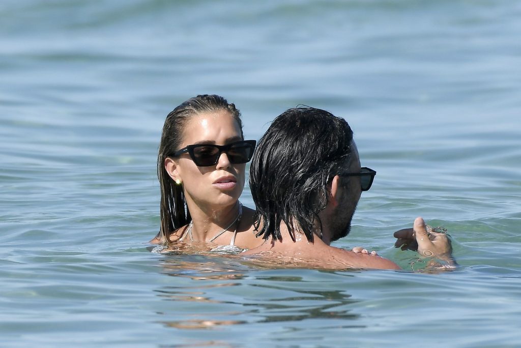 Sylvie Meis, récemment fiancée, exhibe son incroyable corps sexy en bikini tout en profitant du soleil avec son nouvel amour, l’artiste Niclas Castello, à la plage La Reserve à Saint-Tropez, le 08/07/2020.