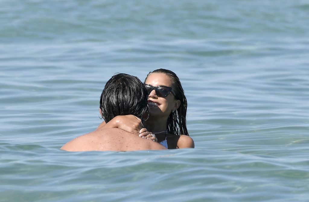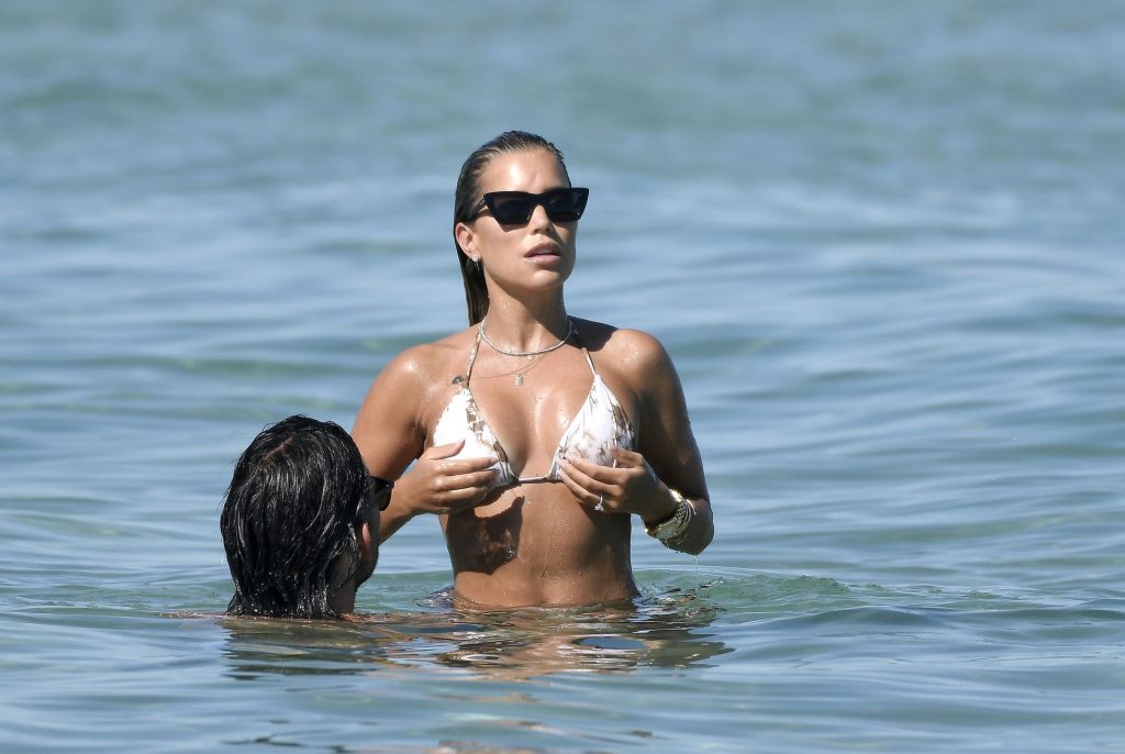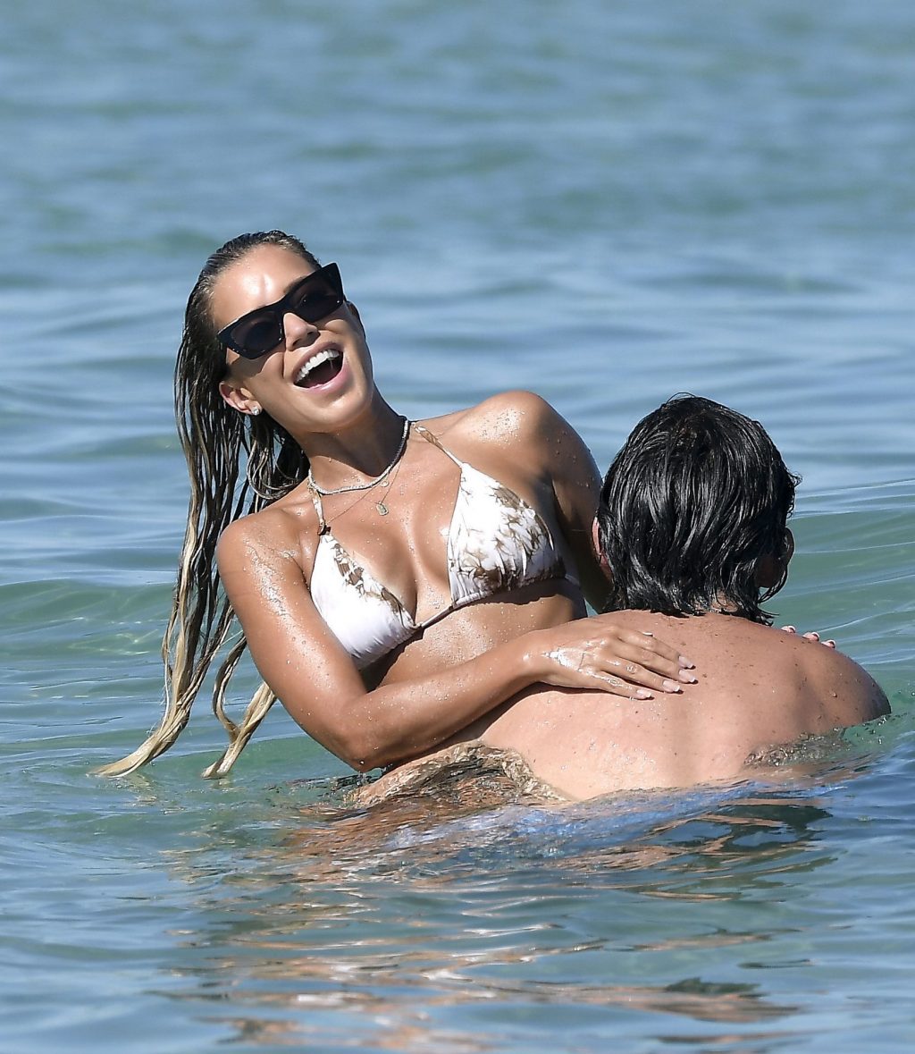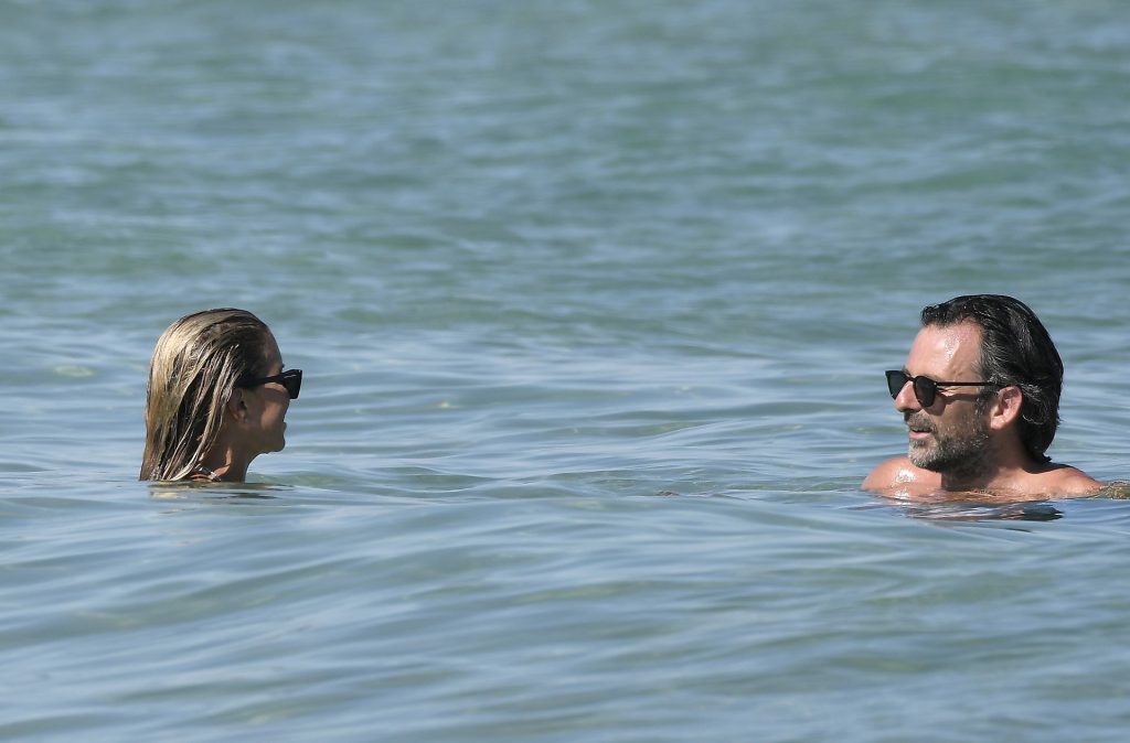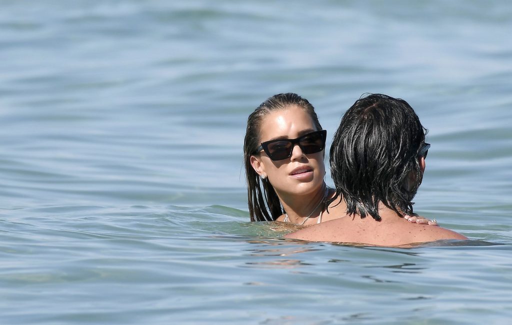 Sylvie Meis, récemment fiancée, exhibe son incroyable corps sexy en bikini tout en profitant du soleil avec son nouvel amour, l’artiste Niclas Castello, à la plage La Reserve à Saint-Tropez, le 08/07/2020.