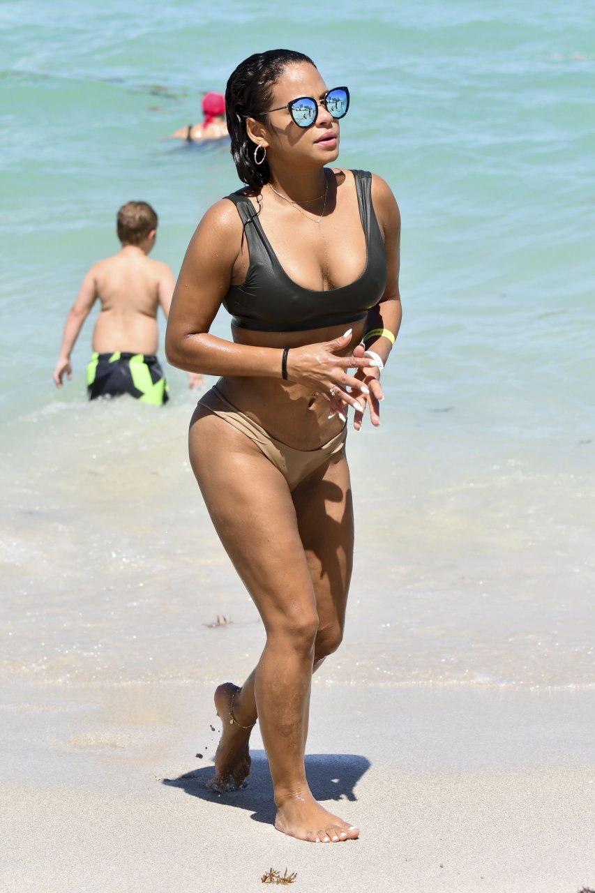 Christina Milian porte un maillot de bain coloré dans son hôtel à Miami, 16/07/2017. Christina Milian est une chanteuse-compositrice et actrice américaine. Âge : 35 ans.