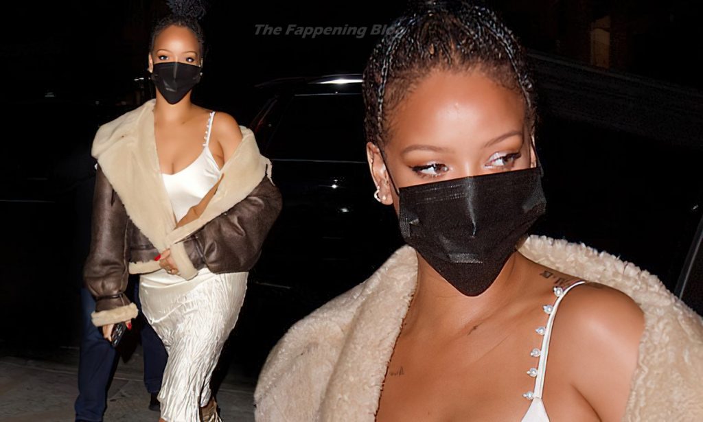 La star du Fappening et chanteuse Rihanna montre son décolleté alors qu’elle arrive dans un restaurant de LA vêtue d’une robe en satin ivoire moulante et d’une veste aviateur.