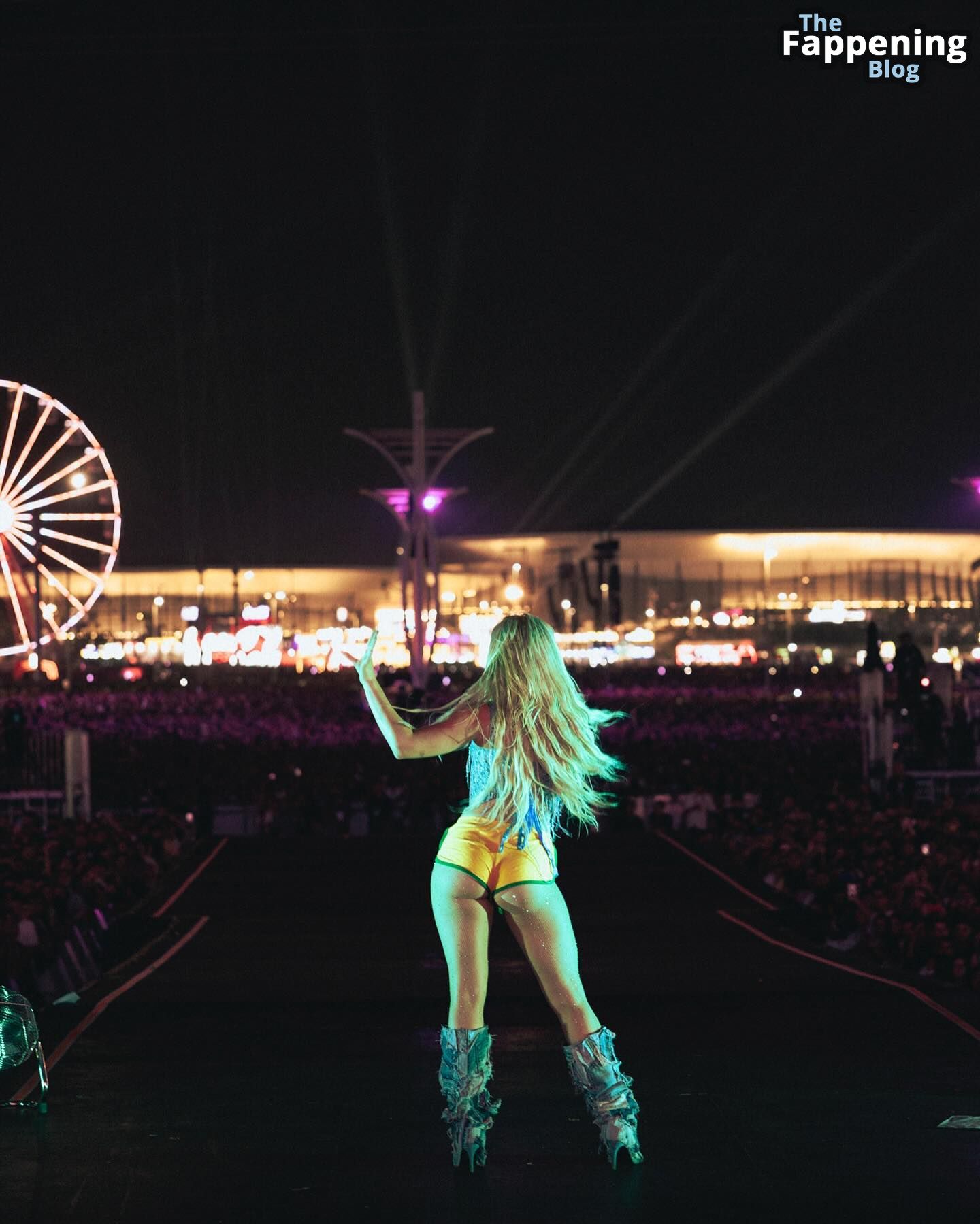 La chanteuse, qui a toujours aimé faire des choix de mode audacieux, s’est vraiment surpassée cette fois en montant sur scène dans une tenue qui restera gravée dans la mémoire du public pendant longtemps. Elle portait un short jaune très court, tout droit inspiré du style de l’équipe nationale brésilienne, qui couvrait à peine ses fesses, assorti à un crop top brillant orné de franges. C’était un look tout simplement incendiaire.