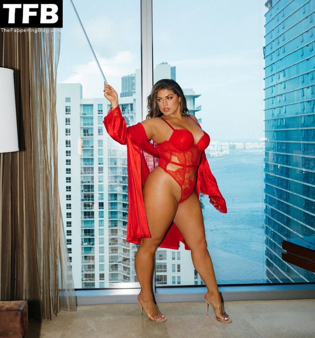 Gabriella Halikas montre son corps voluptueux, posant en lingerie rouge lors d’une séance photo à l’hôtel de Miami, le 17/11/2021.