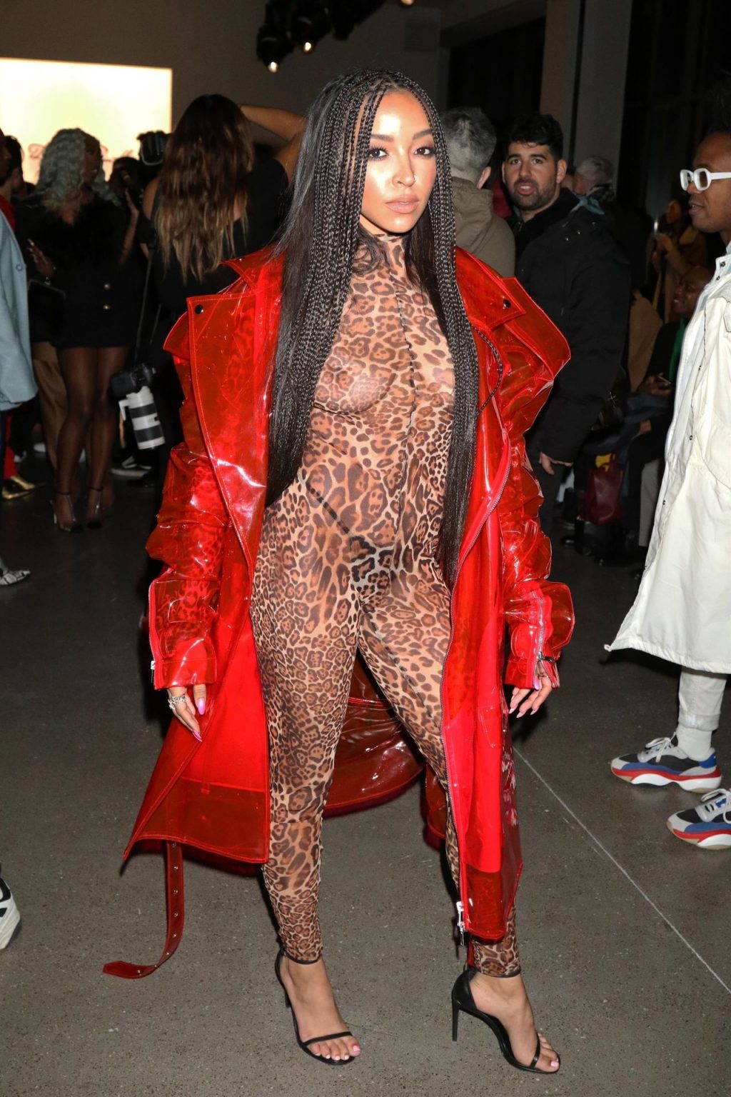 Tinashe a été photographiée dans un body transparent à imprimé léopard en arrivant au défilé LaQuan Smith pendant la NYFW 2020 aux Spring Studios à New York, le 08/02/2020.