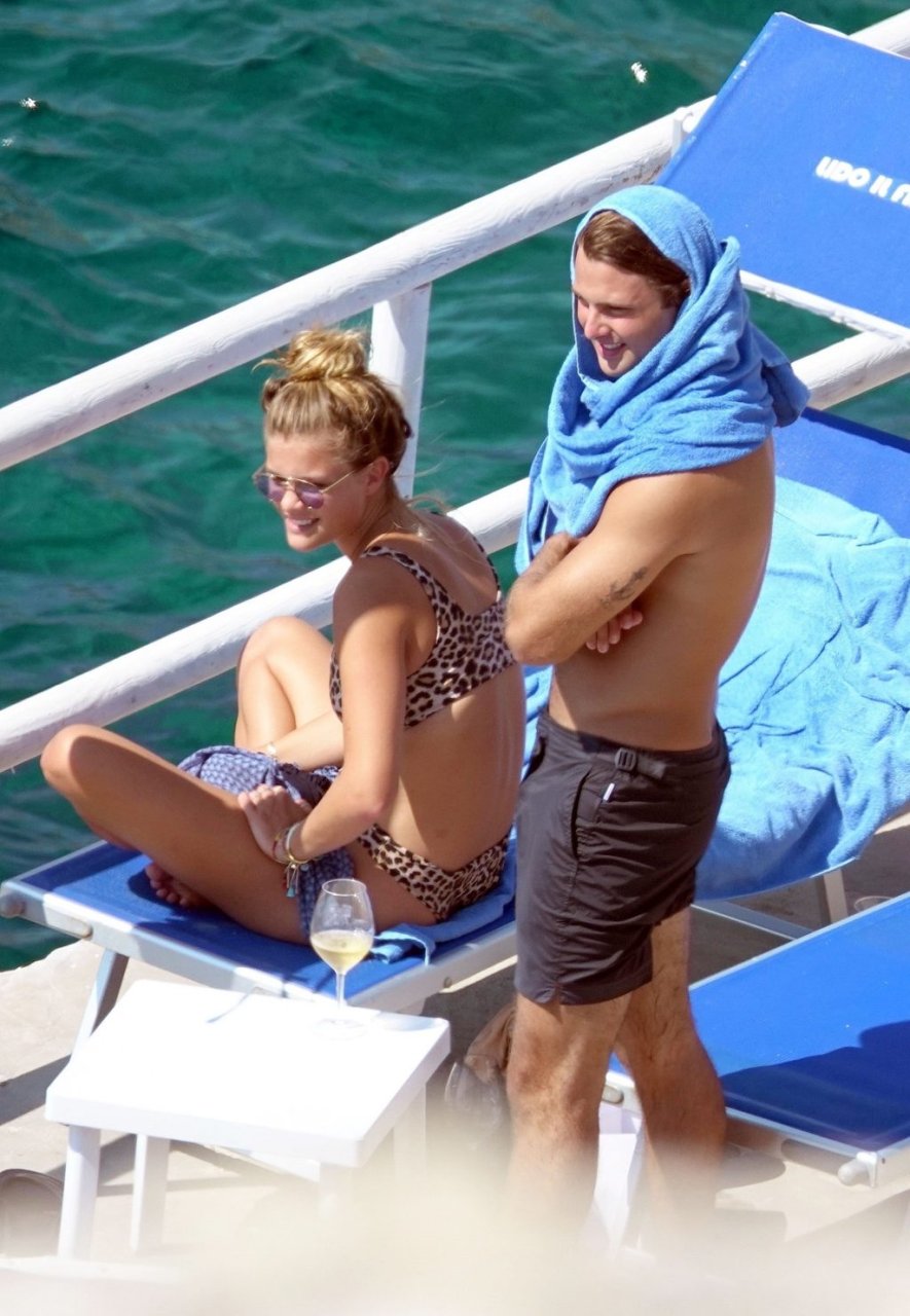 Le mannequin danois Nina Agdal (26 ans) et son petit ami Jack Brinkley-Cook (23 ans) profitent de leurs vacances à Capri, en Italie, le 31/07/2018. Nina portait un bikini imprimé léopard en prenant le soleil et a été photographiée en train d’avoir une séance de démonstration d’affection publique avec Jack. Nina et Jack ont été vus sur les rochers avant de sauter dans la mer pour nager.
