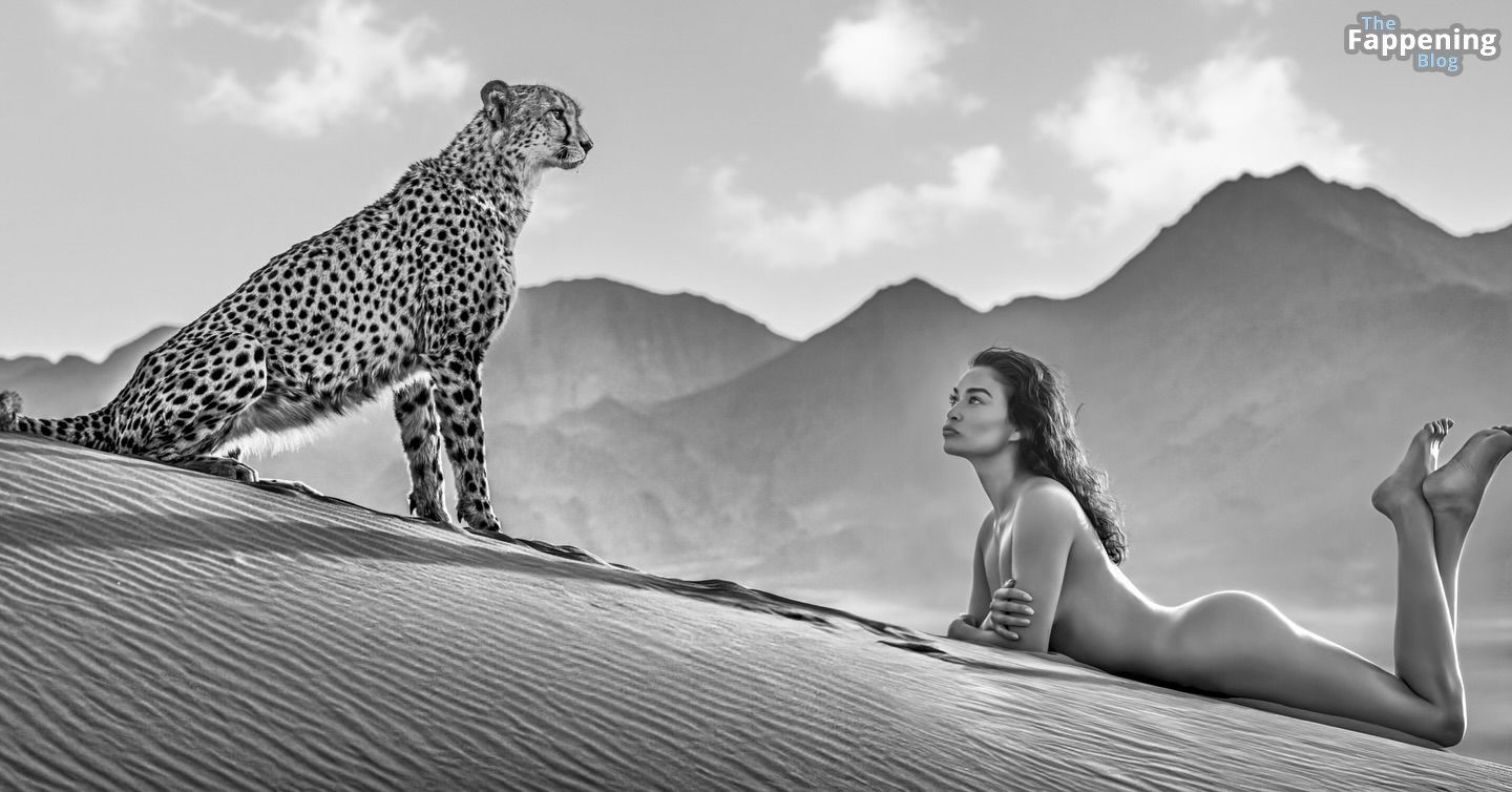 Lors de la dernière séance photo de David Yarrow, Shanina pose entièrement nue dans le désert namibien. À ses côtés, un guépard majestueux la fixe intensément, comme s’il la jaugeait.