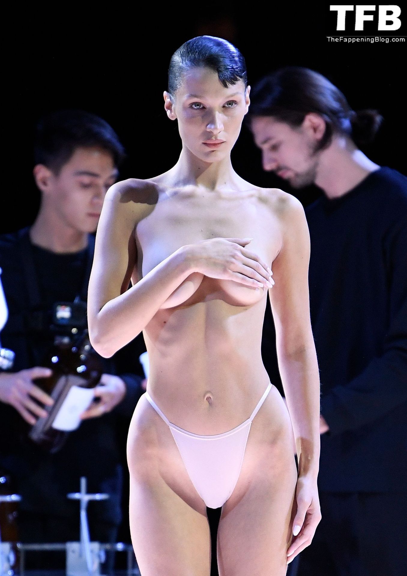 Bella Hadid apparaît au défilé de mode Coperni pendant la Fashion Week de Paris, le 30/09/2022. Le mannequin se fait peindre une robe en spray au milieu du défilé.