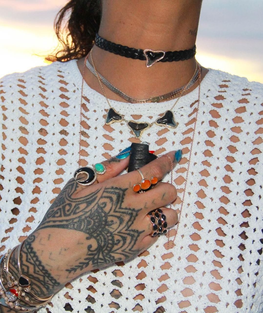 Photo torse nu de Rihanna pour le livre ANTI World Tour (2016). Gros sourcils, lèvres et ongles ! Rihanna est une chanteuse et créatrice de mode américaine. Âge : 28 ans (20 février 1988).