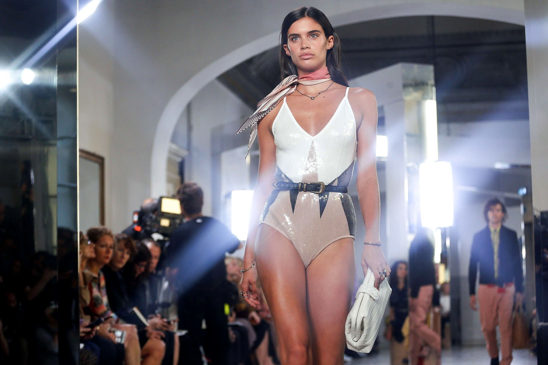La supermodèle Sara Sampaio défile lors du défilé Bottega Veneta Printemps/Été 2018 pendant la Fashion Week de Milan à Milan, le 23/09/2017.
