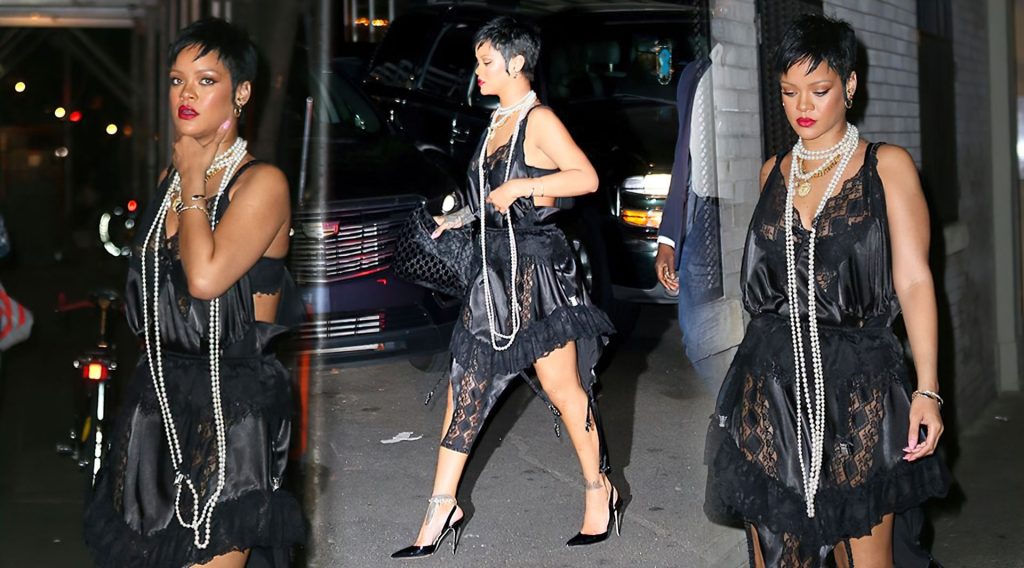 Chanteuse et star de The Fappening Rihanna se rend au dîner au restaurant italien Carbone dans une robe sexy en dentelle noire et des talons – New York, 07/05/2021.