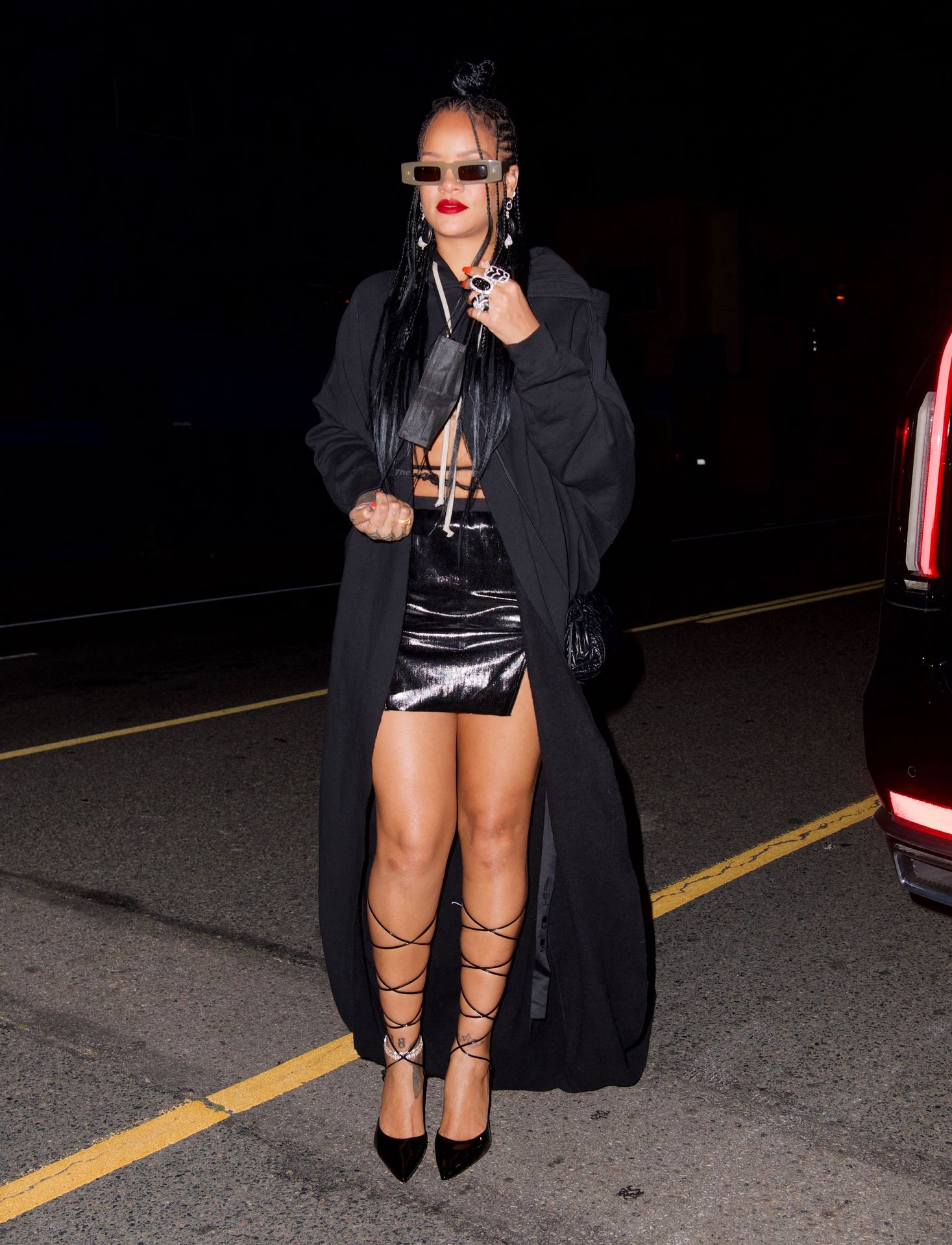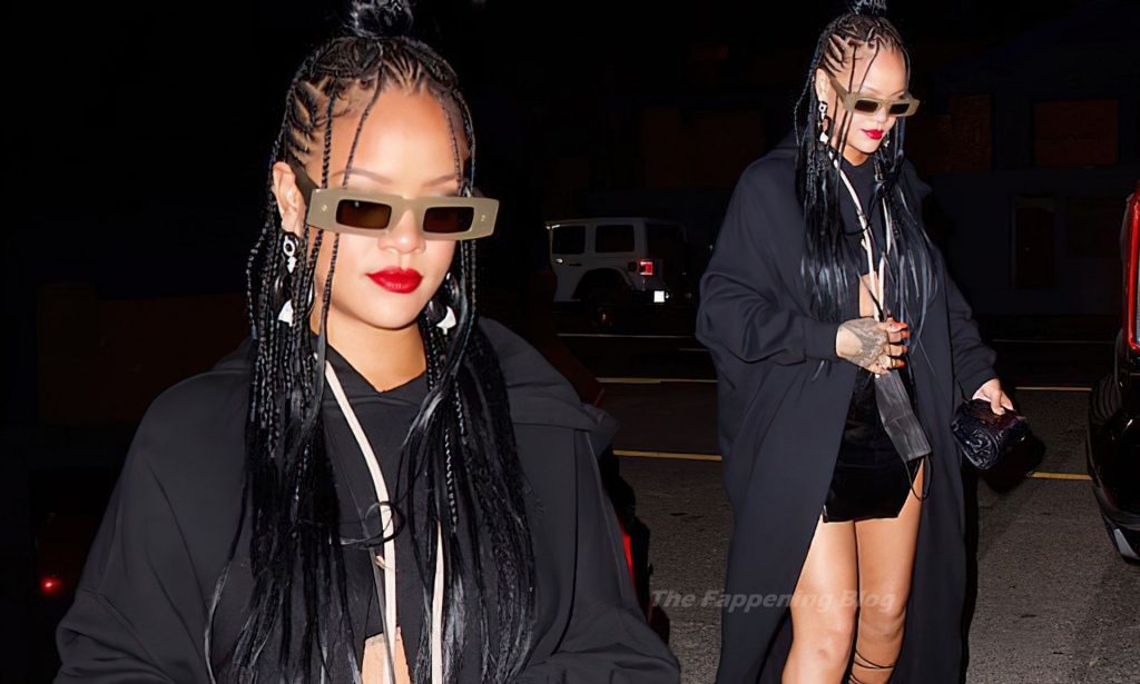 La star barbadienne du Fappening a attiré les regards en exhibant ses longues jambes dans une mini-jupe courte avec un haut révélateur et un long trench-coat noir.